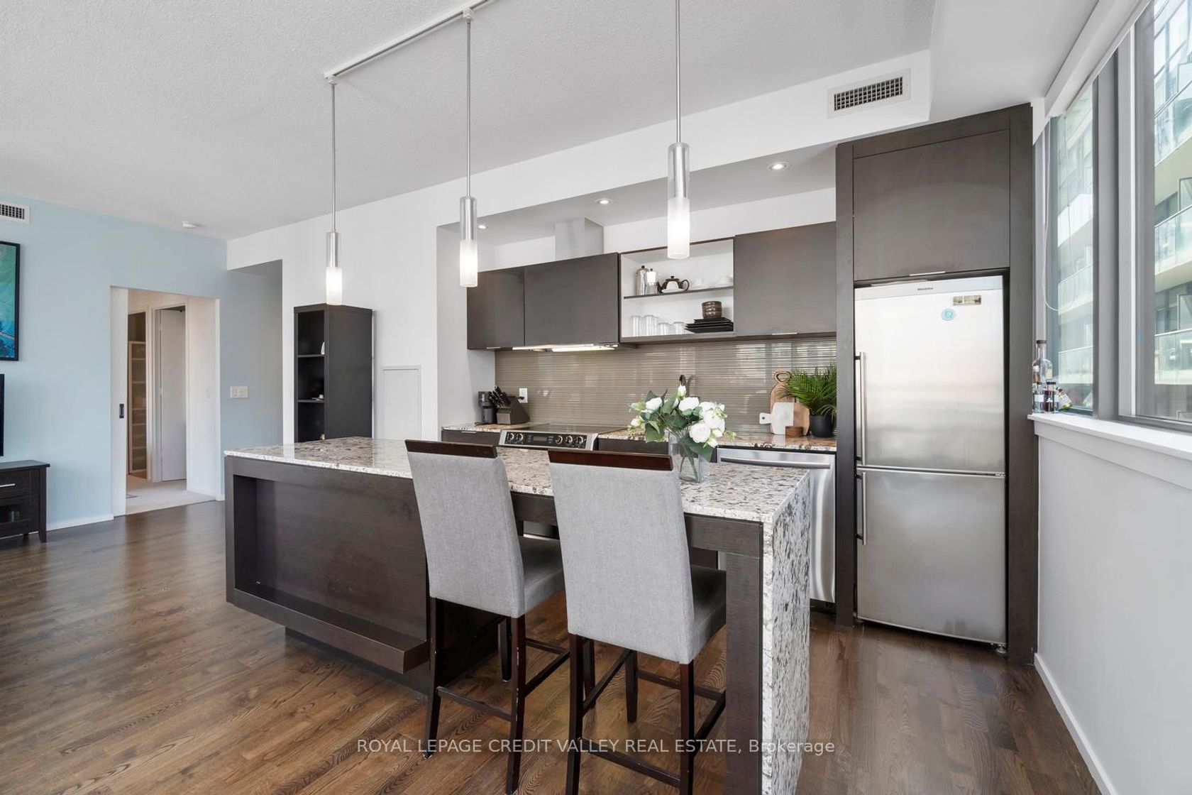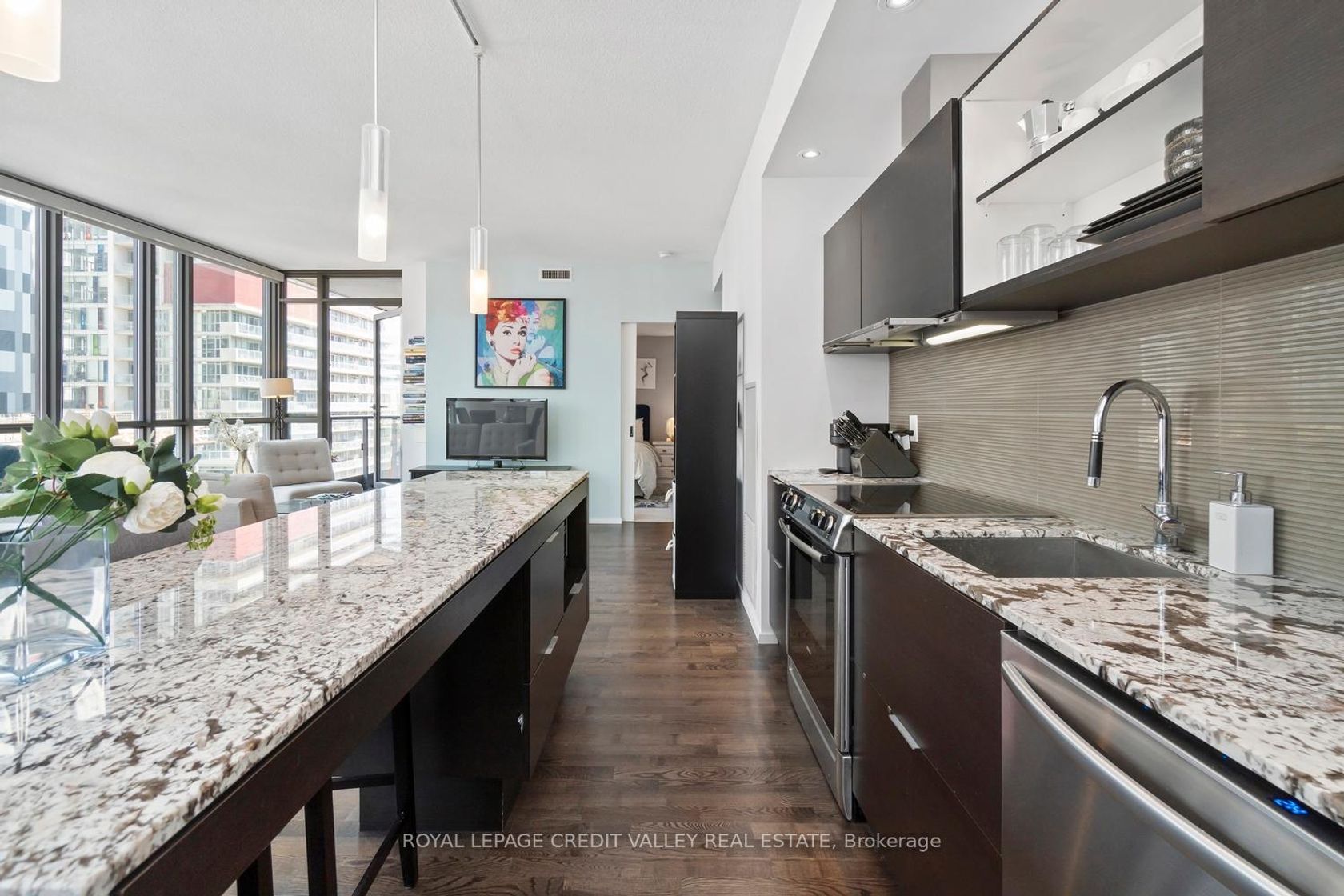 This sun-filled 2 bedroom, 2 washroom 970 sf corner unit at the Charlie is a dream! With its efficient layout, hardwood floors, and floor-to-ceiling windows, it offers a bright and welcoming atmosphere. The granite countertops and stainless steel appliances in the kitchen, along with the kitchen island, provide both style and functionality.The spacious primary bedroom with its ensuite and walk-in closet offers a retreat within the home, while the brand new broadloom in the bedrooms adds a fresh touch. The spacious balcony is perfect for enjoying the views and some fresh air. The building amenities, including the 24-hour concierge, outdoor pool, gym, and guest suites, provide convenience and luxury right at your doorstep. And the location couldn't be better - steps away from public transit, shops, restaurants, entertainment, downtown attractions, parks, and easy access to the highway. It seems like a fantastic opportunity for anyone looking for a modern and convenient urban lifestyle!