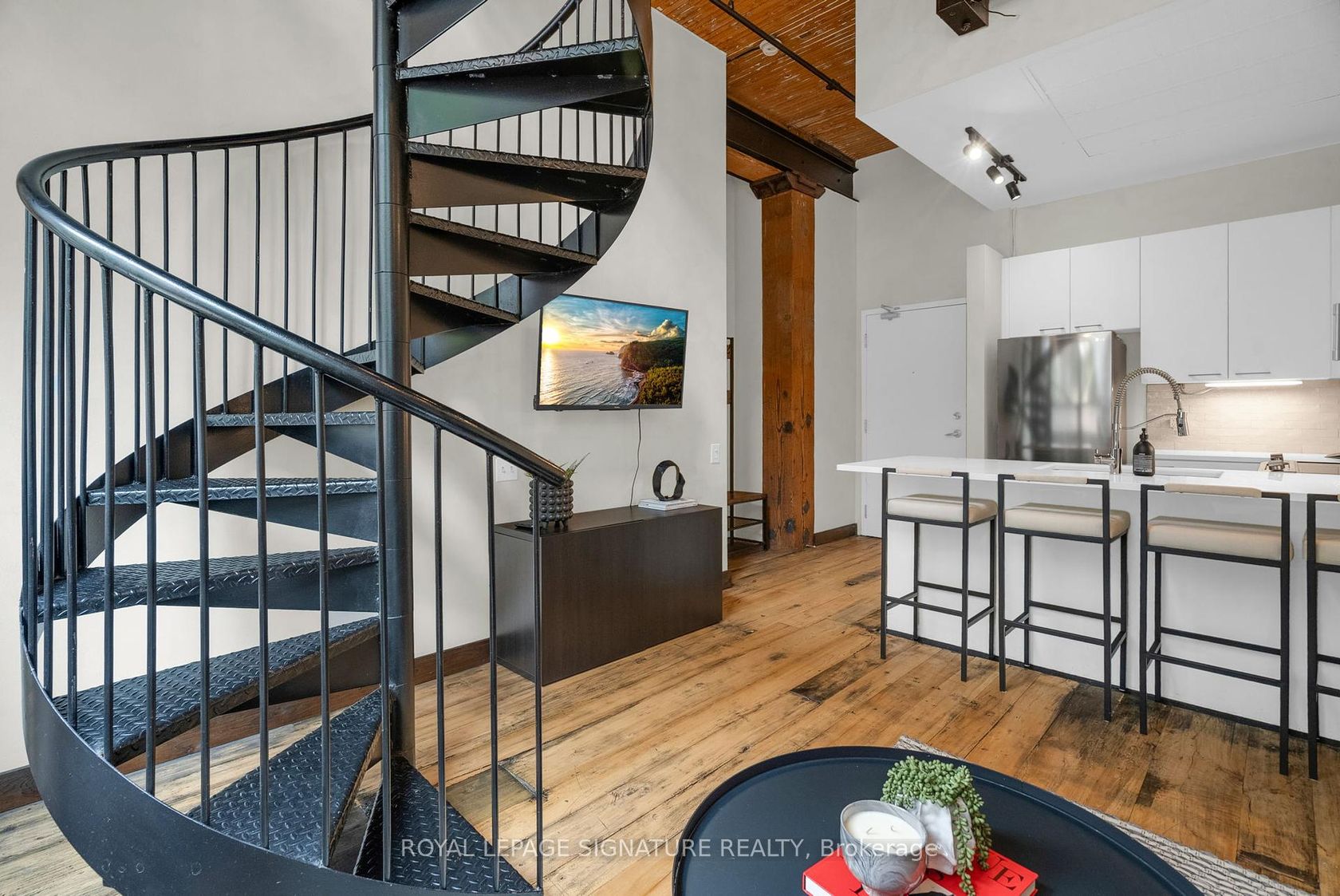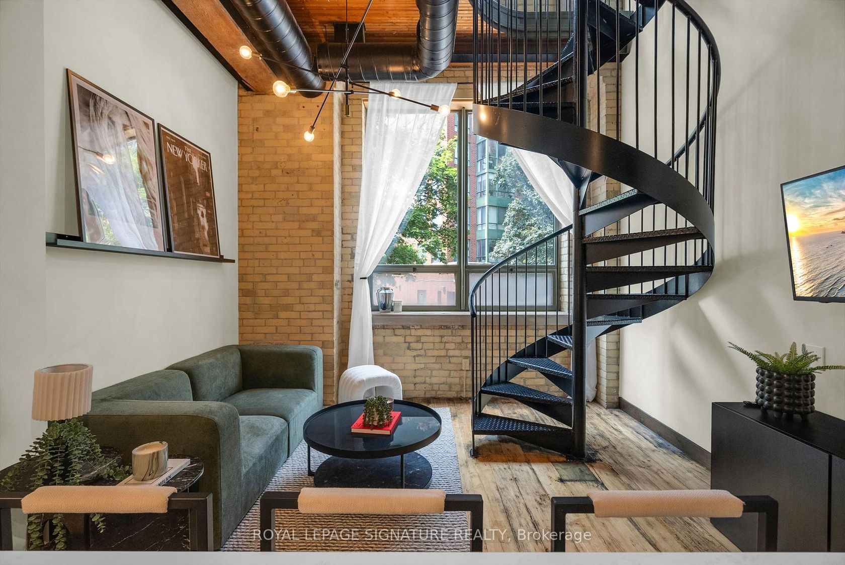 Welcome to Gotham Lofts where heritage charm meets modern design in the heart of King West. This rare 625 sq ft 1-bedroom, 1-bath residence features soaring 11'9" post-and-beam ceilings, exposed century-old brick, and a striking steel spiral staircase that creates a dramatic focal point and stunning lime washed walls. The updated kitchen is equipped with stainless steel appliances and ample storage. Oversized west-facing windows flood the space with natural light, creating an ideal setting for both living and working. This boutique hard loft building offers amenities including a fitness centre, party room, and visitor parking. Located steps from the best of King and Queen West, Trinity Bellwoods Park, and the 504 streetcar, this is a rare opportunity to own a true hard loft in one of Torontos most desirable neighbourhoods. Includes parking and locker.