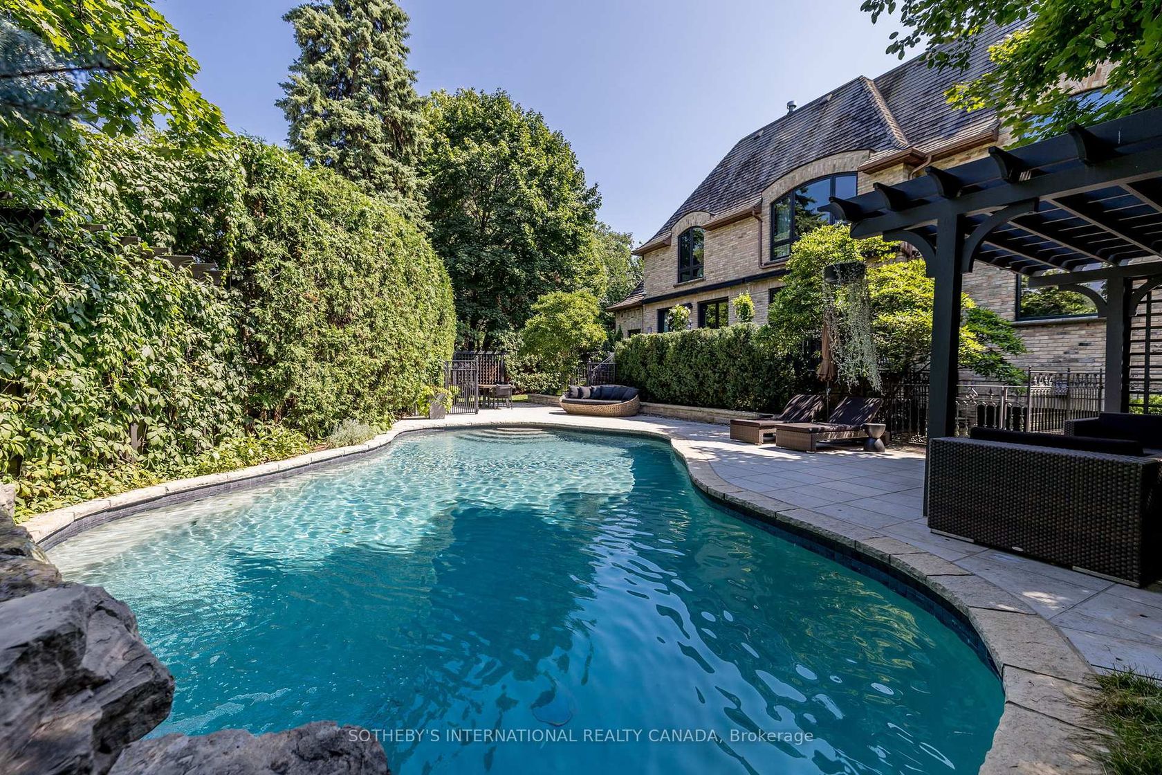 A perfect blend of traditional elegance & modern refinement, this Lawrence Park residence sits on a coveted 82-foot-wide lot, offering exceptional space & privacy in one of Toronto's most sought-after enclaves. Just steps from Toronto French School, Cheltenham Park, and the Granite Club, homes in this exclusive pocket are rarely available. From the moment you arrive, the estate's presence is undeniable. A circular heated driveway, illuminated by landscape lighting, leads to a 3-car garage with built-in cabinetry & track lighting. The Indiana stone & reclaimed brick exterior set the tone for the artistry found throughout. Inside, a grand foyer welcomes you, with formal living & dining rooms to the west and a custom mahogany office to the east. Toward the rear, the home opens into an expansive breakfast room, a chef's kitchen with servery, and a spacious family room with a gas fireplace & built-in library - all seamlessly connected to the backyard oasis. Crafted for both relaxation & entertaining, the outdoor space is centered around a heated saltwater pool with a cascading stone waterfall. A custom-built pergola with a gas firepit beneath creates a serene setting, while an in-ground sprinkler system & landscape lighting ensure effortless beauty year-round. Upstairs, 5 generously sized bedrooms each offer large ensuites with radiant in-floor heating, ensuring comfort & privacy for the entire family. The lower level is a standout, featuring a hidden media room behind a custom millwork door. Tailored for an immersive cinematic experience, it includes a wine lounge with bar seating, and a fully soundproofed theatre with premium speakers. Beyond, this level has a rec room, private gym, and a wine cellar with an adjoining tasting room awaiting customization. Two additional bedrooms provide ideal accommodations for guests or in-laws. With extraordinary craftsmanship, and a location second to none, this is a rare chance to own a truly distinguished Lawrence Park residence.