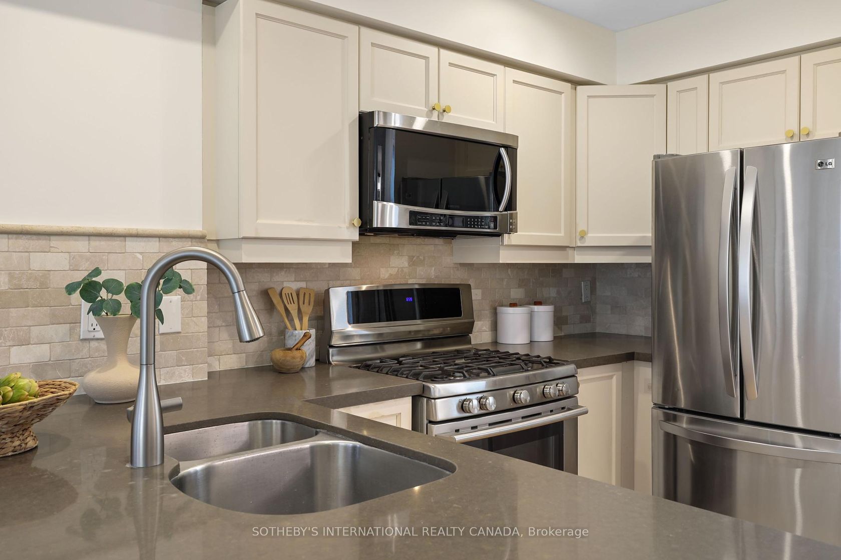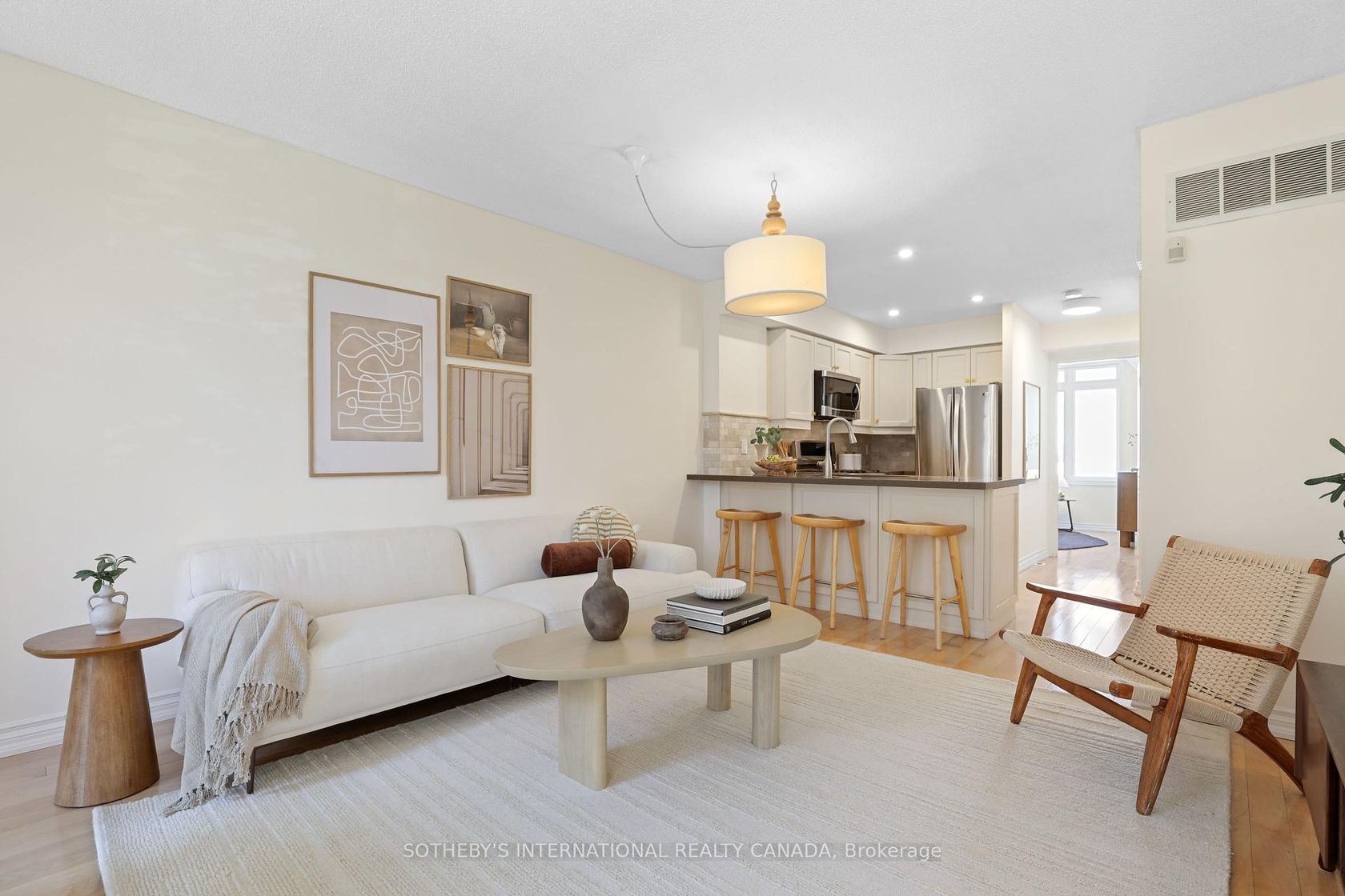 Welcome to suite 1204, a rare two-storey townhome that combines the sophistication of a New York style walk-up with the comfort and convenience of modern King West living. Offering 1,050 square feet of living space, this 2 bed, 2-bath home delivers both functionality and timeless design.The west-facing family room is a showstopper, bathed in natural light through dramatic floor-to-ceiling windows. This airy, sun-drenched space creates an inviting backdrop for both casual evenings and elegant entertaining. The adjoining private eat-in kitchen is beautifully updated, featuring stainless steel appliances, quartz countertops, custom cabinetry, and a chic subway tile backsplash striking the perfect balance between style and durability. Two spacious bedrooms upstairs offer flexibility for a guest room, nursery, or home office, while an updated main-floor 4-piece bathroom adds a touch of spa-like refinement. The finished lower level extends the living space with endless possibilities - a media room, office, or additional bedroom - with direct access to the highly desired private garage. Refined upgrades including laminate floors, fresh paint throughout, and carefully curated finishes elevate the homes contemporary aesthetic. A private front courtyard enhances the sense of arrival, providing a quiet outdoor retreat in the heart of the city. Set within vibrant King West Village, you are steps from Queen West, Liberty Village, the city's trendiest restaurants, and boutique shops, with convenient access to TTC, light rail, and major highways.