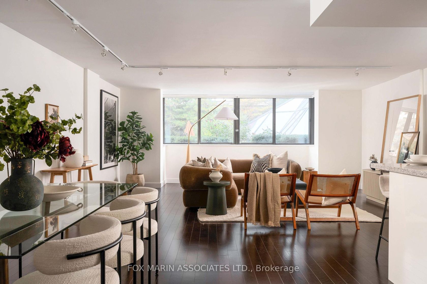 An oversized two-storey residence that feels more brownstone than condo, a home collected, not constructed, with a splash of that Market Square buzz. Walk into a cinematic great room framed by gallery-white walls, moody floors, and light that shifts beautifully from east to west throughout the day. An open-concept main level designed for real life, equal parts hosting & retreating, with defined flow, warm entry moments, and practical storage right where you need it. Windows wrap the spacious living area in courtyard greenery, giving a townhouse-in-the-city feel that makes this double-decker one of only a handful in the complex. A fully reimagined eat-in kitchen finished in glossy white with quartz counters, a mirrored backsplash, and integrated Liebherr, Porter & Charles, AEG, and Miele appliances. Thoughtful lines and symmetry, clean cabinetry, a hidden pantry, and a layout that balances visual restraint with culinary practicality. Included? A dining moment straight out of Azure Magazine with proportions that invite long dinners and lively conversation, easily seats eight & connects effortlessly to the main-level powder room.Retreat to the second floor for a primary suite that welcomes slow mornings; east-facing light, rich hardwood, and a sense of scale that rivals a luxury hotel. A spa-level ensuite that embraces simplicity with confidence: frameless glass, neutral tiling, and subtle contrasts between warm and cool tones, topped with a spacious walk-in closet with floor-to-ceiling built-ins.Down the hall, your generous second bedroom is topped with its own private ensuite, perfect for guests, teens, or a sophisticated in-home office. Bonuses include a dedicated upper-level laundry room, ensuite storage, and separation of space, making day-to-day living refreshingly easier. This is full-service living with a 24-hour concierge, rooftop pool, gym, sauna, squash courts, and landscaped terrace overlooking the best neighbourhood in the city.