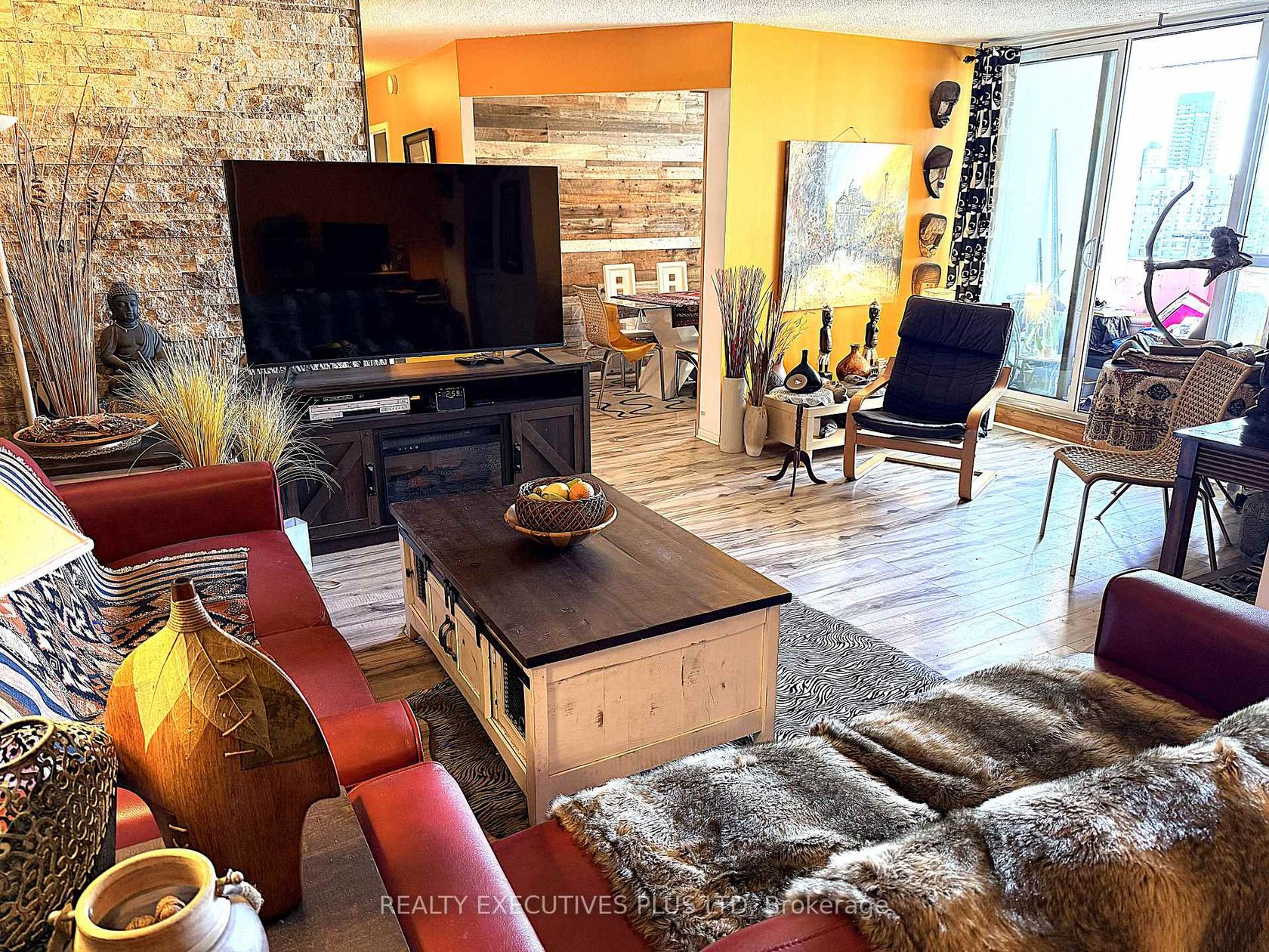 Bright & spacious, sunny South West facing unit, carpet-free, new luxury Plank/Laminate flooring throughout and horizontally layered Old-Barn wood walls' in Living room, family room and Primary bedroom. Updated kitchen cabinets w/new Stove and D/w & 4pc bathroom cabinets. 3rd Bdrm open concept used as Den/Dining Rm. Dining Rm Open-Concept used as Living Rm-Sitting Area.
