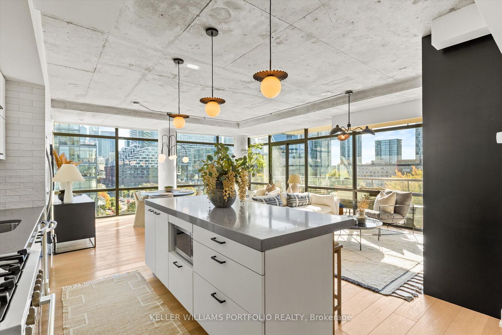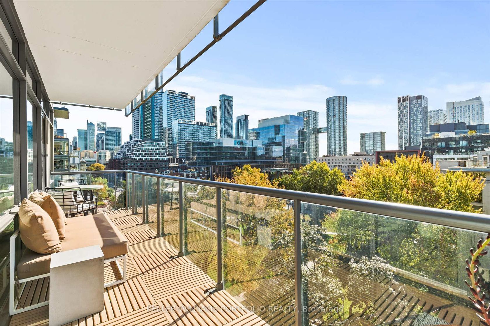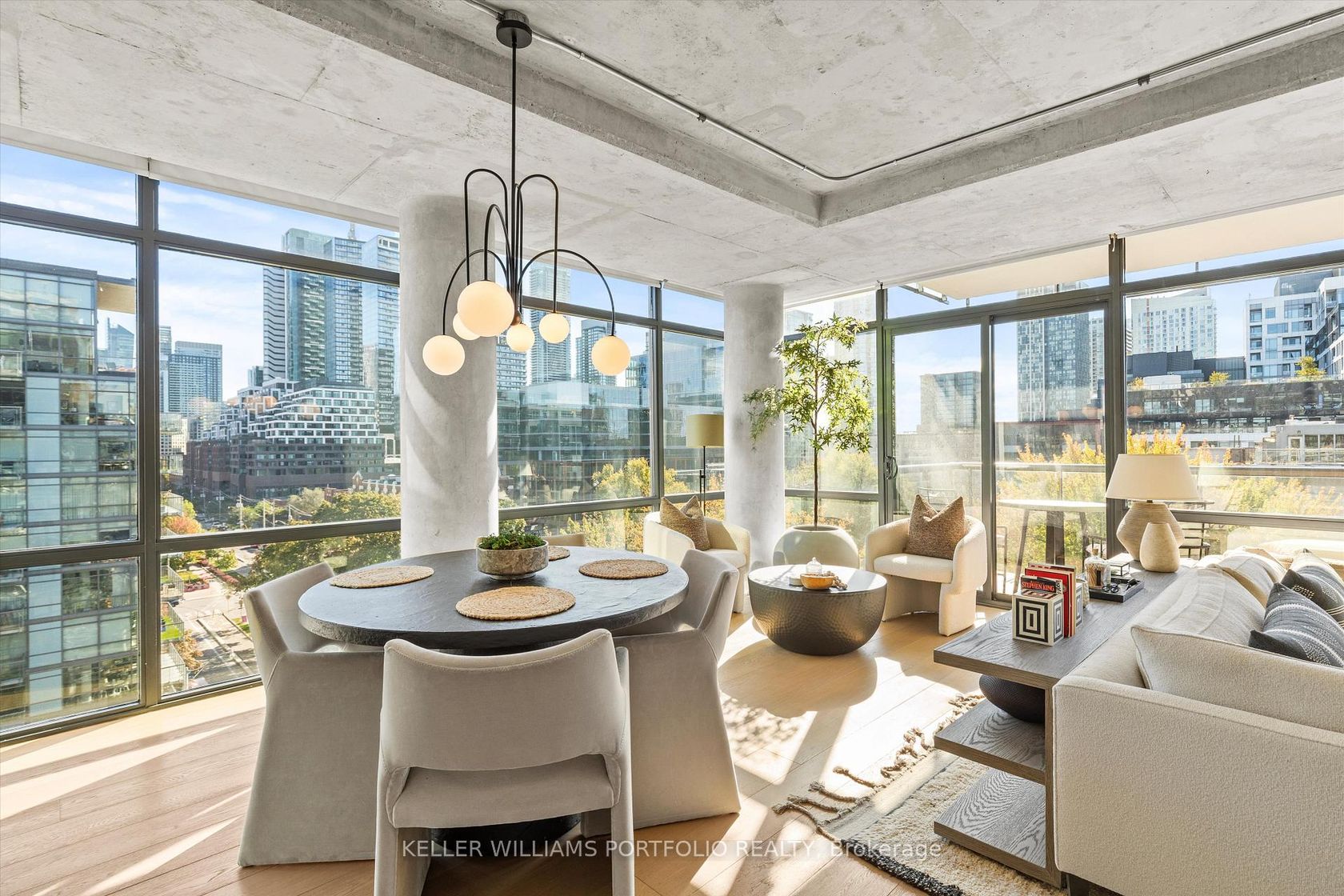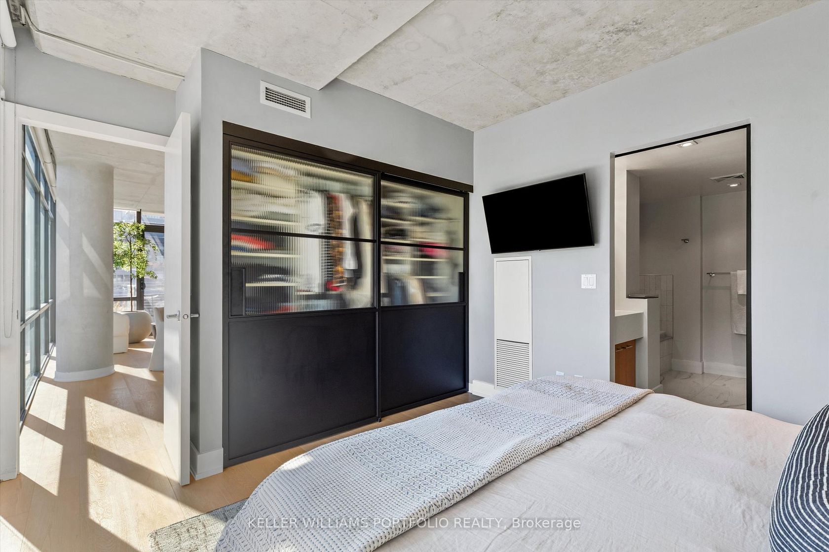 Exceptional Downtown Living In Toronto's Most Coveted King West Address! This spectacular 1042 square foot southeast corner residence has been thoughtfully reimagined from a two-bedroom layout into an expansive one-bedroom sanctuary with two luxurious bathrooms. Bathed in natural light from its prized southern exposure, this recently renovated suite showcases modern sophistication throughout. The open-concept living and dining area flows effortlessly onto a balcony featuring a convenient dramatic views of the skylineideal for al fresco entertaining. The sleek contemporary kitchen boasts premium appliances, abundant storage, and a generous center island with breakfast bar. Your private bedroom retreat offers a peaceful escape with direct access to a second exclusive balcony and adjacent spa-inspired bathroom featuring high-end finishes. The intelligent conversion creates an incredibly spacious layout perfect for those seeking luxury without compromise. This corner gem places you steps from King West's acclaimed nightlife scene, The Well, Entertainment District, and Downtown Core. Enjoy world-class 1Hotel amenities including state-of-the-art fitness facilities,rooftop bar and stunning rooftop infinity poolall accessible directly from your building. Don't miss this extraordinary opportunity to own a perfectly positioned urban oasis!