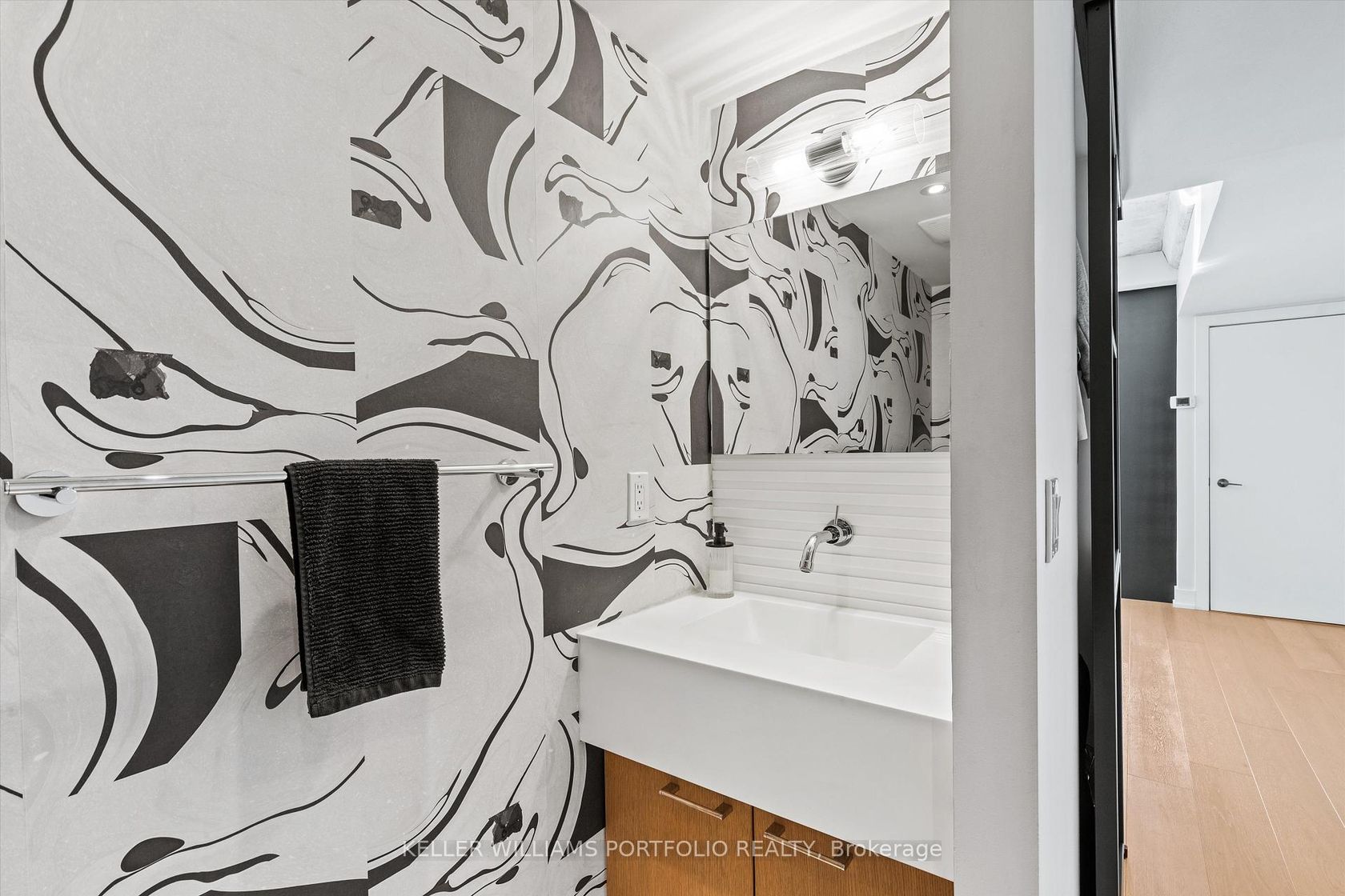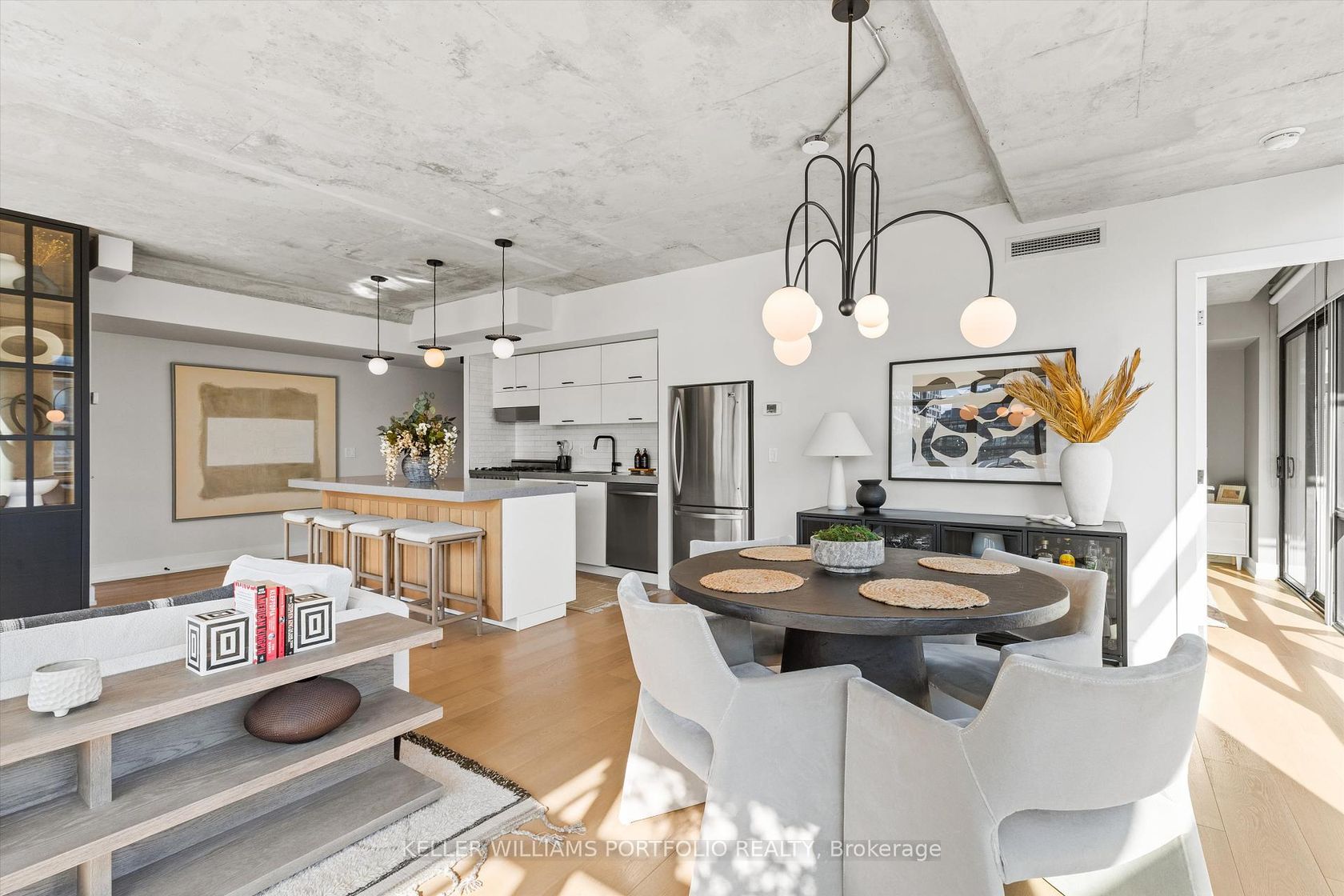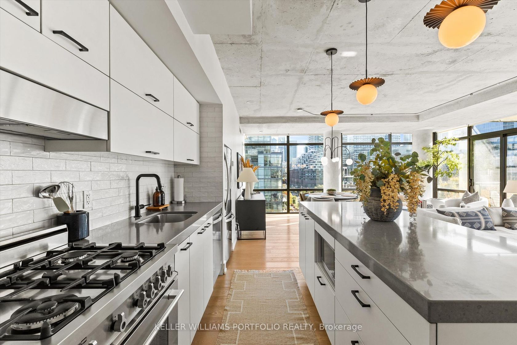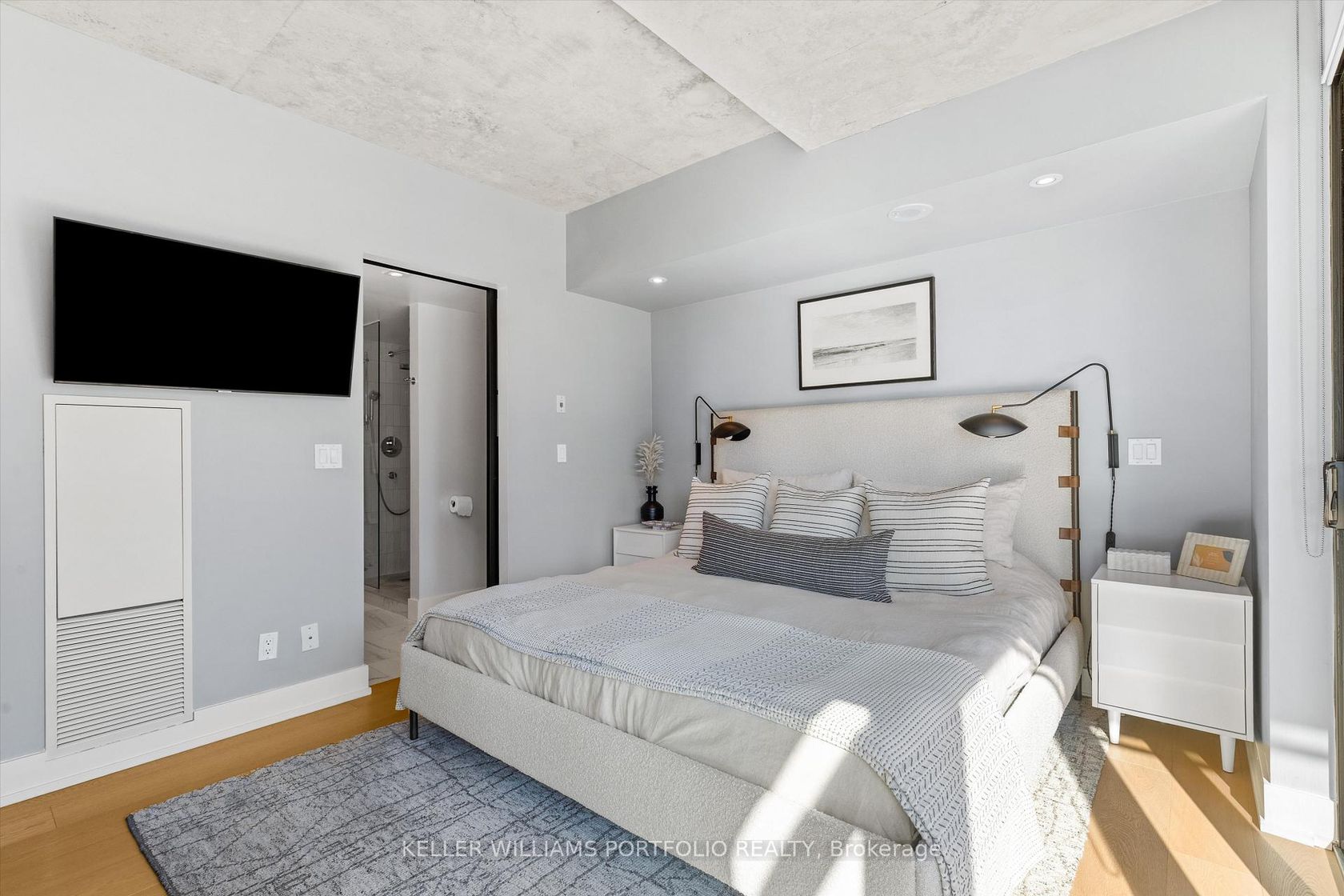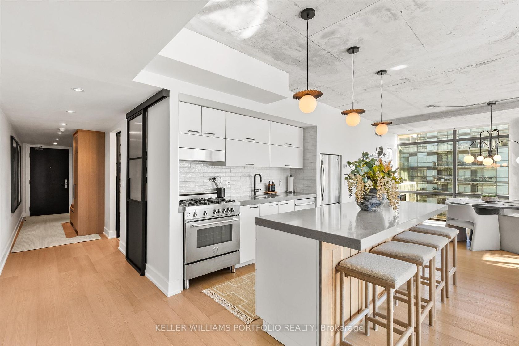 Exceptional Downtown Living In Toronto's Most Coveted King West Address! This spectacular 1042 square foot southeast corner residence has been thoughtfully reimagined from a two-bedroom layout into an expansive one-bedroom sanctuary with two luxurious bathrooms. Bathed in natural light from its prized southern exposure, this recently renovated suite showcases modern sophistication throughout. The open-concept living and dining area flows effortlessly onto a balcony featuring a convenient dramatic views of the skylineideal for al fresco entertaining. The sleek contemporary kitchen boasts premium appliances, abundant storage, and a generous center island with breakfast bar. Your private bedroom retreat offers a peaceful escape with direct access to a second exclusive balcony and adjacent spa-inspired bathroom featuring high-end finishes. The intelligent conversion creates an incredibly spacious layout perfect for those seeking luxury without compromise. This corner gem places you steps from King West's acclaimed nightlife scene, The Well, Entertainment District, and Downtown Core. Enjoy world-class 1Hotel amenities including state-of-the-art fitness facilities,rooftop bar and stunning rooftop infinity poolall accessible directly from your building. Don't miss this extraordinary opportunity to own a perfectly positioned urban oasis!