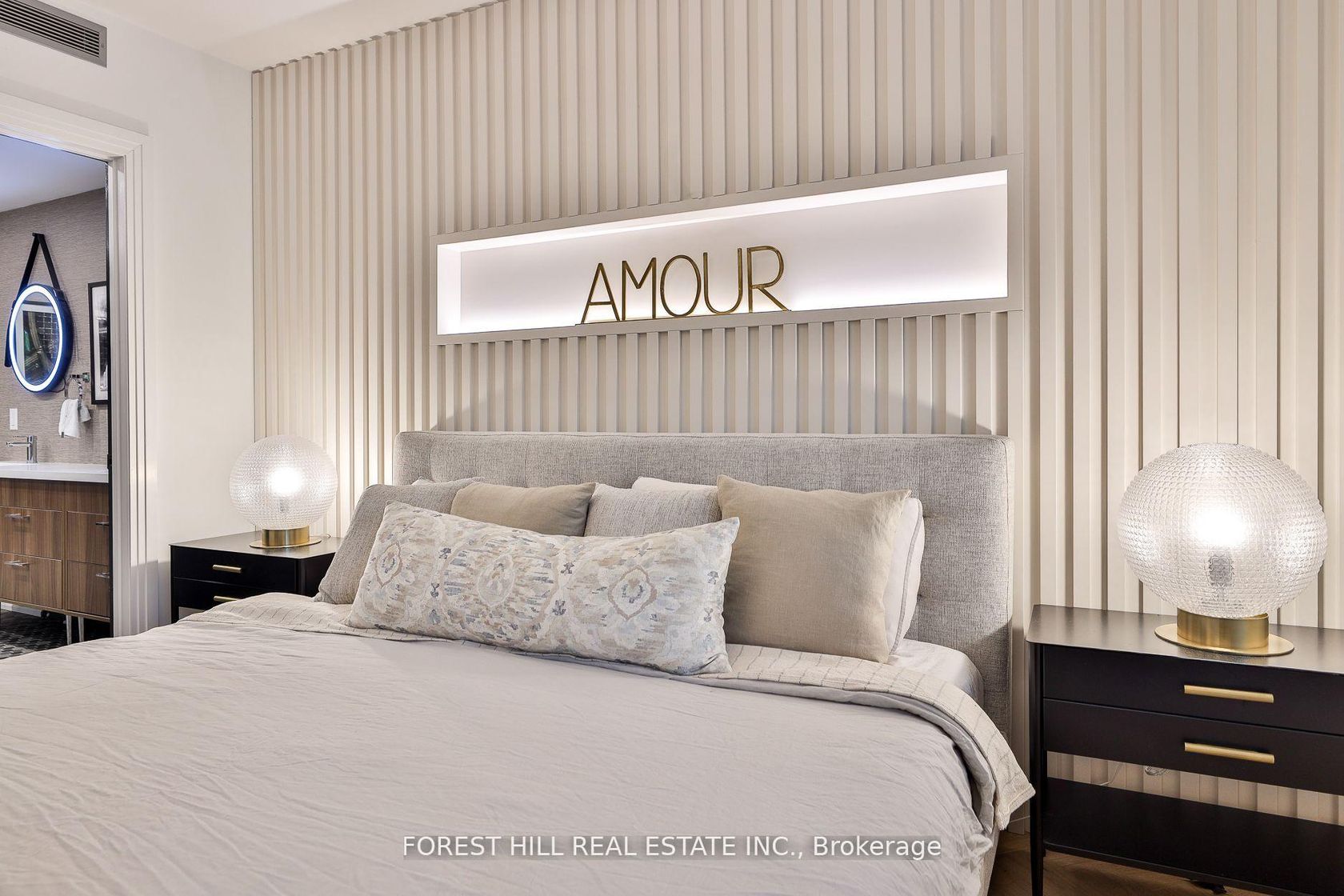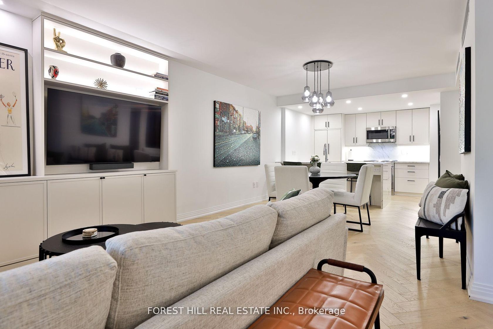Sophisticated and serene main-level suite in the emblamatic Benvenuto. This beautifully redesigned 1-bedroom plus den residence offers 956 sq. ft. of refined living, with no need for elevators simply valet your car & walk right in from the main floor for ultimate ease and privacy. Thoughtfully renovated to enhance functionality and flow, the kitchen has been expanded and features a large island, marble countertops, and a clean, modern layout ideal for entertaining. Wide-plank white oak herringbone flooring runs throughout the space, adding timeless elegance. The spa-inspired bathroom is generously sized, with striking hexagon tile, a seamless glass shower equipped with full body jets and a rain shower head, plus a large double-sink vanity with excellent storage. The bedroom includes custom wall panelling, a smartly designed walk-in closet and semi-ensuite access to the bath. A separate den, accessible through sliding doors, offers a flexible space for a home office or reading nook. West-facing exposure brings in soft afternoon light, complementing features like the custom built-ins throughout, custom built ins in the living room and den w/lighting, and remote controlled blinds. Enjoy the comfort and security of valet parking and the prestige of living in a mid-century architectural gem also home to the celebrated Scaramouche Restaurant. An ideal choice for those looking to downsize in style or enjoy a turnkey pied-a-terre with unmatched convenience.