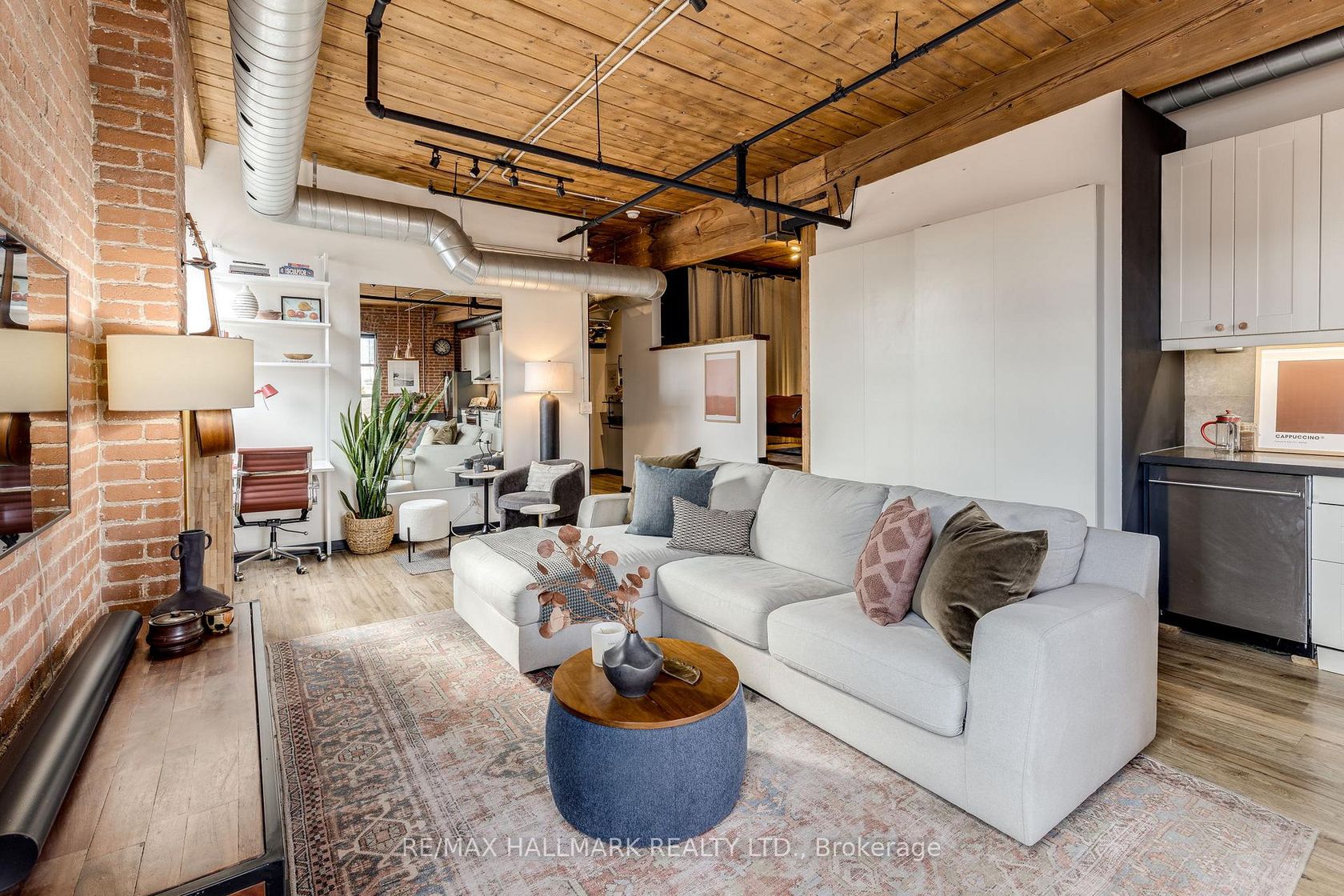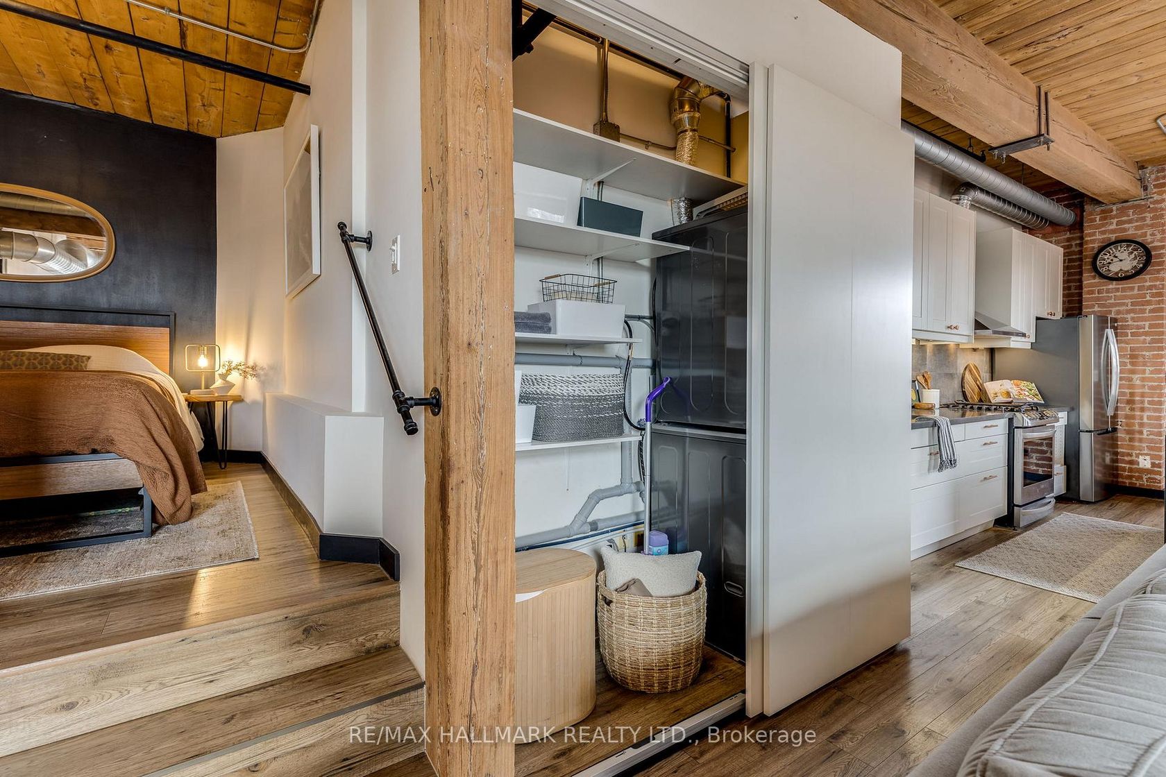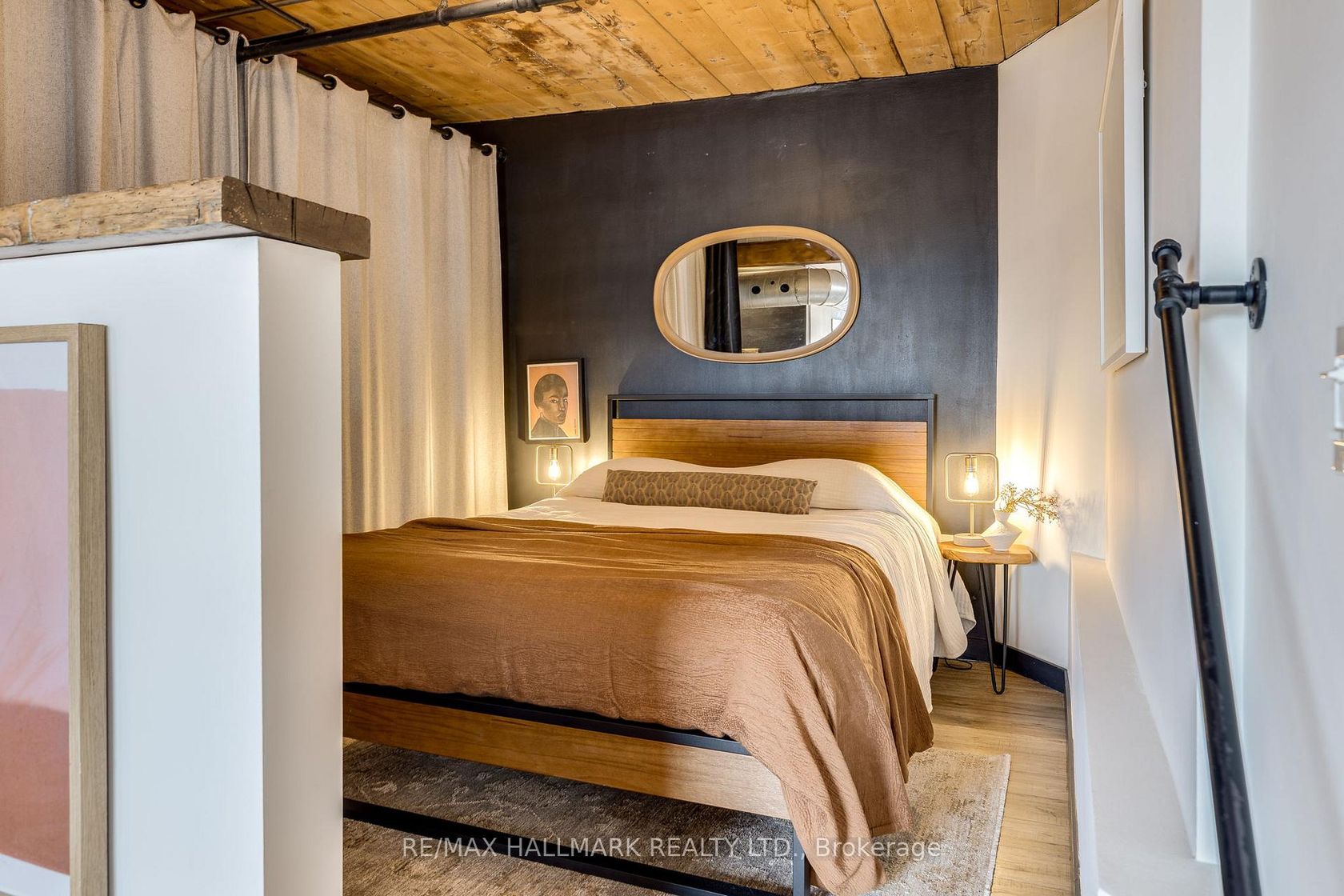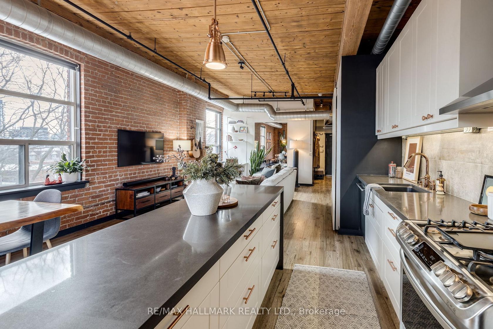 Welcome to the Knitting Mill Lofts - a rare penthouse corner residence in a true hard loft conversion. Suite 406 is one-of-a-kind: fully renovated throughout with designer finishes, and as a top-floor, corner unit, it offers multiple exposures and exceptional natural light - a rarity in authentic loft living. Inside, soaring 10.5' ceilings, exposed brick, original beams, and oversized windows define the space. The interior is fully renovated throughout, balancing industrial character with clean, modern finishes. The custom kitchen features a large island, quartz countertops, ample storage, and striking copper fixtures, while the reimagined bathroom - complete with a reclaimed wood vanity - perfectly blends modern design with authentic loft character. The layout of this unit is also unique - an open-concept design that feels both functional and intentional, with a cleverly designed raised bedroom area (complete with built-in storage below), a large custom closet, and blackout curtains for added privacy. Ideal for entertaining, everyday living, or working from home. Low monthly fees make for easy, low-maintenance living, with convenient elevator access from Sackville Street. Set along Queen Street East, you're steps to Corktown, St. Lawrence Market, the Financial District, and some of the city's best cafés, restaurants, parks, and trails. The 501 streetcar is at your doorstep, with the future Ontario Line nearby.