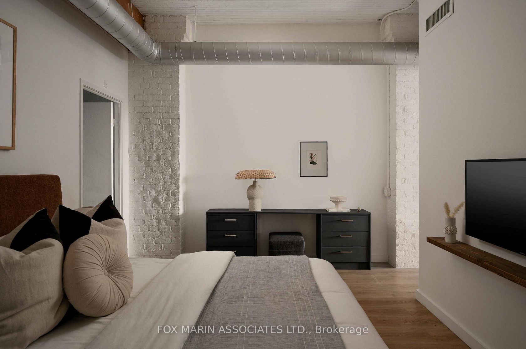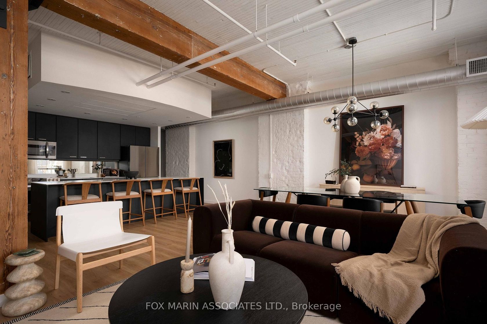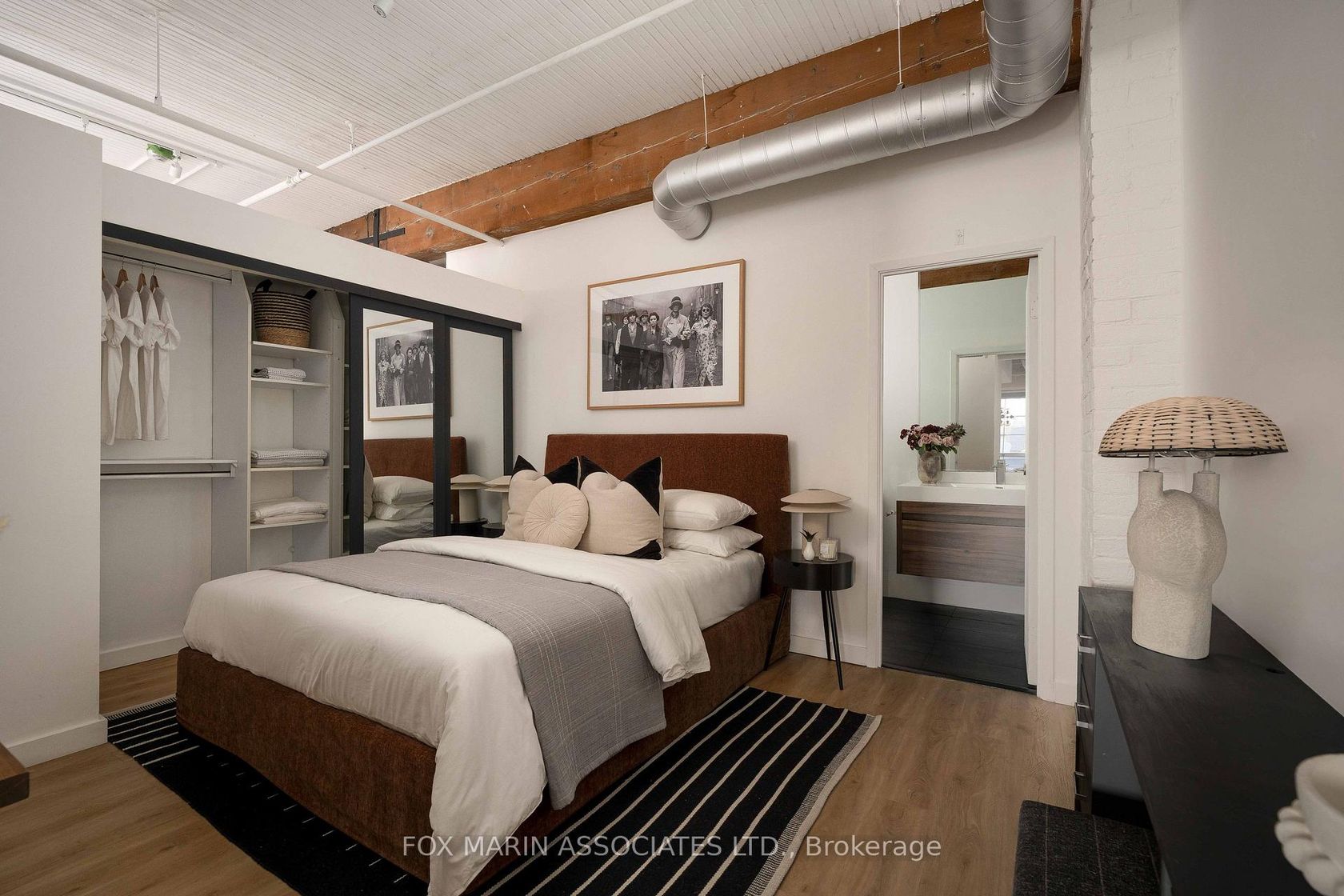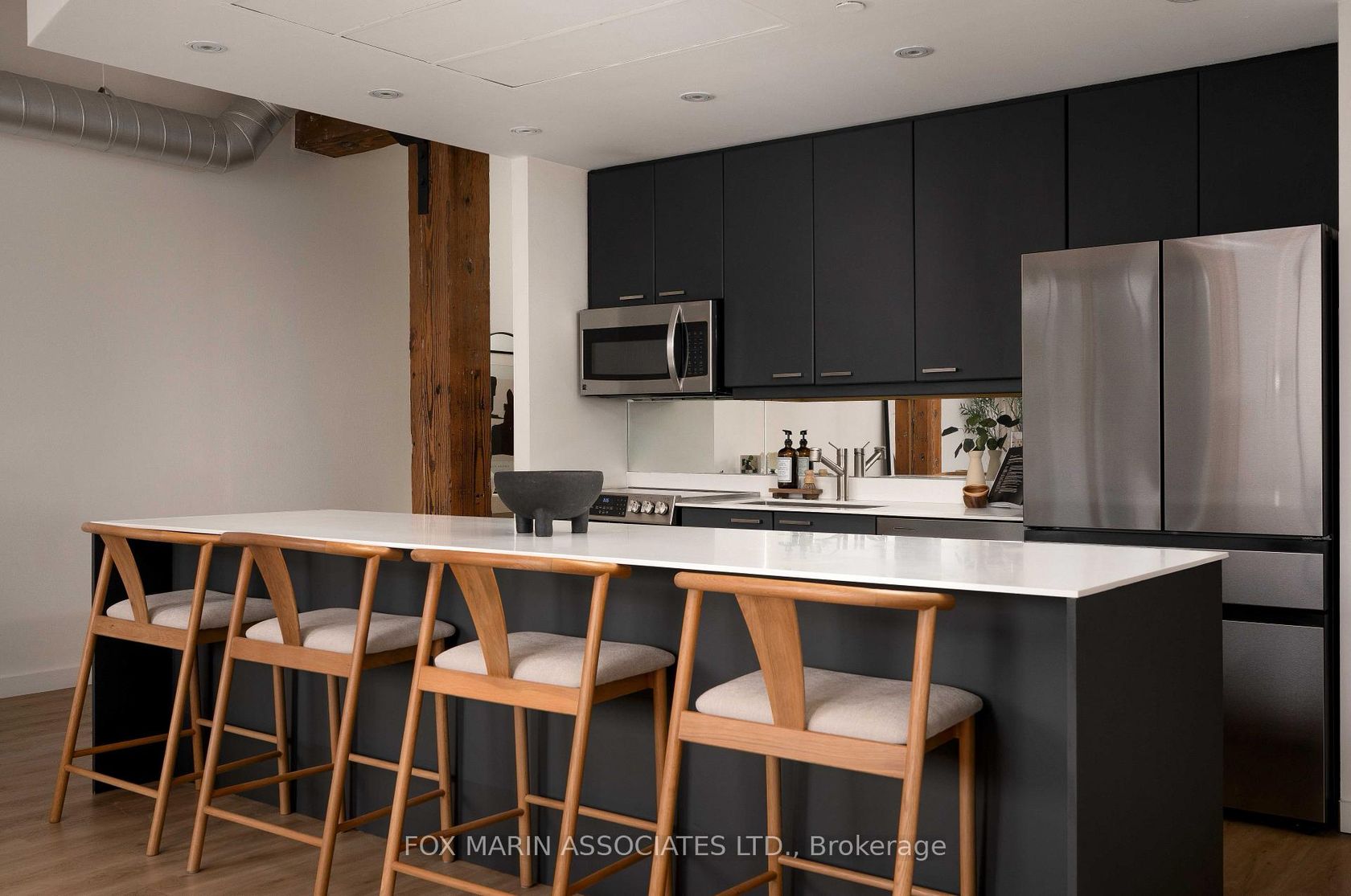 A classic original with a moodier modern edge. Built in 1917 and packed full of integrity, the Gotham Vintage Lofts is the kind of building design & architecture enthusiasts simply wait for. Only 54 lofts in total. No two are exactly the same. Real spaces with real bones. And this third-floor lover stretches over 1,050 square feet of air and open volume. Ten-foot ceilings overhead. Exposed brick and beam. Ductwork. And conduit. Long, uninterrupted sight lines from left to right. Wide, balanced, and perfectly proportioned. Industrial in all the right ways with enviable hardwood plank floors, white painted brick and warehouse windows dressed from top to bottom. Original materials left exactly as they should be. Authenticity never goes out of style, my friends. With an easy Northern exposure and steady natural light throughout the day, the space is soft and soulful from morning to night. The kitchen is striking, anchoring the space while making entertaining easy with streamlined cabinetry, smart storage, and bar seating that keeps conversation flowing without interrupting. The bedroom is tucked away at the back, creating separation, with a full ensuite, built-in closets, and the option to choose your television program without chirping (from you-know-who)! Bathrooms follow the same design language: simple, clean, and well considered. Stone counters, neutral tiles, and crisp lines that balance function with a touch of quiet style. Underground parking and storage are included, and a location that does the rest while also being quietly removed from the hustle to the East of Bathurst. Walkable streets, easy transit, and Stanley Park are just moments away. Not manufactured. Not overdone. Just a timeless Toronto loft doing exactly what it was built to do (and lovin' you back just the same & more).