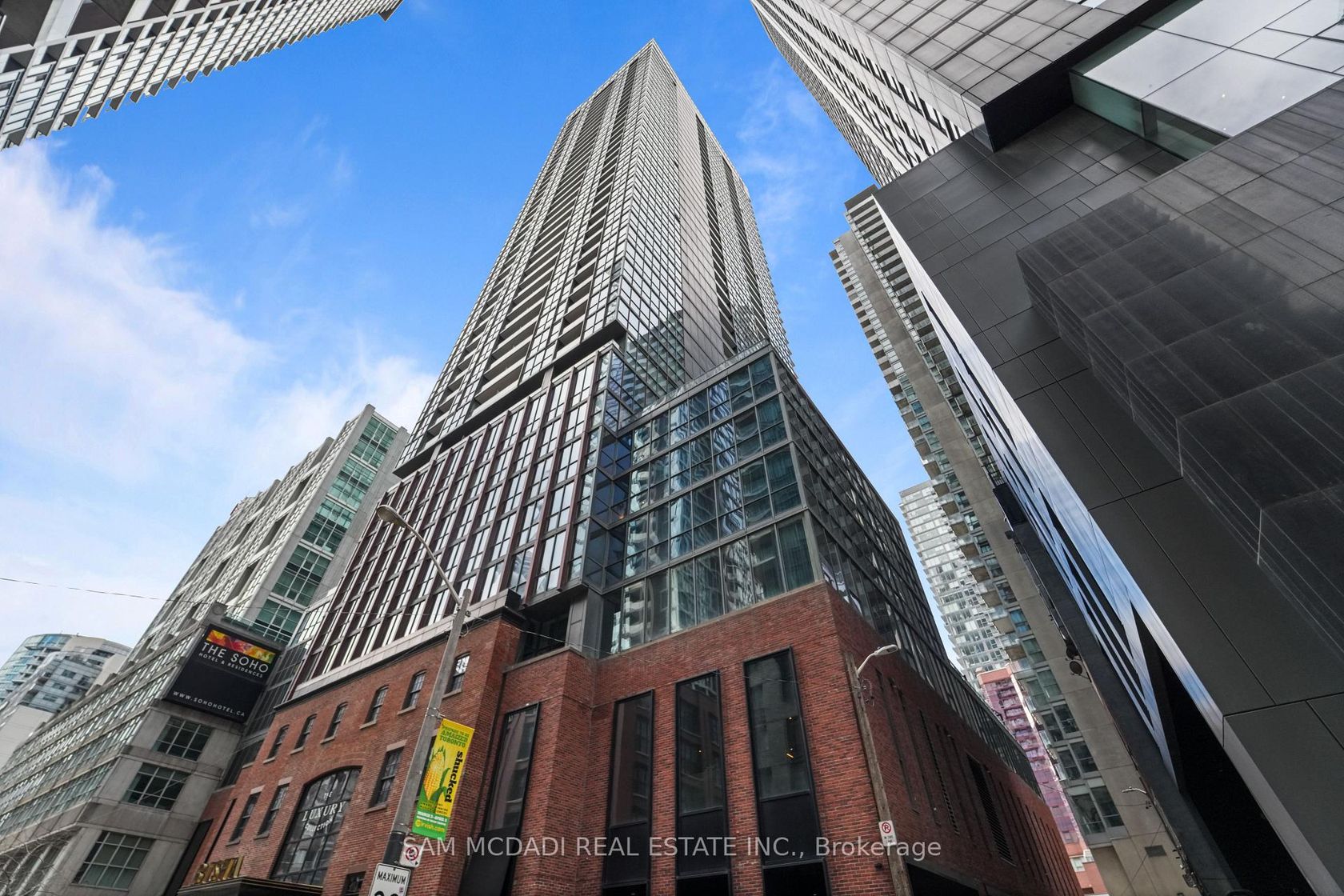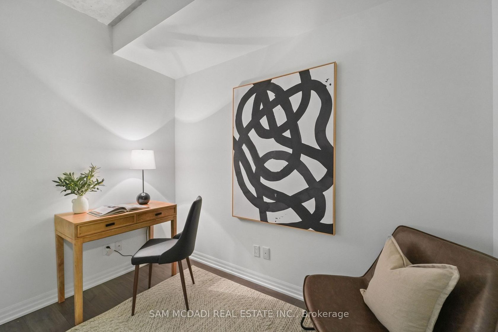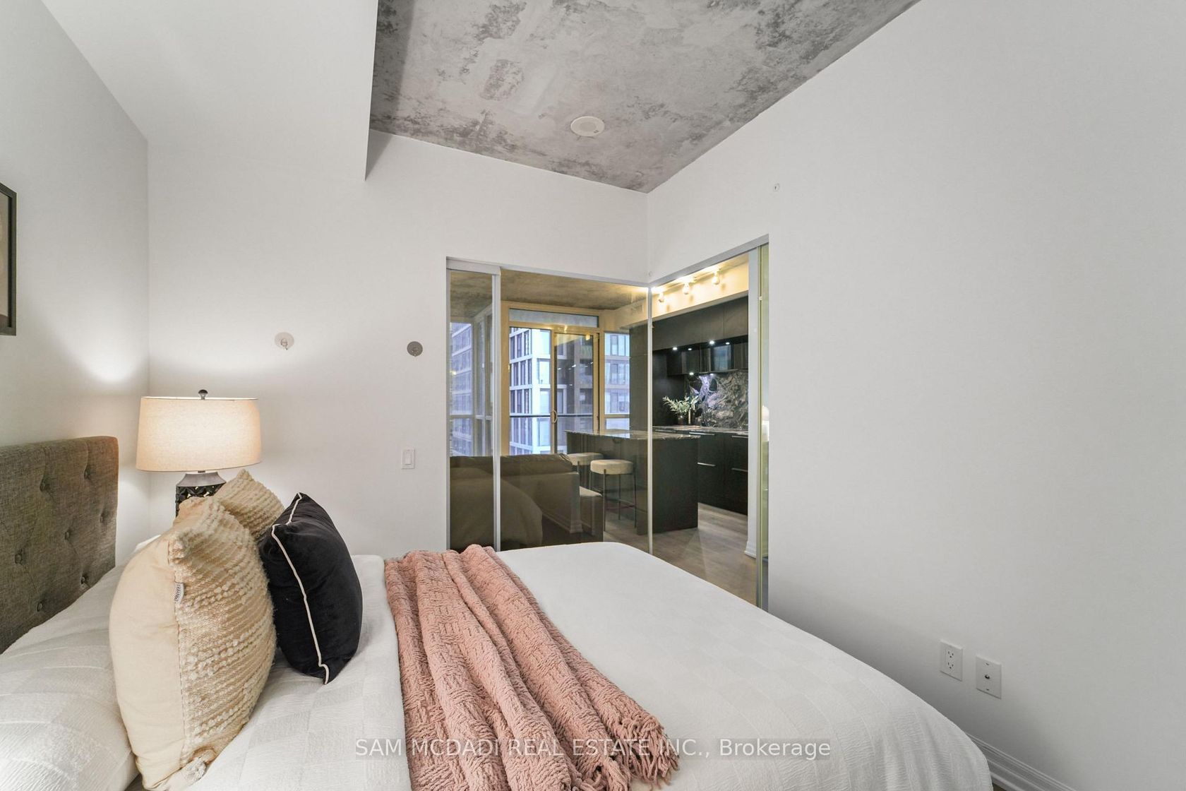 At the iconic Bisha Hotel & Residences, this beautifully designed 662 SF suite offers a rare convergence of world-class design and hotel-grade luxury, right in the heart of Toronto's Entertainment District. Step inside to a welcoming space that opens to a striking glass-enclosed den, an ideal home office or creative workspace. The hallway leads into an open-concept living space where exposed concrete ceilings, hardwood floors, and floor-to-ceiling windows create a modern, loft-inspired aesthetic. The sleek designer kitchen, crafted with interiors by Studio Munge and Kravitz Design Inc., features bold quartz countertops, a centre island, a custom marble backsplash, integrated stainless steel appliances, and generous prep space that flows naturally into the living and dining area, making it perfect for entertaining or casual dining. Beyond the living space, sliding doors lead to a private balcony overlooking the vibrant downtown skyline and the CN Tower. The thoughtfully separated bedroom provides a quiet retreat with ample storage, and convenient access to an updated 4 piece bath. Residents enjoy access to full-service amenities including a rooftop infinity pool, a state-of-the-art fitness centre, a billiards room, a party lounge, and 24-hour concierge service and more. Enjoy on-site fine dining option, including the acclaimed Akira Back and KOST, one of the city's most coveted rooftop destinations. Located steps from Rogers Centre, Scotiabank Arena, the underground PATH, and TIFF Bell Lightbox, this residence places the very best of downtown Toronto at your doorstep.