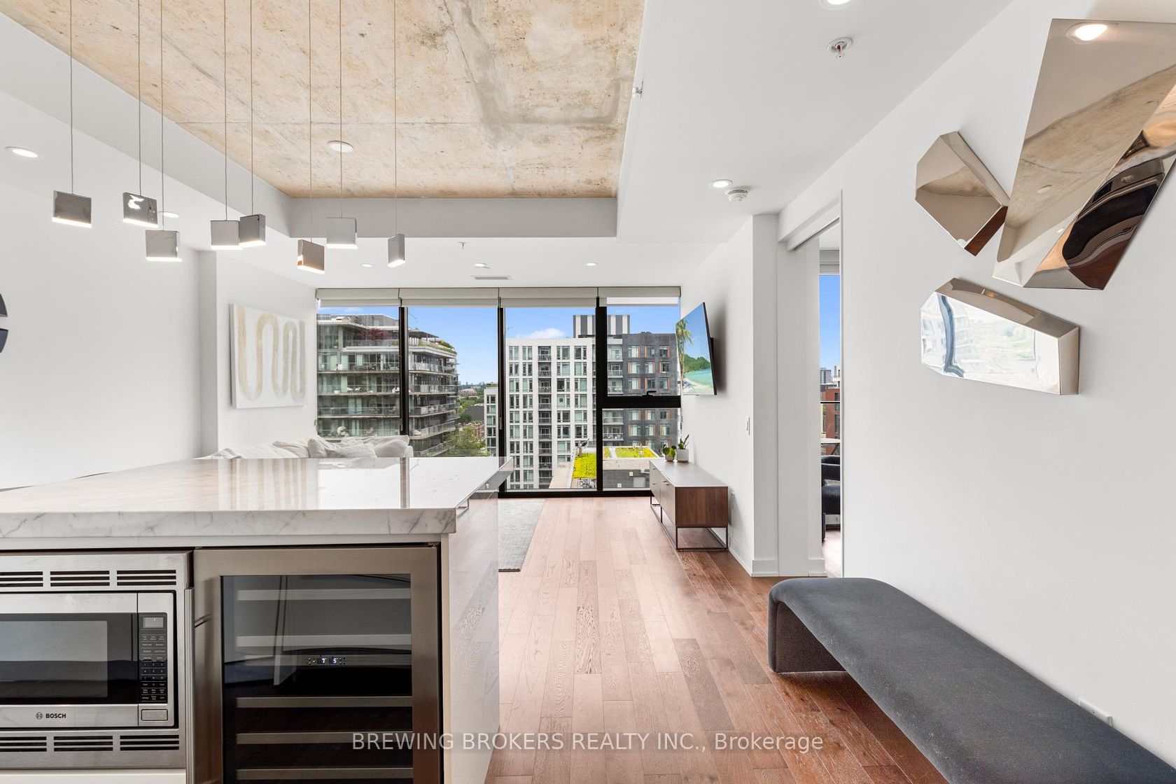 This stunning penthouse suite at 629 King St W offers sophisticated urban living with unmatched views and thoughtful design. Spanning 792 sq. ft. (713 sq. ft. interior + 79 sq. ft. balcony), this one-bedroom, two-bathroom residence features floor-to-ceiling windows that flood the space with natural light from morning to night, showcasing breathtaking northwest views and unforgettable summer sunsets.The open-concept layout is anchored by a modern kitchen complete with full-sized appliances and a generous islandperfect for everyday living or entertaining. The renovated bathrooms include a stylish Muti vanity and LED mirrors, while custom built-ins provide added functionality and flair.Step onto the spacious balcony equipped with a gas BBQ hook-up, and soak in the vibrant energy of King West belowhome to Torontos newest hotspots including Earls, King Taps, and the upcoming Equinox gym and Wholefoods.With a Walk Score of 98, everything is within reach: grocery stores, coffee shops, fitness studios, and easy TTC access. Plus, the future Ontario Line and King station will further elevate connectivity.