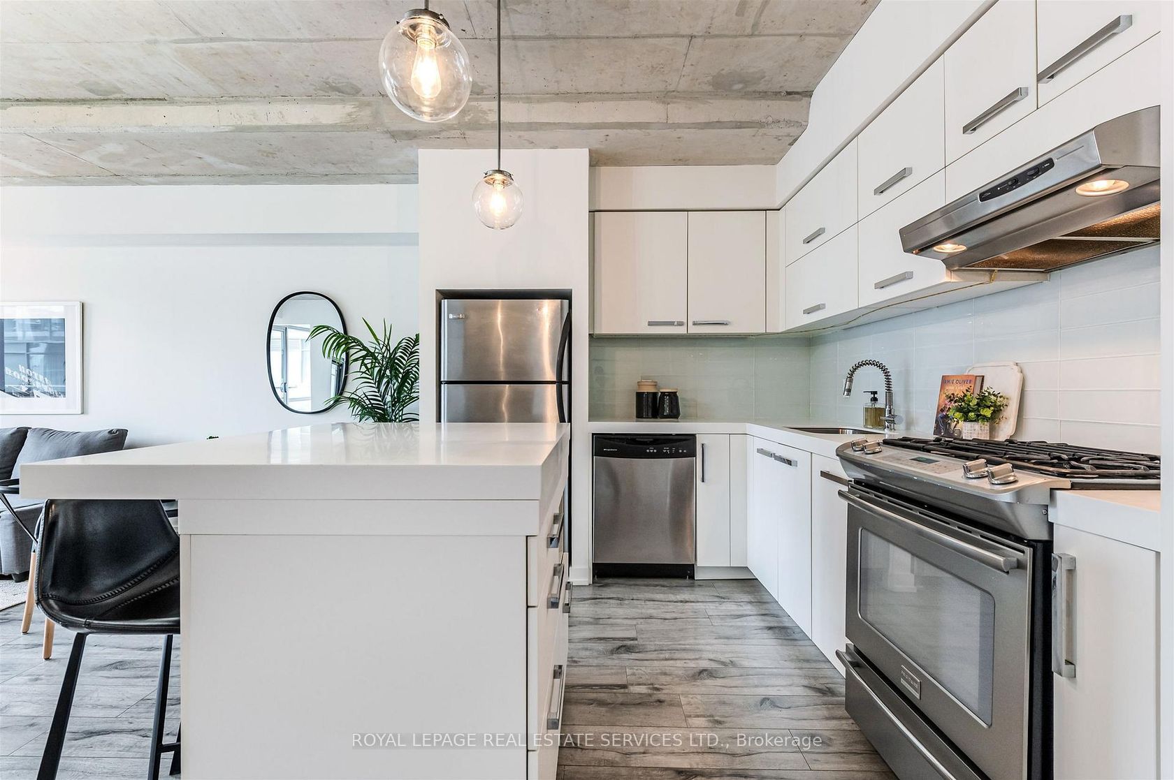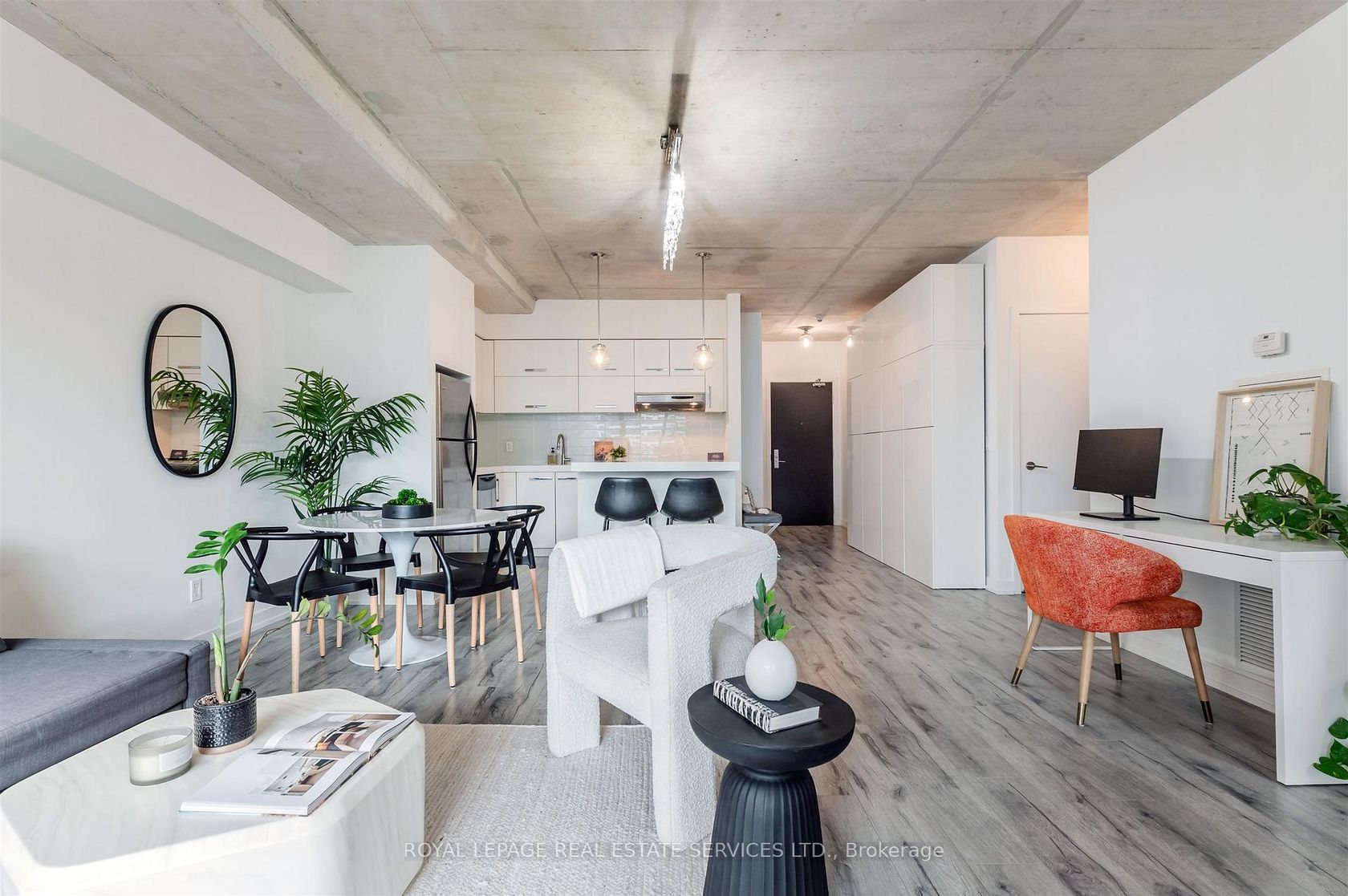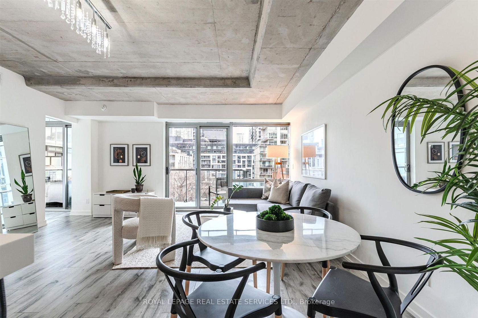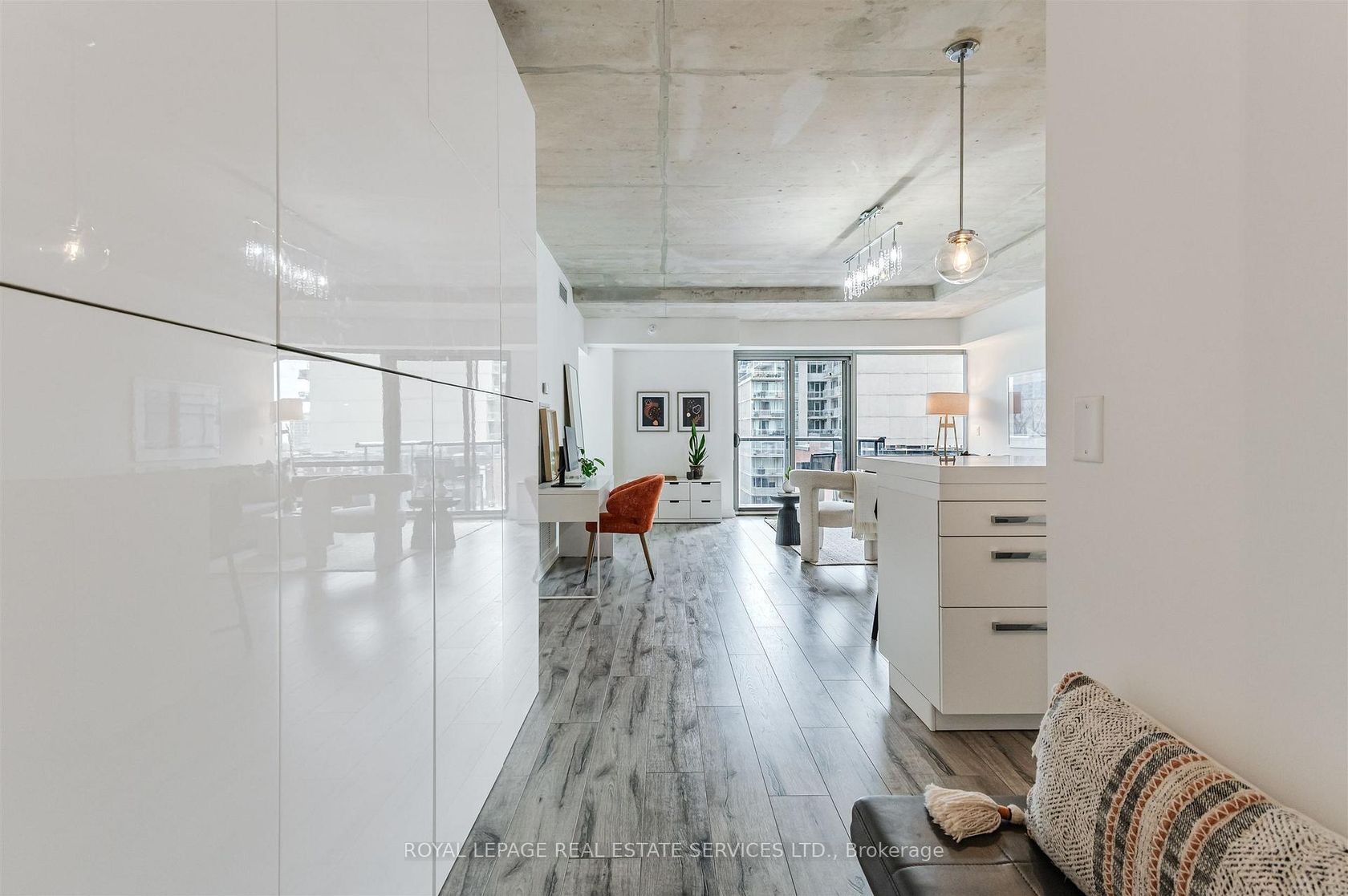 Experience the pinnacle of urban sophistication at the prestigious 1 Hotel Residences. Unit 703 is a spotless and spacious one-bedroom suite that perfectly balances industrial chic with modern luxury. The interior boasts soaring exposed concrete ceilings and wide-planked laminate flooring throughout, illuminated by natural light pouring in through floor-to-ceiling windows. The open-concept living space features a custom-built white wall unit offering oodles of storage, while the kitchen is a chef's dream, complete with stainless steel appliances and a custom island with a functional breakfast bar. Step outside to your large, south-facing balcony, an ideal private oasis featuring a gas BBQ hookup-perfect for alfresco dining against the city backdrop. This suite also includes the rare convenience of dedicated parking and a storage locker. Life at 55 Stewart Street offers more than just a home; it's an all-access pass to the world-class amenities of The 1 Hotel. Residents enjoy the legendary rooftop pool with its spectacular city views, a state-of-the-art fitness center, elite on-site dining, and the convenience of a car wash and detailing center. Located in the vibrant heart of King West, you are steps away from Toronto's best restaurants, cafes, and nightlife. This is urban living at its finest, right in the center of everything!