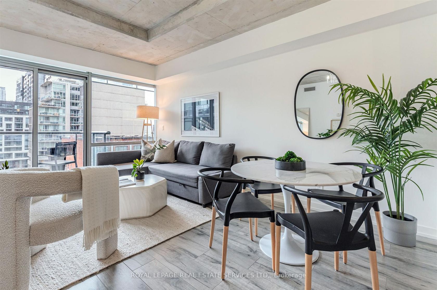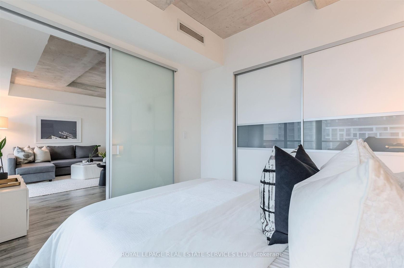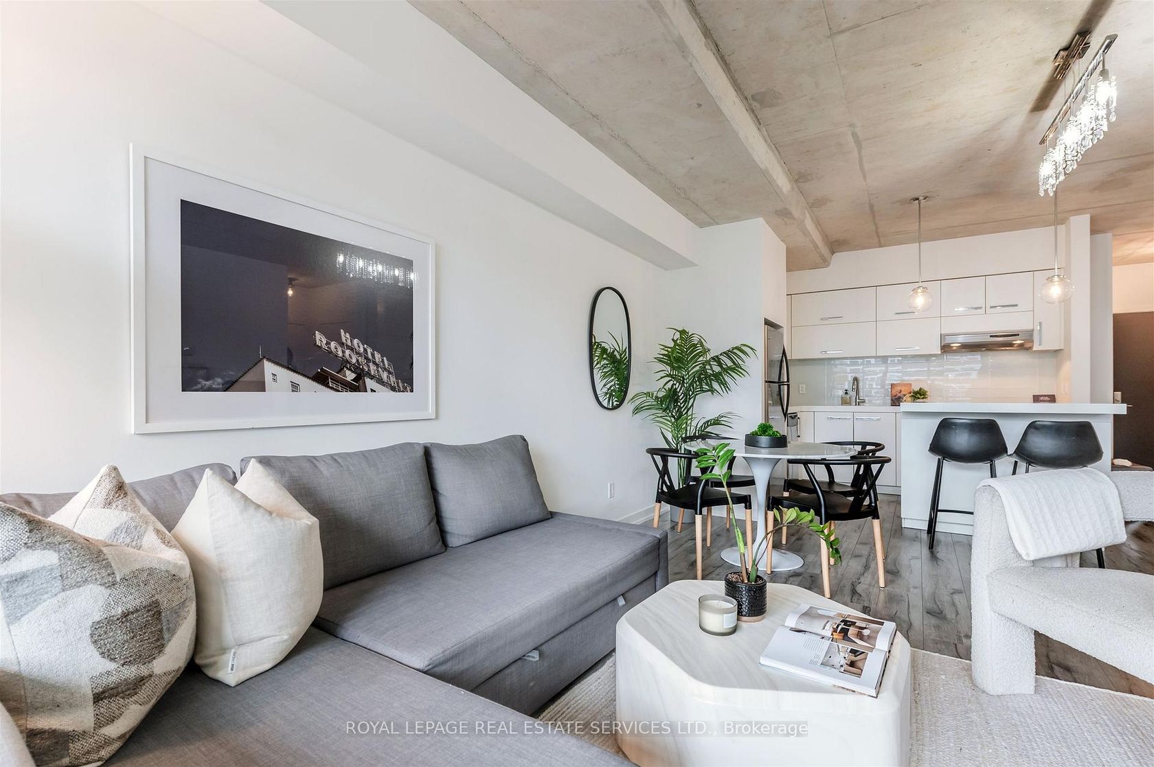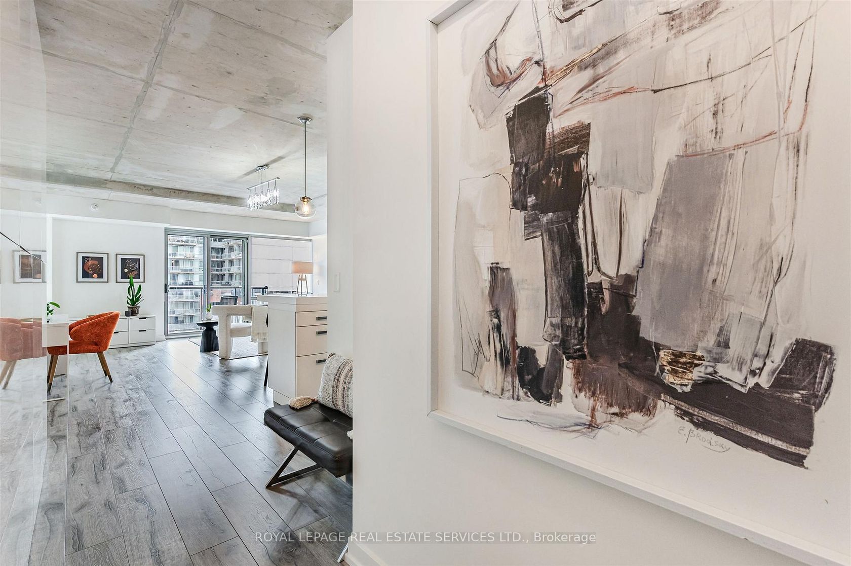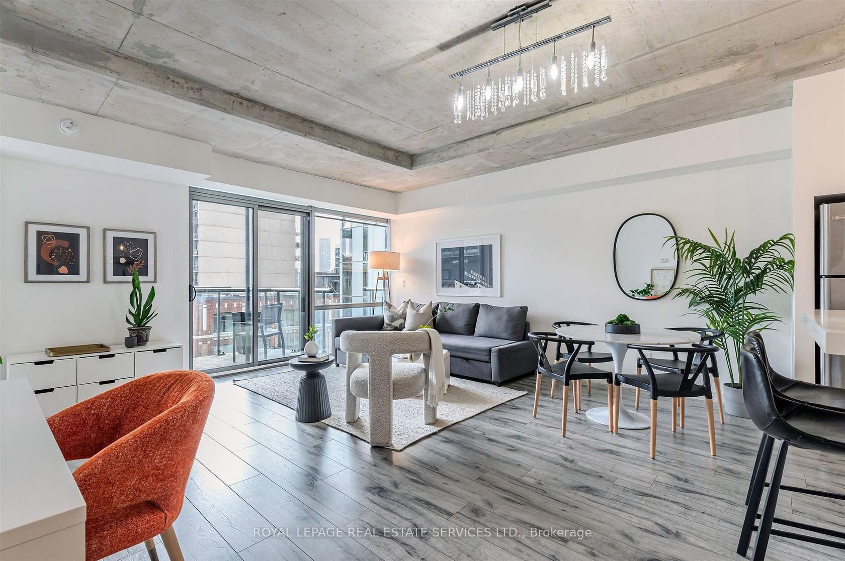 Experience the pinnacle of urban sophistication at the prestigious 1 Hotel Residences. Unit 703 is a spotless and spacious one-bedroom suite that perfectly balances industrial chic with modern luxury. The interior boasts soaring exposed concrete ceilings and wide-planked laminate flooring throughout, illuminated by natural light pouring in through floor-to-ceiling windows. The open-concept living space features a custom-built white wall unit offering oodles of storage, while the kitchen is a chef's dream, complete with stainless steel appliances and a custom island with a functional breakfast bar. Step outside to your large, south-facing balcony, an ideal private oasis featuring a gas BBQ hookup-perfect for alfresco dining against the city backdrop. This suite also includes the rare convenience of dedicated parking and a storage locker. Life at 55 Stewart Street offers more than just a home; it's an all-access pass to the world-class amenities of The 1 Hotel. Residents enjoy the legendary rooftop pool with its spectacular city views, a state-of-the-art fitness center, elite on-site dining, and the convenience of a car wash and detailing center. Located in the vibrant heart of King West, you are steps away from Toronto's best restaurants, cafes, and nightlife. This is urban living at its finest, right in the center of everything!