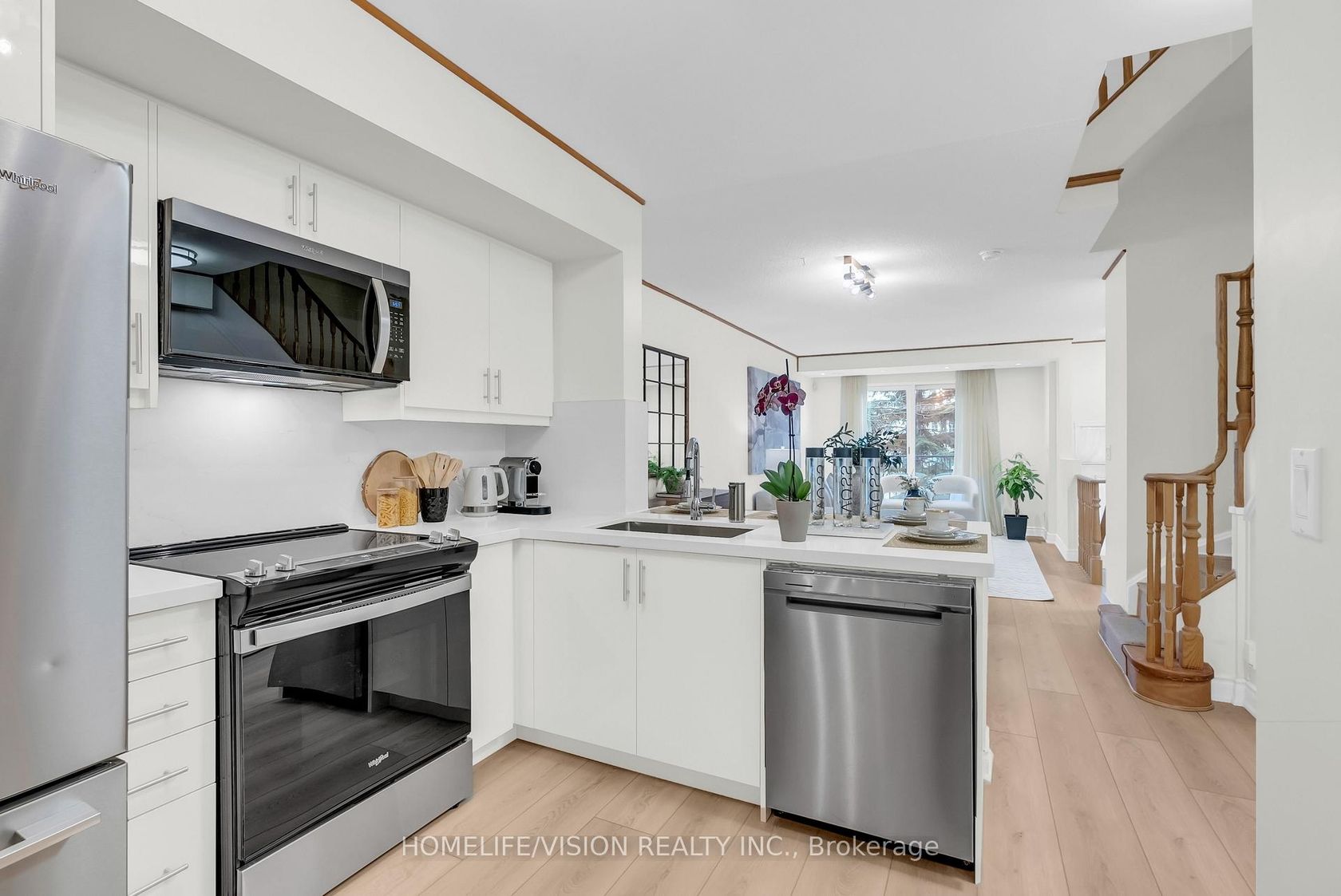 Outstanding townhouse in a quiet gated community (1492 sqft), SOUTH exposure with park view, renovated, walking distance to Subway, family friendly complex, featuring private balcony with gas BBQ hookup. Newly renovated flooring (12mm Vinyl throughout first floor and entrance stairs) , soft-touch custom cabinets (brand new), Quartz backsplash and countertops, deep kitchen sink, faucet (MOEN), brand new GE appliances (French-door fridge, range, microwave, dishwasher). Stacked GE washer & dryer (2023) on second floor, Newer American Standard toilets, modern powder room vanity, pantry with new shelving, under-stair storage. Walking distance to top-ranked schools: Earl Haig Secondary School, Cummer Valley Middle School, and McKee Public School, Mitchell Field Community Centre, Metro Grocery Store, shops, restaurants and parks. Easy access to TTC subway and major highways. 24-hr security. Elevator to underground parking. Locker, bike storage, car wash, EV charging station, visitor parking (P1), outdoor visitor parking near Block 1200. Maintenance includes landscaping, snow removal, parking & locker maintenance, and insurance. Hydro & gas separately metered. Each floor is 497 sqft as per MPAC (497 x 3).
