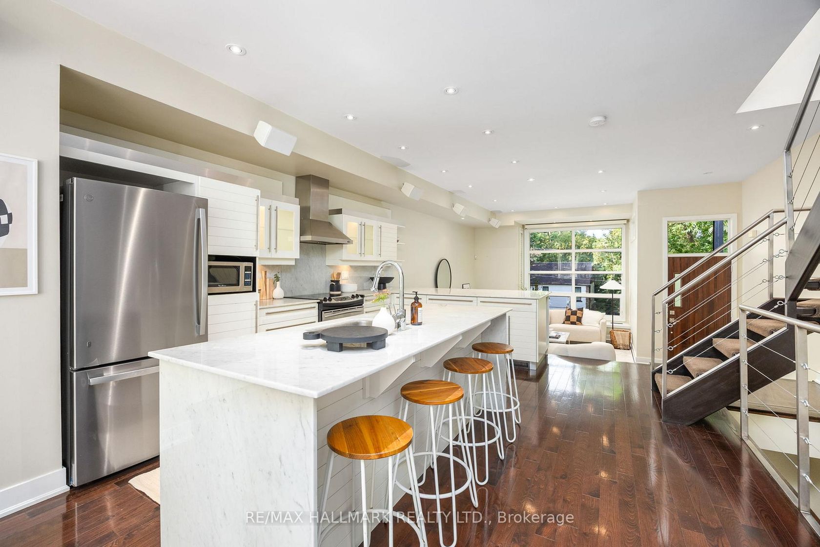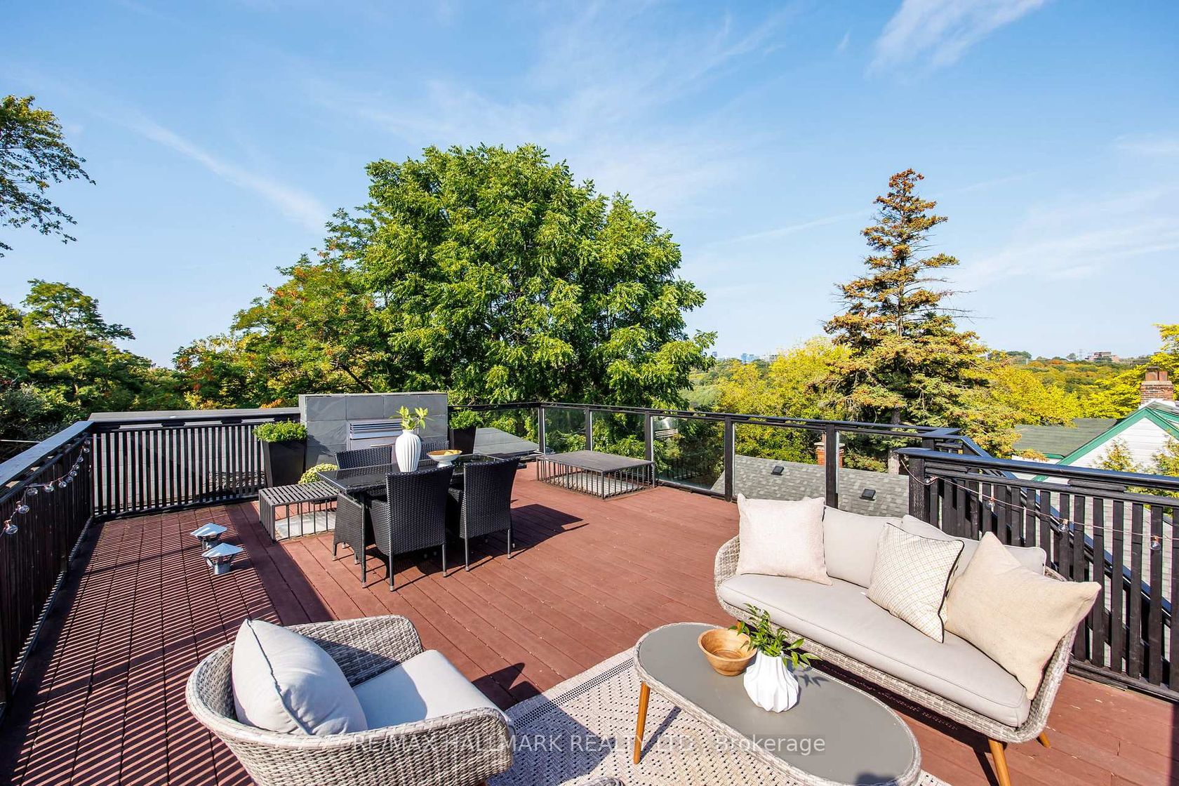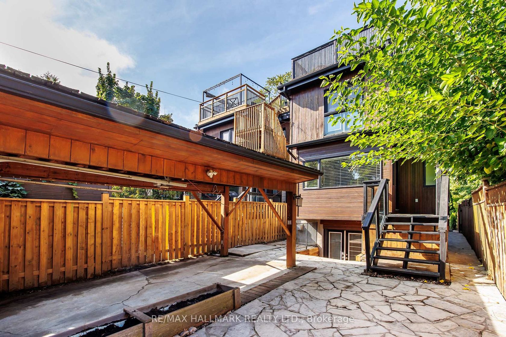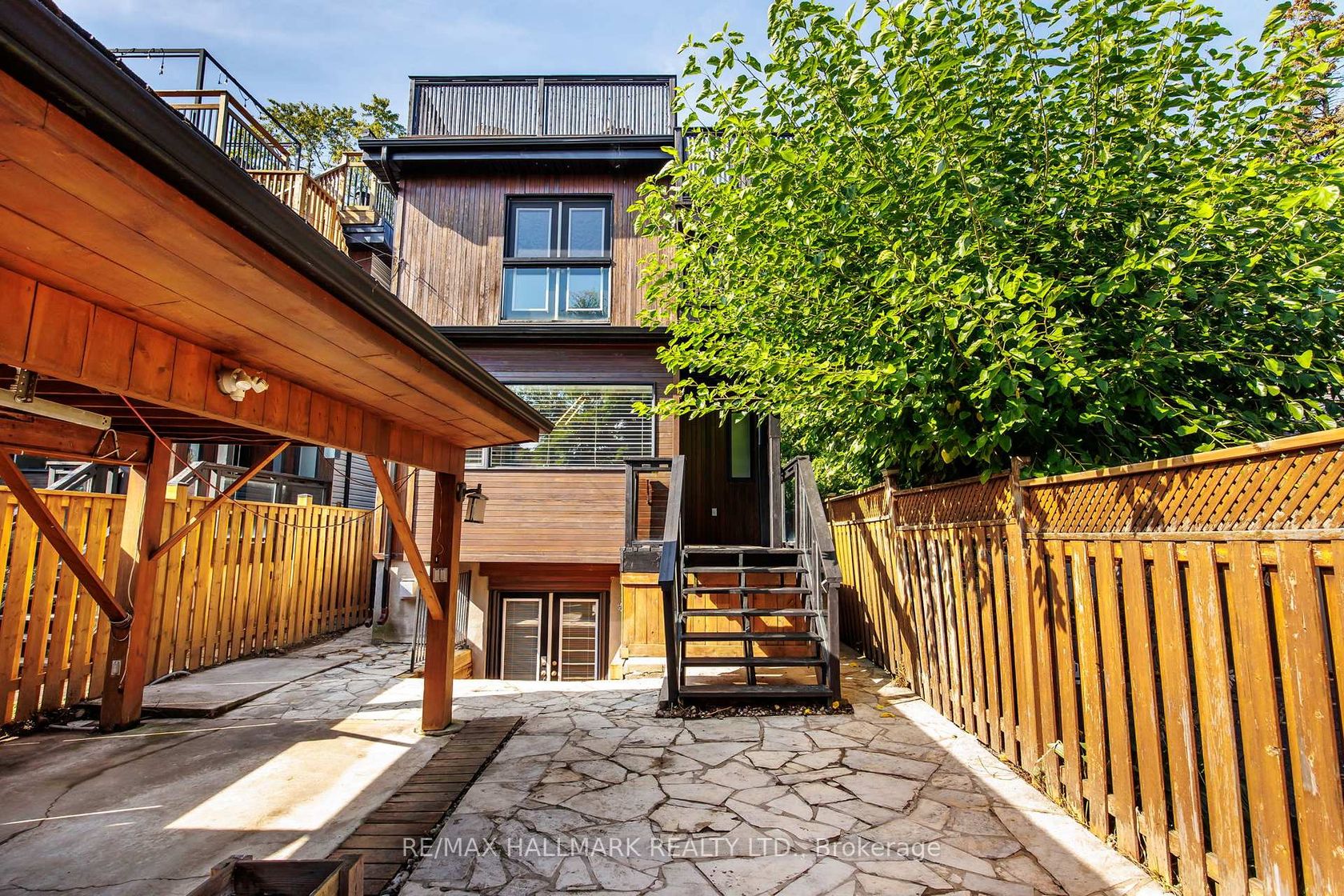 Rarely available modern 2 + 1 bedroom home backing onto the Don Valley ravine. The open concept main floor is filled with natural light from expansive front windows overlooking the trails, creating a seamless connection to nature right outside your door. Upstairs, two spacious bedrooms lead to a private rooftop patio the ultimate spot for entertaining or quiet evenings under the stars. The fully finished basement offers a flexible bedroom/office space with a walkout to the rear laneway and convenient carport parking. A unique opportunity to enjoy urban living with direct access to the Don Valley trail system, parks, and transit, all in a quiet, tucked-away setting.