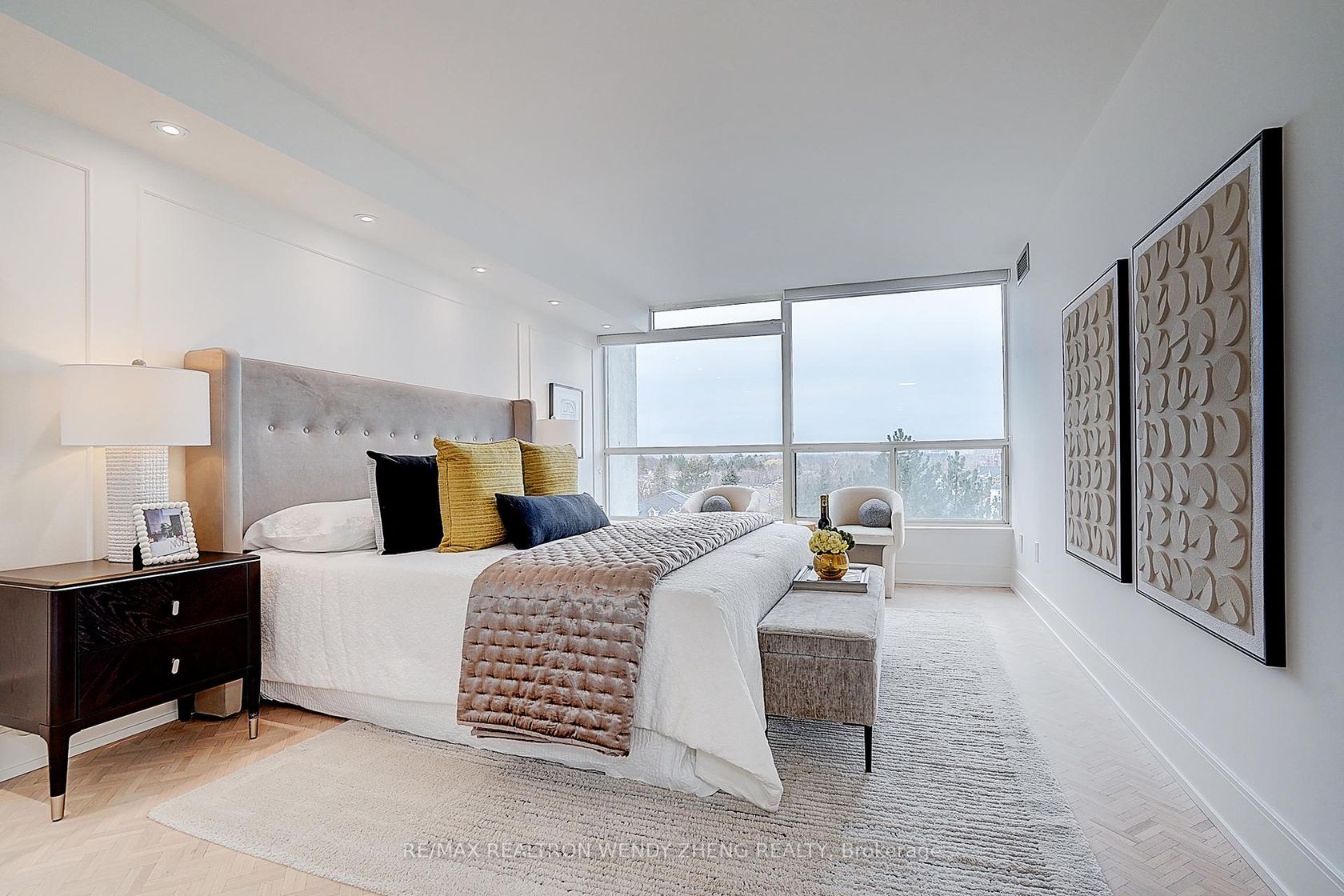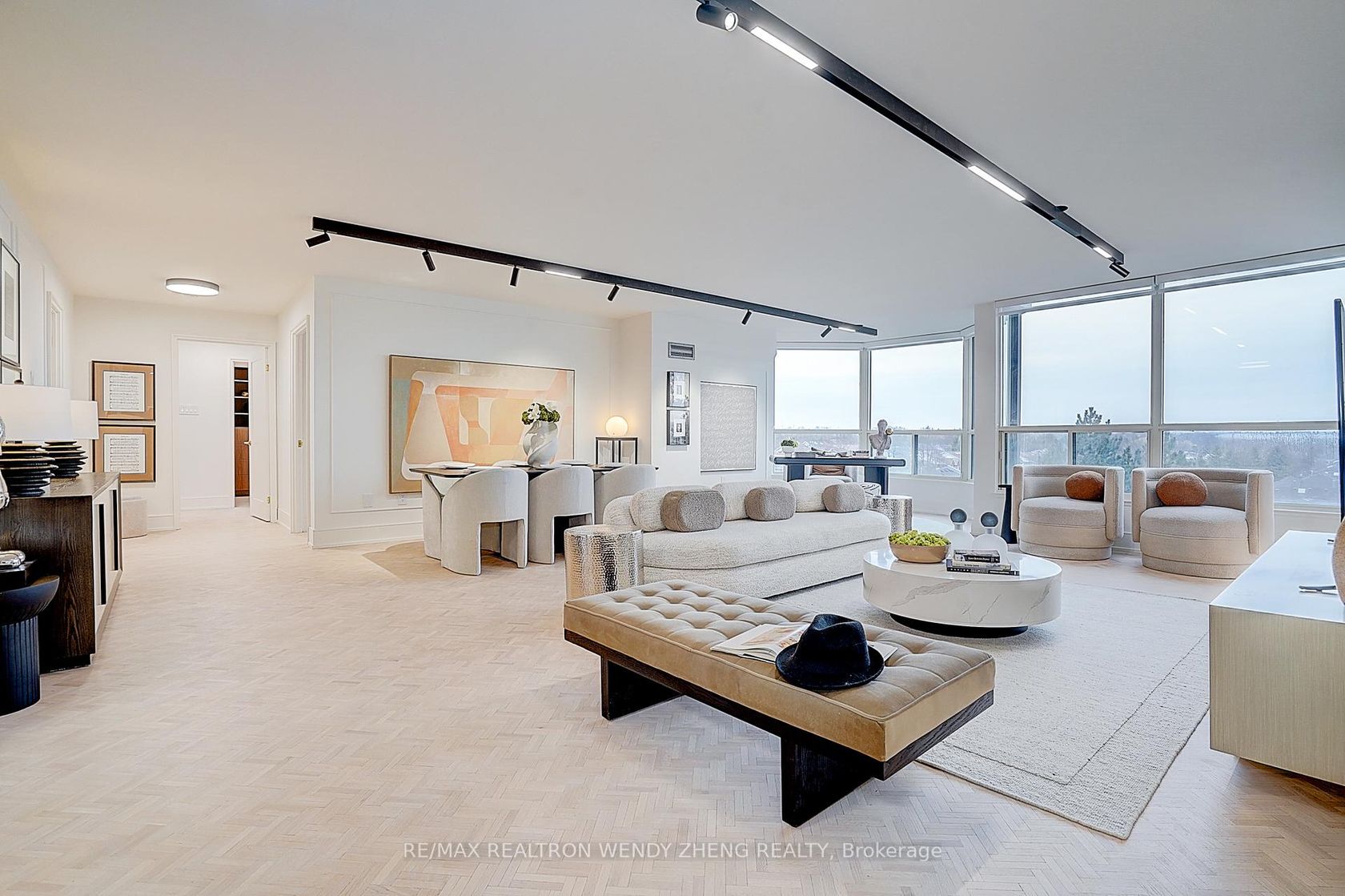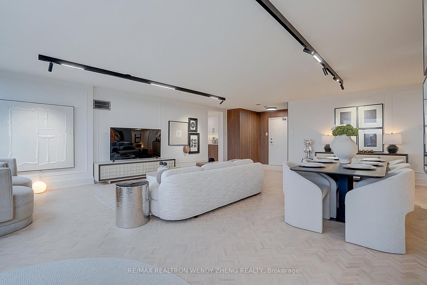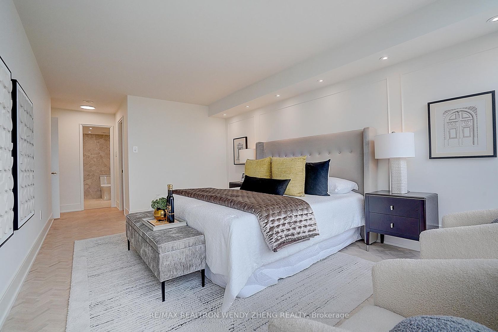 Fully renovated 2-bedroom, 2-bathroom luxury suite spanning 1,646 sq. ft., ideally located directly across from the subway with a grocery store conveniently on the ground floor. This bright and spacious residence features sun-filled floor-to-ceiling windows and an expansive open-concept living and dining area, complemented by elegant herringbone hardwood flooring. The gourmet kitchen showcases Taj Mahal quartz countertops with a matching backsplash and all-new app-controlled smart appliances, blending modern technology with timeless design. Two generously sized bedrooms each feature walk-in closets, while both fully renovated bathrooms are finished with Italian porcelain tile and upscale fixtures. Designer upgrades include magnetic track lighting, recessed pot lights, and custom zebra blinds throughout the suite. Additional highlights include ensuite laundry, built-in storage, and a private balcony overlooking a tranquil courtyard. Residents enjoy 24-hour concierge service and premium amenities including a rooftop pool, fitness centre, sauna, yoga room, party room, guest suites, tennis and pickleball courts, and bike storage, offering a lifestyle of comfort, convenience, and turnkey luxury in a prime location.
