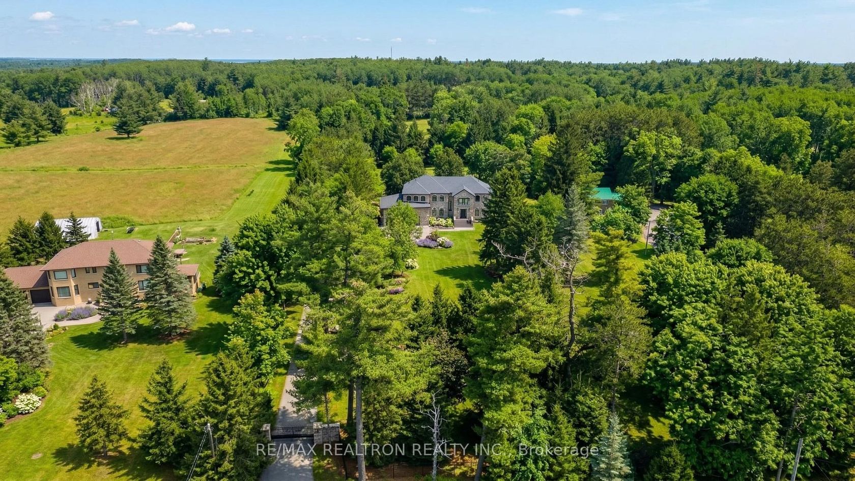 Welcome to a Marvel of Modern Construction. Recently Completed on a 2.4-acre Gated Estate in Prestigious King Offering over 7,500 Sq ft of refined luxury living (5800 SQ.FT+2950 SQFT). A long, tree-lined approach unveils a residence defined by natural stone and brick masonry, balanced proportions, and striking architectural presence. Soaring two-storey 20-ft ceilings crown the grand great room, creating a dramatic yet elegant setting for entertaining. The chef's kitchen anchors the home with a quartzite island, premium built-in appliances, dual cooktops and ovens, and an oversized walk-in pantry. Each bedroom features a private en-suite, including a main-floor suite, designed for seamless multi-generational living. The upper primary retreat offers a spa-inspired en-suite and bespoke dressing room. The finished lower level, with 12-ft ceilings and golf simulator rough-in, adds exceptional lifestyle flexibility. Notable upgrades include dual HVAC systems, radiant floor heating, spray foam insulation, and a tankless water system. A 3-car garage, heated 30x30 workshop, and expansive two-tier deck complete the estate. Minutes to Hwy 400, top private schools, and amenities-an enduring legacy property defined by craftsmanship, privacy, and location.