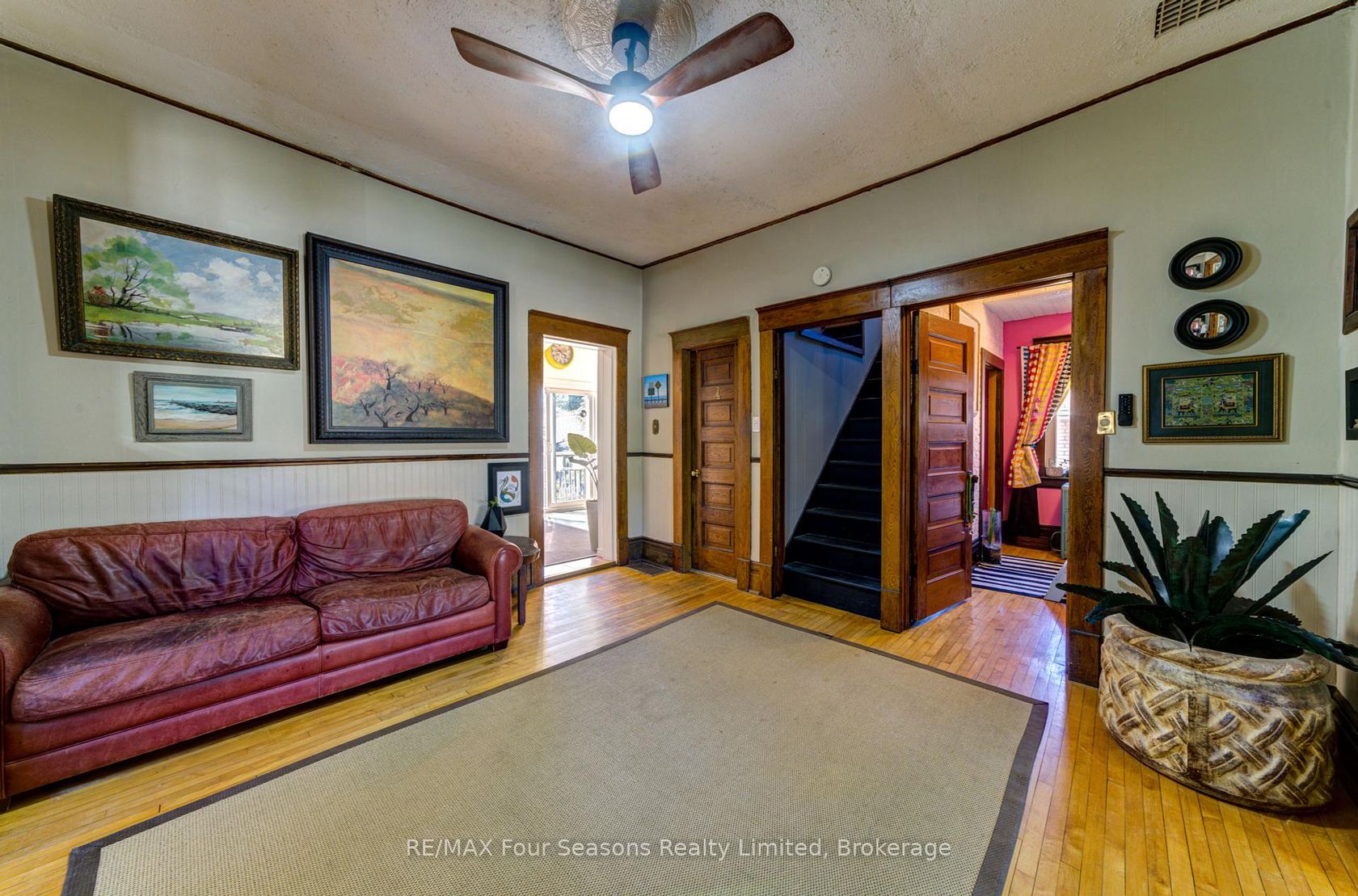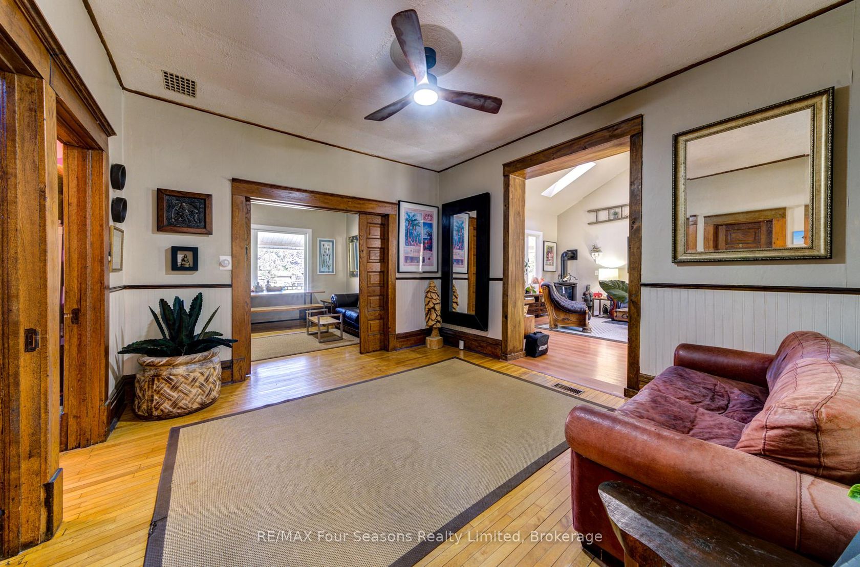 Fantastic location only a 10 minute walk to downtown and 5 minute walk to your choice of 2 elementary schools and two high schools. Lovely well maintained century home has features of the time. High ceilings, pocket doors, hardwood flooring and beautiful trim. This 4 bedroom home offers a great opportunity for the first time buyer. A large covered deck on the front leads to the main entry door opening into a huge bright family room with cathedral ceilings and gas fireplace. Large living room with pocket doors leads off to the primary bedroom, den, kitchen and further bedroom. Two further bedrooms upstairs. A fully fenced backyard with gazebo, covered porch and sunroom make this a great backyard entertainment area. Many upgrades include windows, sliding door, furnace replaced in 2021, tankless hot water heater, upgraded electrical panel, dishwasher and double sinks, new roof in 2019. Paved three car driveway.