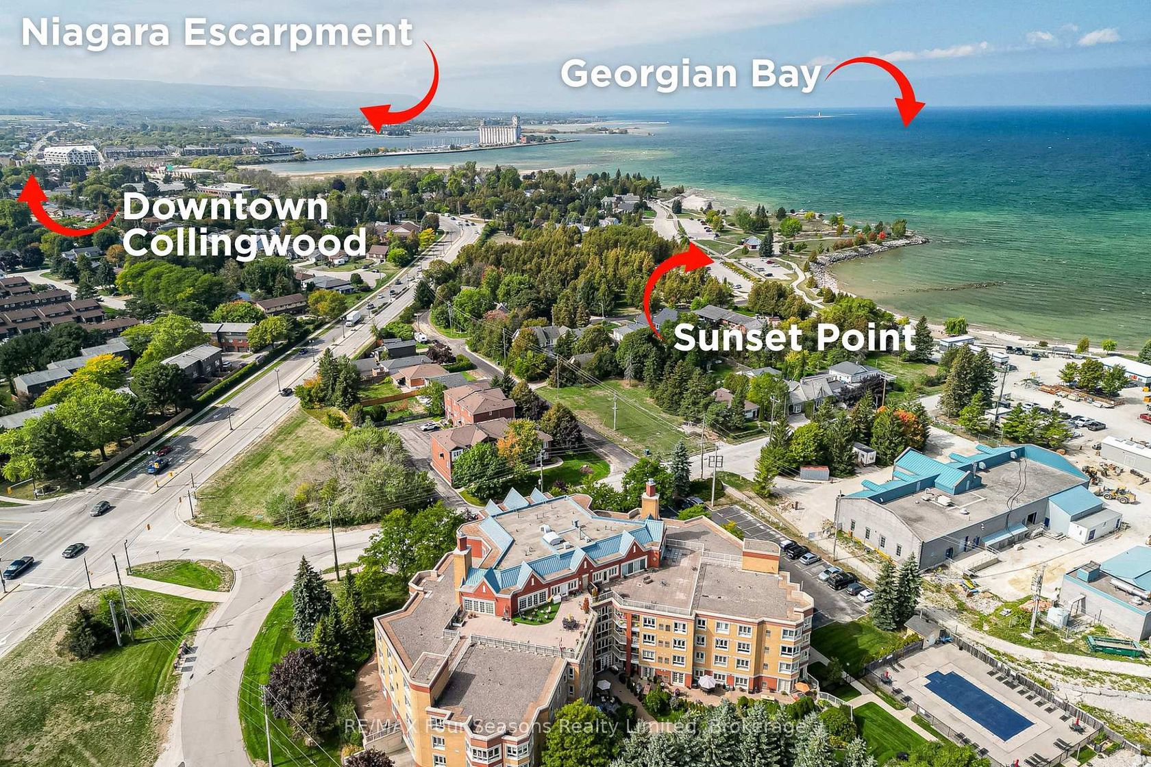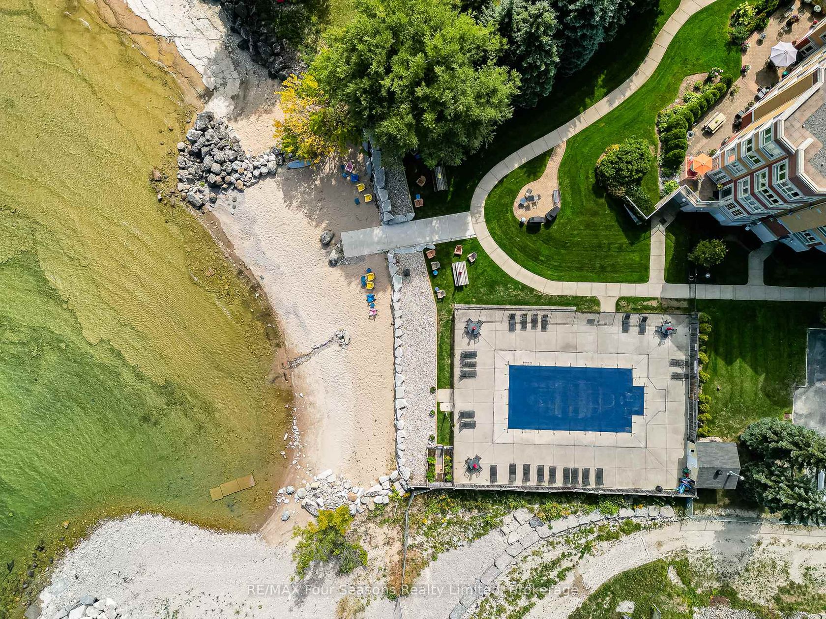 WATERFRONT CONDO COMMUNITY ~ Spectacular Views of Georgian Bay! Welcome to Sunset Cove, Collingwood. Experience carefree living in this beautiful 2-bedroom, 2-bathroom condo located in the heart of Collingwood, just steps from Sunset Point Park and situated on the stunning shores of Georgian Bay. Embrace a friendly, well-maintained waterfront community, this unit offers beautiful views and a host of desirable amenities. Property Highlights: Spacious & Bright: Open-concept living, dining, and kitchen area perfect for entertaining family and friends. Primary Suite: Features his & hers closets and a private 4-piece ensuite with a jetted soaker tub. Second Bedroom & Full Bath: Ideal for guests or a home office setup. Community Features: Private Beach Access Dip your toes into Georgian Bay or simply unwind by the water. Seasonal Outdoor Pool: Lounge and soak up the sun all summer long~ great to entertain guests and grandchildren. Community Room: featuring pool table, media room, games, kitchen, library etc.~ A welcoming space to connect with neighbours and enjoy social events. Walking/Biking Trails Steps to Sunset Point and nearby trail systems for nature lovers. Convenience & Comfort: Heated Underground Parking~ A winter essential in Collingwood! Assigned Parking Spot & Secure Bike Storage. Storage Locker~ Extra space for seasonal gear. Concierge: On-Site (9-5) Added security and peace of mind. Prime Location: Walk to downtown Collingwood for boutique shopping, local dining, and community events. Easy access to outdoor recreation, including golf, fishing, skiing, hiking, and boating. This spacious condo at Sunset Cove is more than just a home its a lifestyle. Whether you're looking for a full-time residence or a weekend getaway, this waterfront gem offers it all. Book your private showing today and make every day feel like a vacation! Rooms virtually staged for vision!