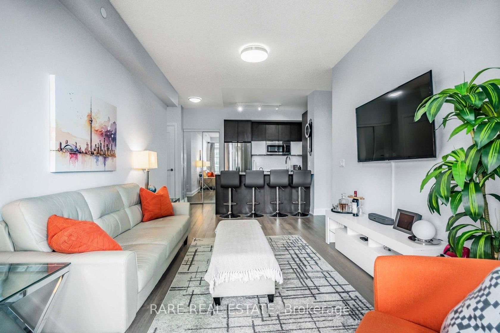 Luxury Living at Lago at the Waterfront! Discover this stunning 1-bedroom + den condo offering 663 sq. ft. of modern elegance, paired with a spacious 105 sq. ft. balcony. This sun-filled unit features floor-to-ceiling windows, flooding the space with natural light and creating a warm, inviting ambiance.The open-concept layout showcases a sleek kitchen with quartz countertops, a breakfast bar, and stainless steel appliances, seamlessly connecting to the living and dining area. Step out onto the balcony from both the living room and primary bedroom to enjoy breathtaking water views and indoor-outdoor living. This condo includes the convenience of an owned parking spot and locker. Lago at the Waterfront is renowned for its exceptional amenities, including: An indoor pool, hot tub, and sauna for relaxation. A state-of-the-art gym to maintain your active lifestyle. A theatre room for private screenings. An outdoor entertaining area with BBQ facilities. A convenient dog washing station. Ample visitor parking, stylish party room, guest suites, and a 24-hour concierge. Located in the vibrant Humber Bay Shores community, this is your opportunity to experience the ultimate in waterfront living. Don't miss out your dream lifestyle awaits at Lago at the Waterfront!