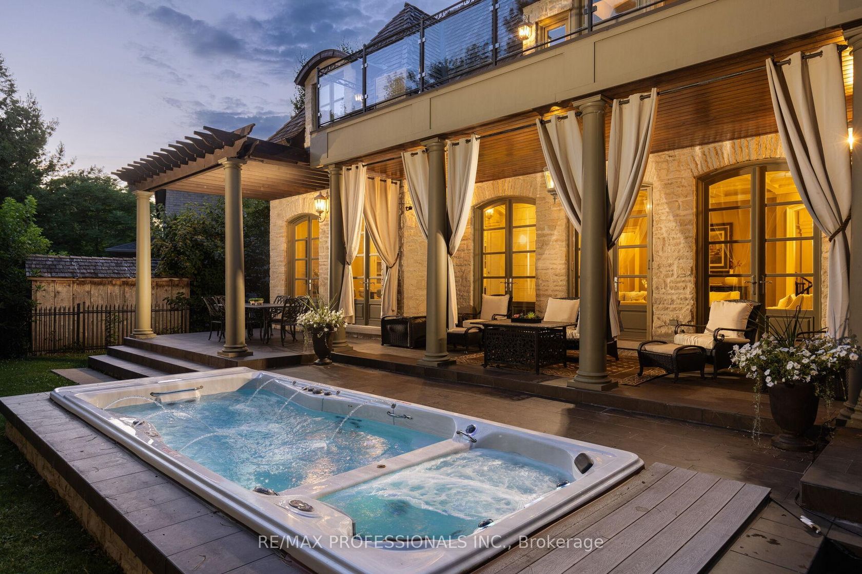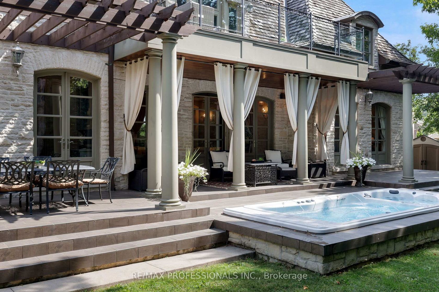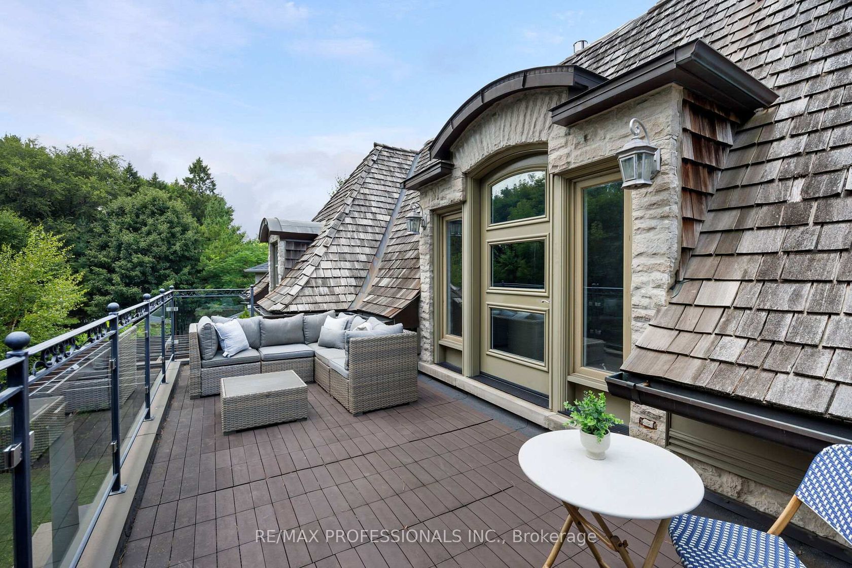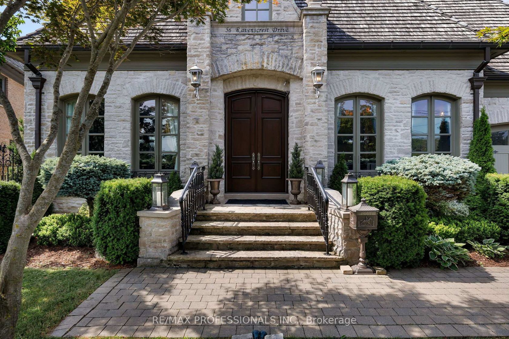 A truly no-expense-spared custom home on the Mimico Creek Ravine. Welcome to Fifty Six Ravenscrest Drive. With a commanding, solid stone exterior, atop a wide ravine lot, the curb appeal is undeniable. Enter an elegant interior - soaring double-height foyer, solid oak herringbone floors, and grand principal rooms. Stunning chef's gourmet kitchen. This home is designed with the future in mind, featuring two luxurious primary retreats, one on the main floor and one on the second level, along with well-appointed secondary bedrooms. The backyard is intimate & totally private, with ample ravine frontage, seven main-floor walkouts open to a gorgeous pillared terrace, and a Michael Phelps swim spa with a hot tub - perfect for low-maintenance, year-round use. Impressive French Country Chateau architecture. Priced well below replacement cost!