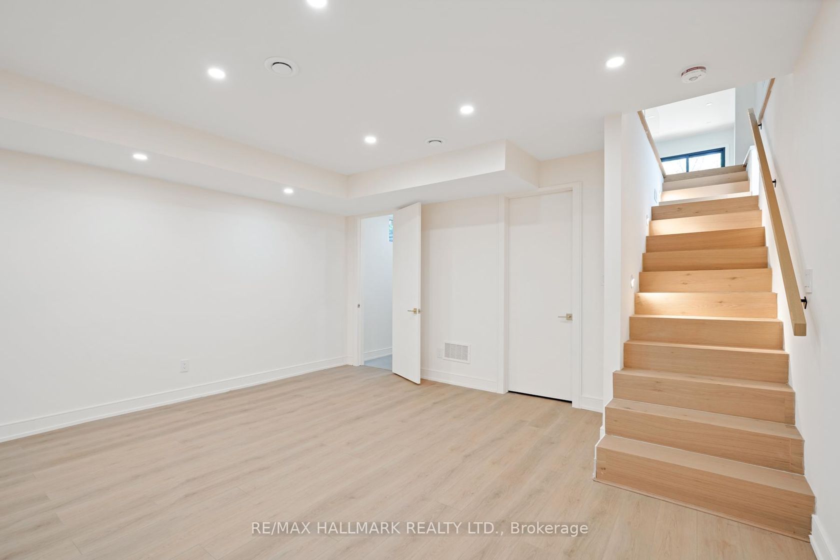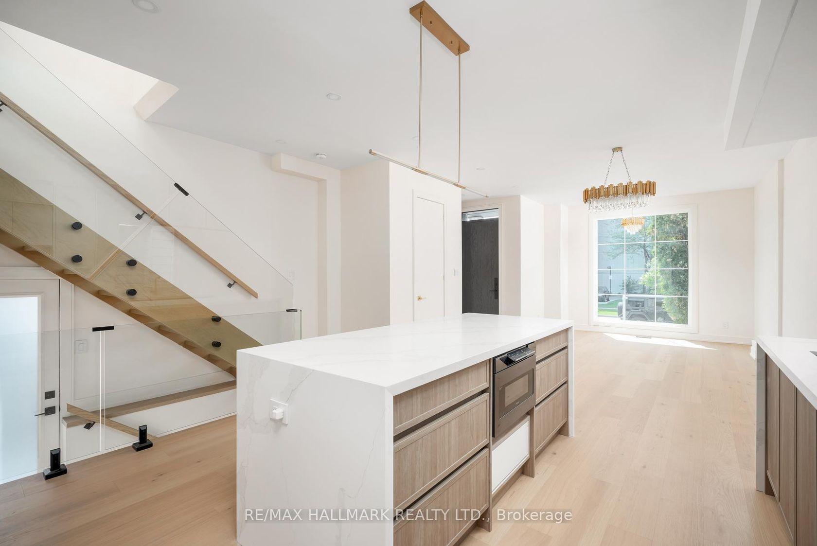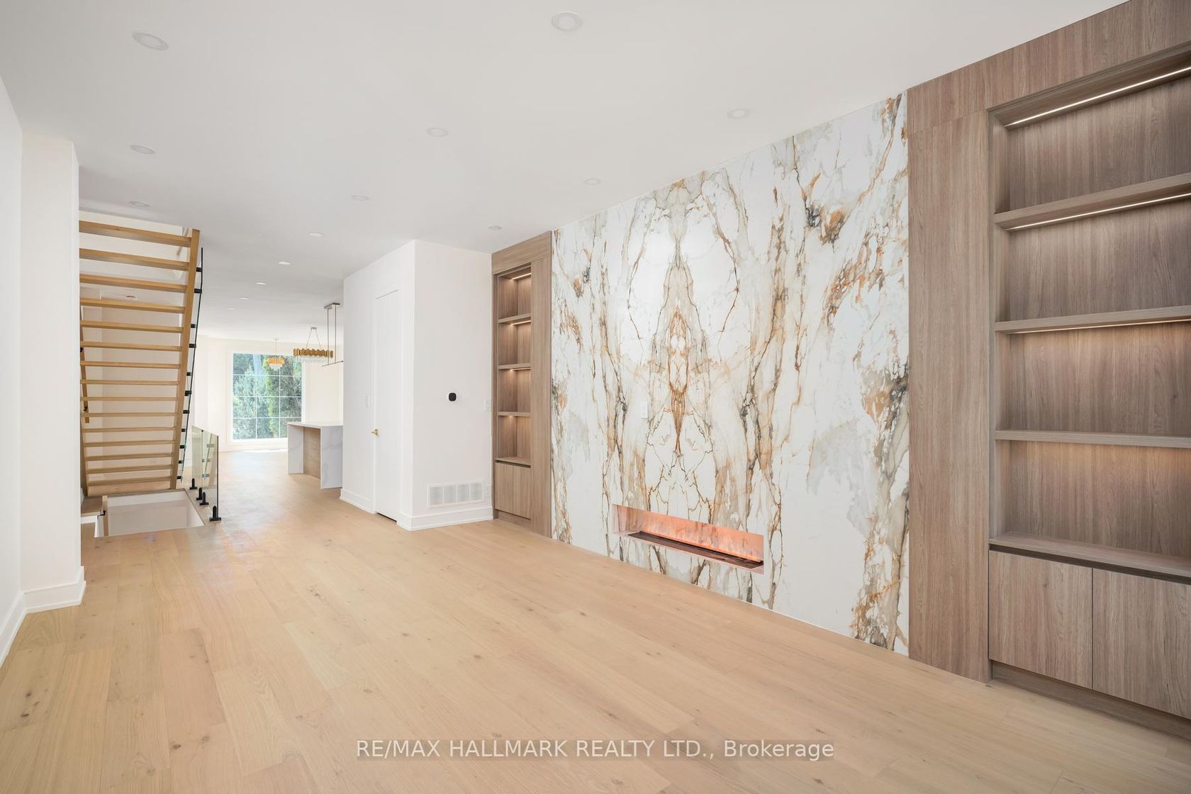 Stunning and extensively upgraded top-to-bottom, 2-storey home in an unbeatable location featuring 4 beds and 4.5 baths. This exquisite home offers luxurious modern living, combining sophisticated design with high-end finishes in every corner. Step into a welcoming foyer with a built-in closet and tile flooring. The open-concept main floor is filled with natural light, highlighted by a massive floor-to-ceiling window in the living room and gorgeous gold crystal lighting fixtures in both the living and dining areas. Rich engineering hardwood floors, pot lights, and a sleek glass staircase add contemporary elegance throughout. The kitchen features a centre island, stainless steel appliances, Quartz countertops and backsplash, plenty of cupboards, and under-cabinet lighting. The cozy family room boasts a Quartz wall with a built-in fireplace, custom shelving, and wall-to-wall glass doors that open to a private, fenced backyard with a deck. A convenient powder room completes the main level. Upstairs, open riser stairs and two skylights illuminate the hallway. This floor offers 4 bedrooms, 3 stylish bathrooms, and a dedicated laundry room that includes a stackable washer and dryer, a sink, tile flooring, and ample lighting. The primary bedroom is a true retreat with floor-to-ceiling sliding doors to a balcony with turf and glass railing, custom lighting, a walk-in closet, and a spa-like 5-piece ensuite. A second bedroom offers a private 3-piece ensuite, walk-in closet, and beautiful double windows. The high-ceiling basement features a spacious recreation room with pot lights and a 3-piece bathroom. A side entrance enhances accessibility and functionality. Equipped with exterior security cameras for peace of mind, this home blends style, space, and smart design. Close to schools, parks, short ride to the beach, GO Station, Public Transit, and Gardiner Express for easy commute.