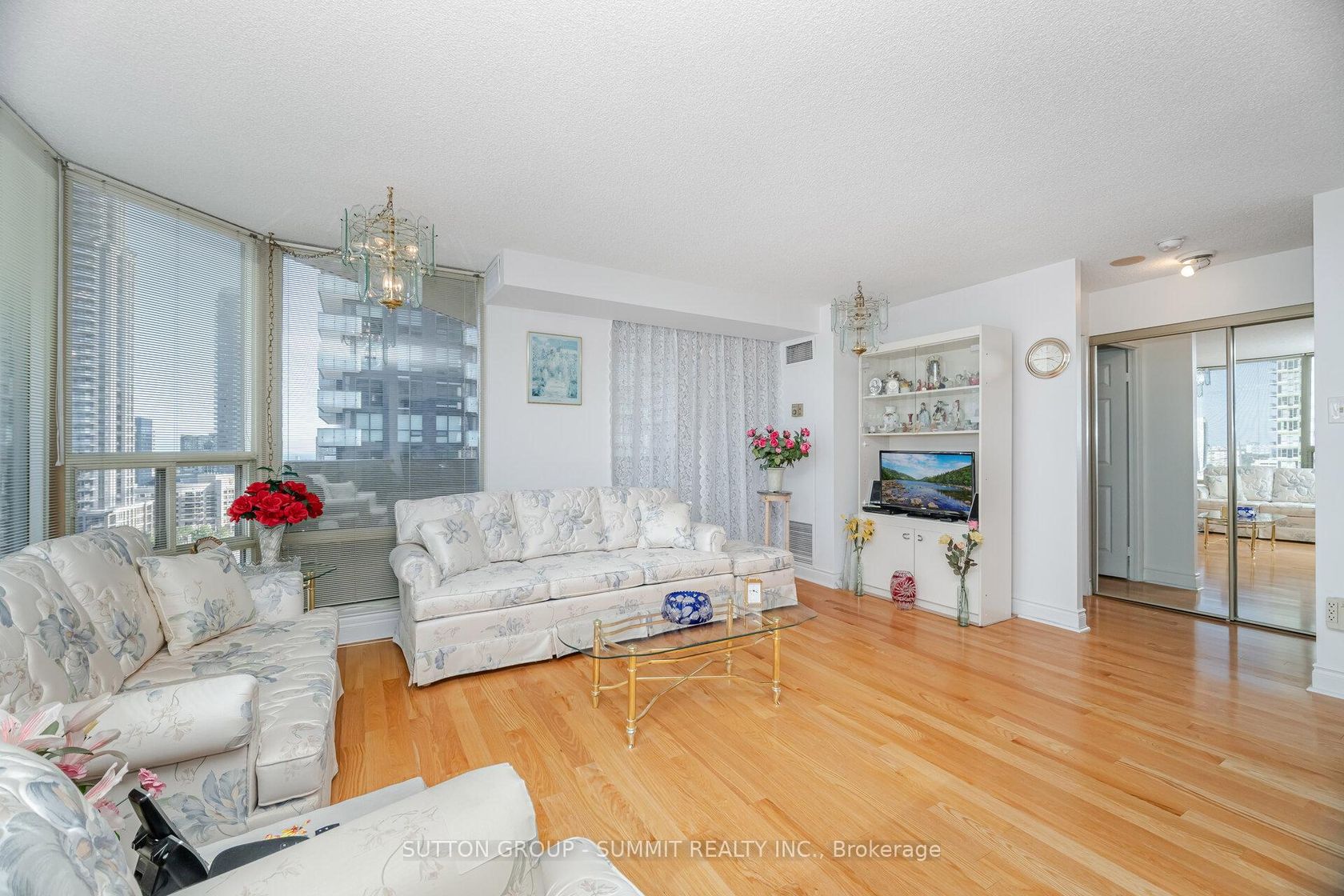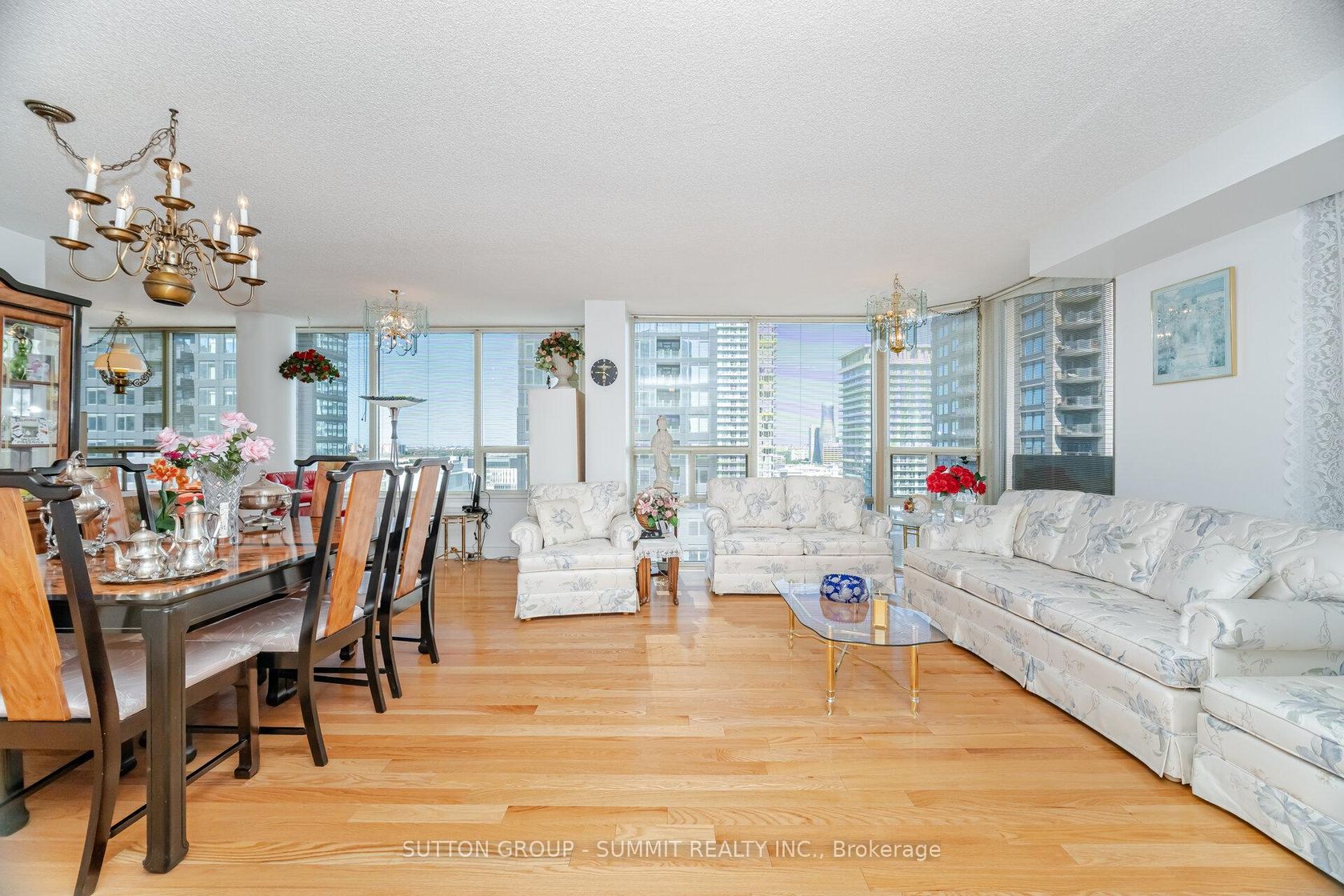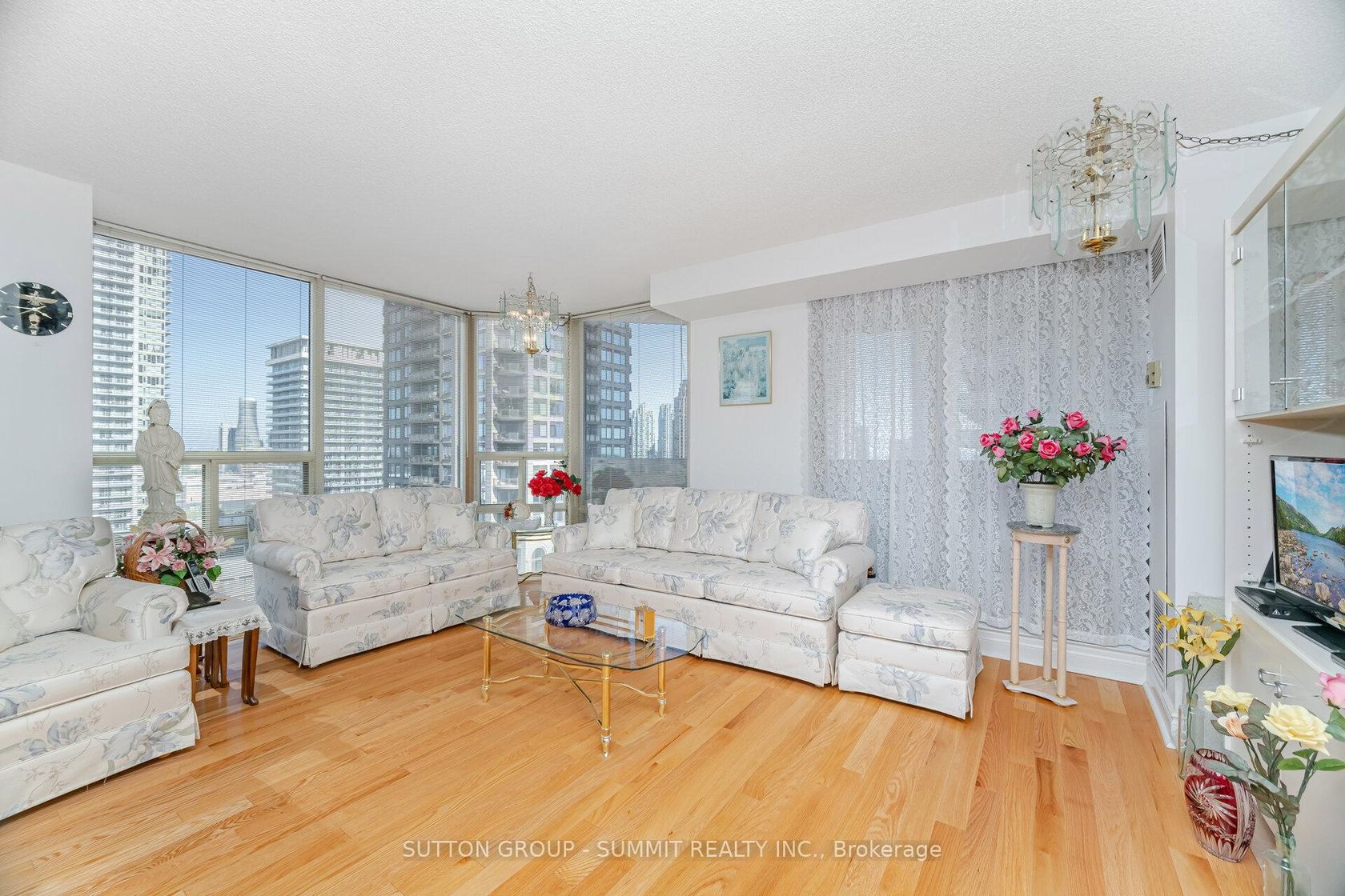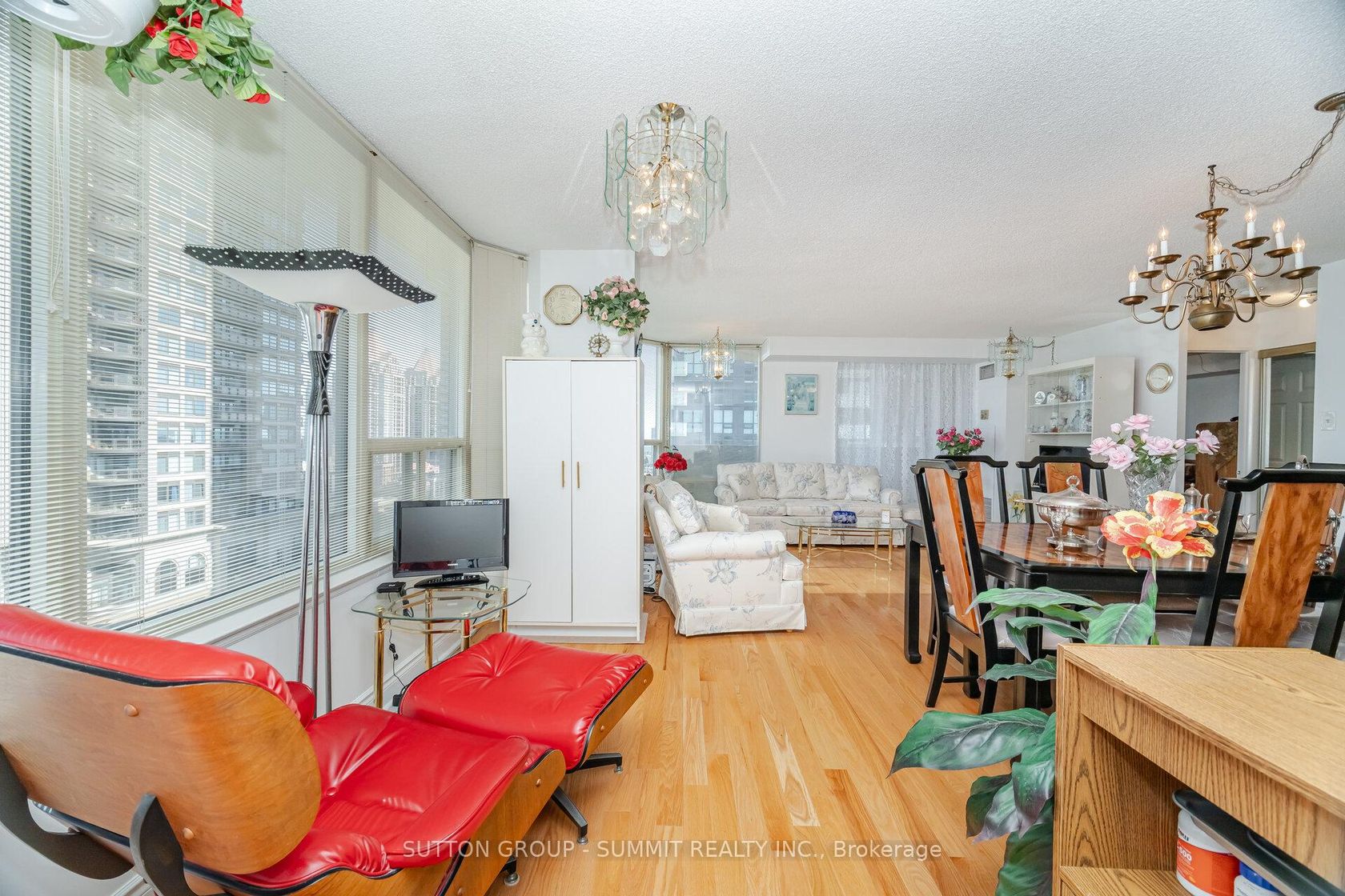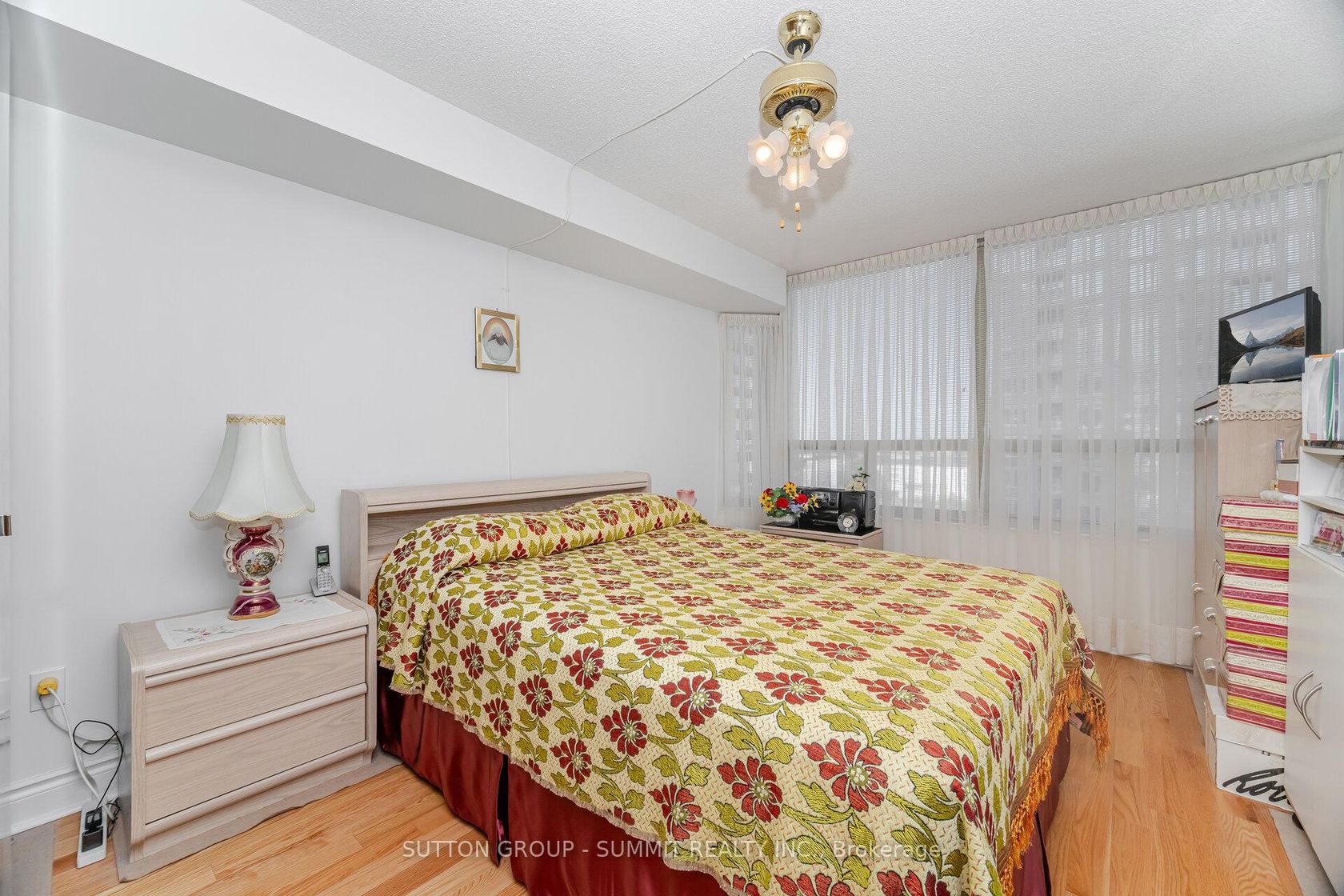Gorgeous sunfilled corner unit, hardwood floors throughout, amazing views of downtown Mississauga, bedrooms at opposite ends, supermarket next door, transit hub adjacent, great building meticulously maintained, 2 parking spots with one extra-wide (13ft), 2 large indoor lockers. Maintenance fee includes Bell Fibe TV "Better" programming package incl Fibe PVR for up to 3 TVs, plus Bell Fibe High Speed unlimited Internet. Enjoy the 24/7 security personnel, underground parking for overnight guests, indoor pool, whirlpool, sauna, squash court, tennis court, 2 party rooms, gym, card room, library/reading room, games room, and 4 guest suites (to rent). This is a lovely condo stacked with 5 star amenities.