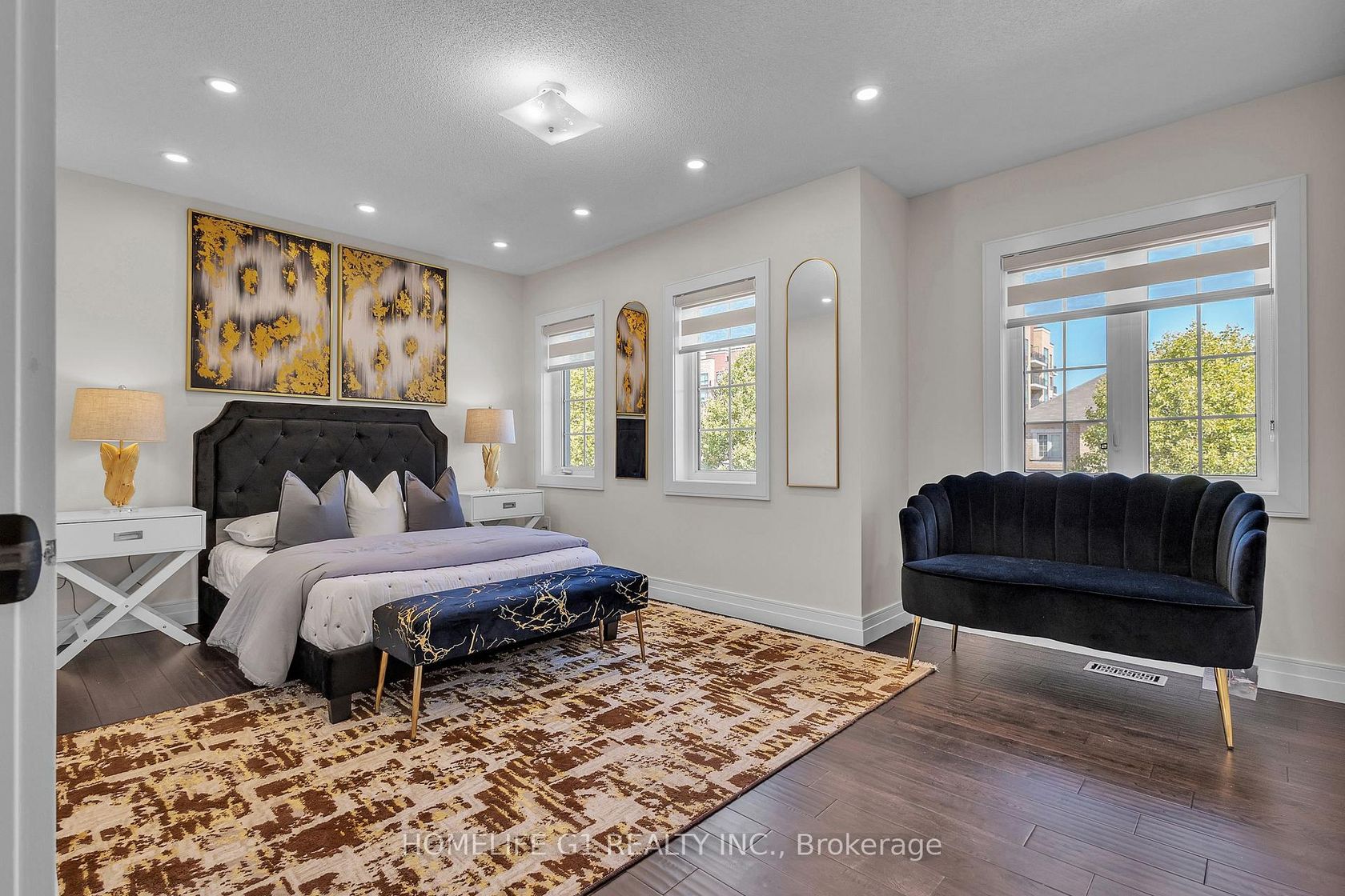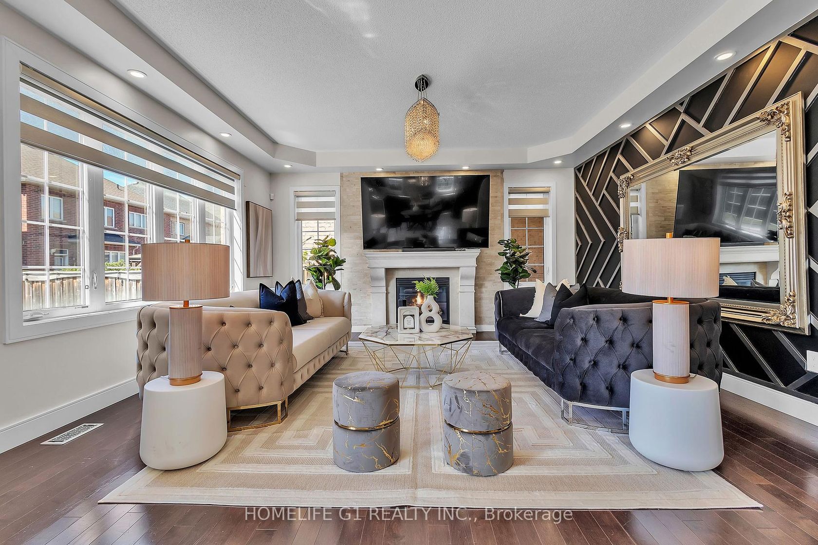 This fully upgraded home has 4500 sq. ft. of total living space on a premium corner lot with a backyard stretching 58 feet wide. This home welcomes you with a grand foyer and soaring 15-ft ceilings in the living room, framed by oversized bay windows that fill the space with natural light. The main floor showcases 24x24 marble flooring, custom metal picket railings, and over 100 pot lights across the main and second levels. A formal accent wall dining room with double door entry provides an elegant setting for entertaining, while the gourmet kitchen features three-inch granite countertops, built-in appliances, upper cabinet lighting, and spacious breakfast area. The kitchen flows into the family room, where another accent wall and fireplace create the perfect space for gatherings. Completing the main level are electric-powered blinds throughout and a full 3-piece bathroom with a stand-up shower. Upstairs, hardwood flooring runs throughout, with four generous bedrooms including a primary retreat with a 5-piece ensuite, a junior suite with its own ensuite, and two bedrooms sharing a jack-and-jill. The fully finished basement adds over 1,200 sq. ft comprised of three bedrooms, a 3-piece ensuite, abundant storage, and 60 additional pot lights. Exterior upgrades include a light brick and stone façade, exterior pot lights, and double side entries, completing this rare offering in one of Oakville's most desirable neighborhoods.