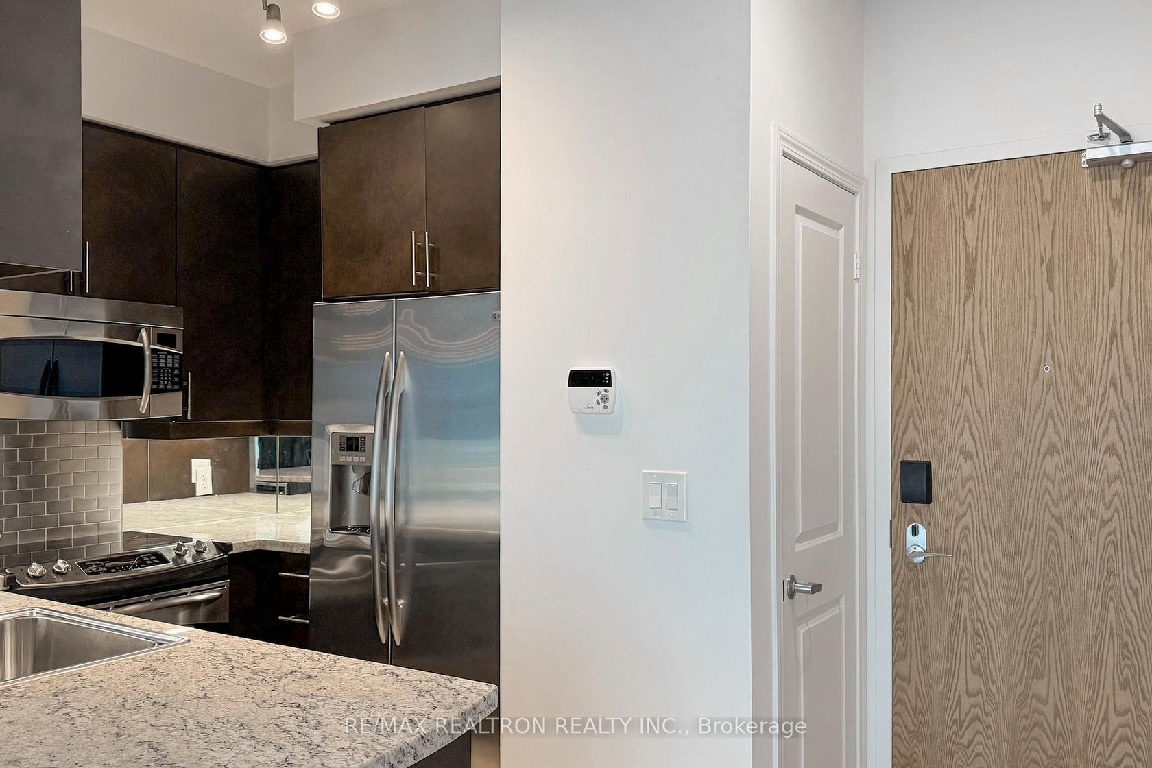 Gorgeous lower penthouse 650 sq ft suite at Park Lake Residences with stunning southwest view of lake. Spacious open space living / dining room. Access to the balcony from king sized bedroom & living room. Superbly appointed with 9Ft Ceilings, high end finishes including tall wooden kitchen cabinets, granite counters, mirror & SS backsplash, SS appliances including 36 double door fridge, solid oak floors throughout, spa-like bathroom with marble tiles, Kohler sink, Toto toilet, brand new top of the line high capacity LG washer/dryer (2024), custom blinds & lighting, alarm system, balcony tiles, swipe card unit access. Premium parking with large locker room beside the elevator. Quiet posh building with 9 suites per floor. Served by 4 transit lines & 15 minutes to Downtown Toronto. Walk to Sunnyside Beach, High Park, roller blade, bike or stroll the Martin Goodman Trail & more. Excellent amenities including 24-hour Concierge, gym, yoga/ ping-pong room, cards/ billiards room, meeting and party room, rooftop serenity garden with BBQs, picnic tables & amazing views of the Lake and visitor Parking. The unit is presented with a few virtually staged pictures as well as vacant. See attached 3D tour for a virtual walkthrough! Everything is done! Just move in & enjoy!