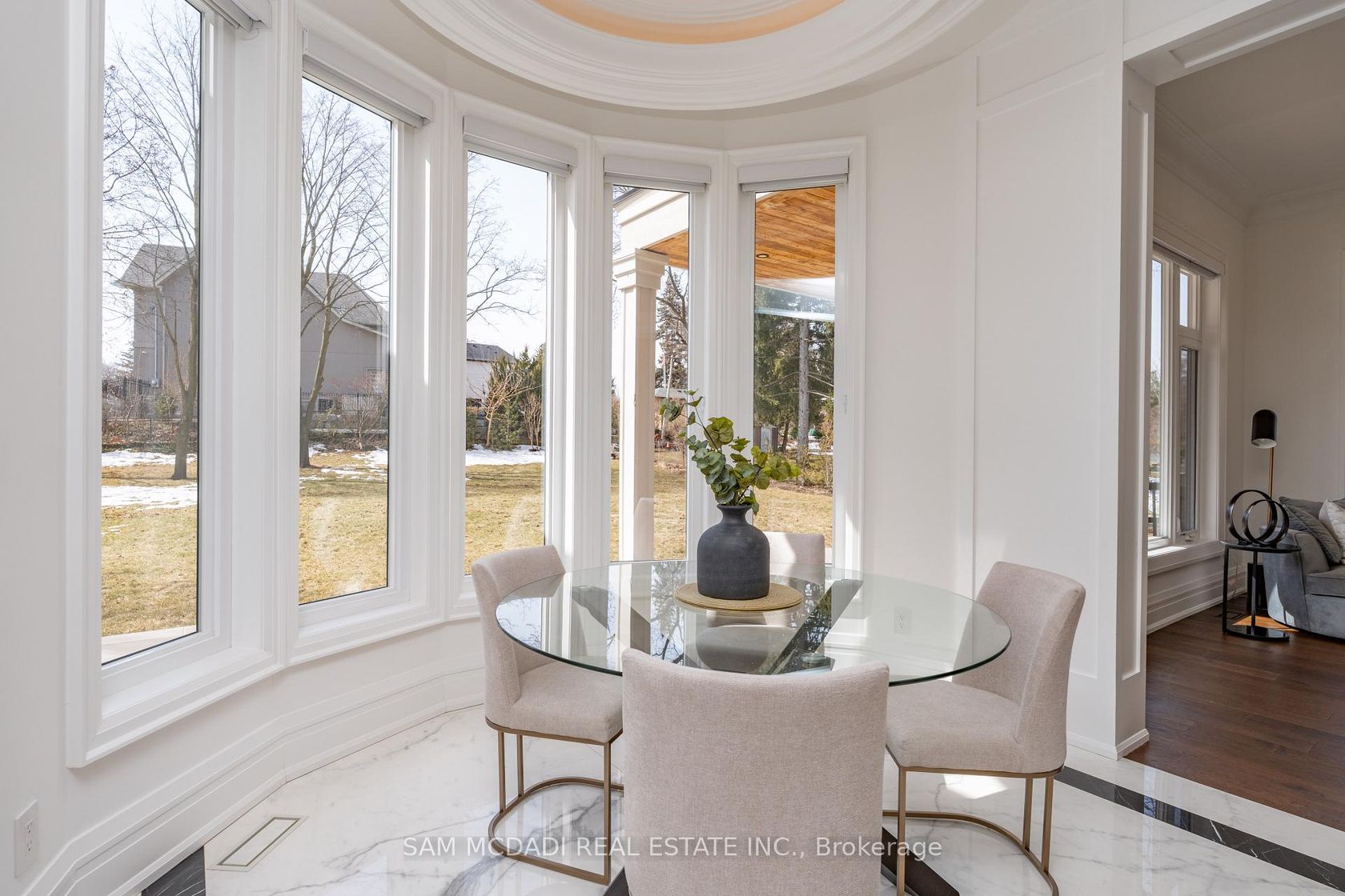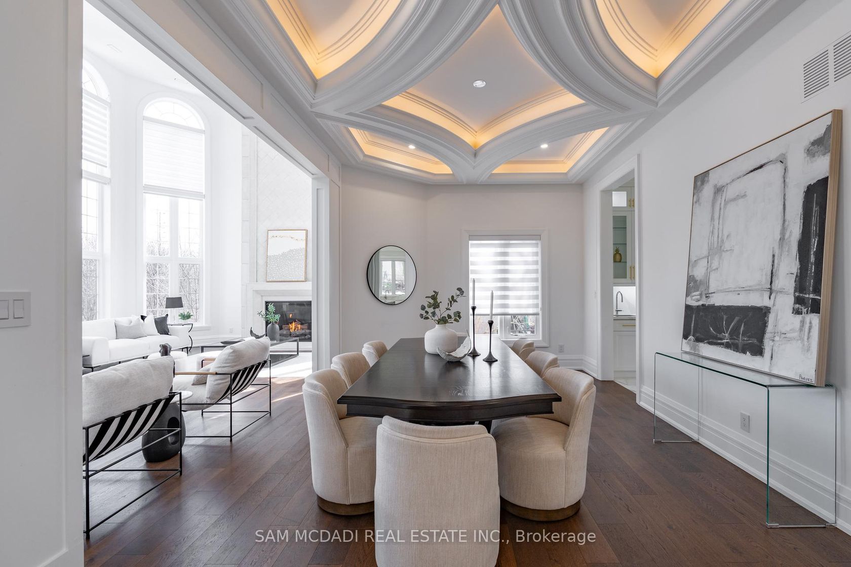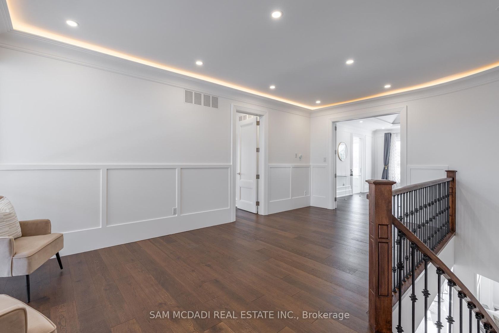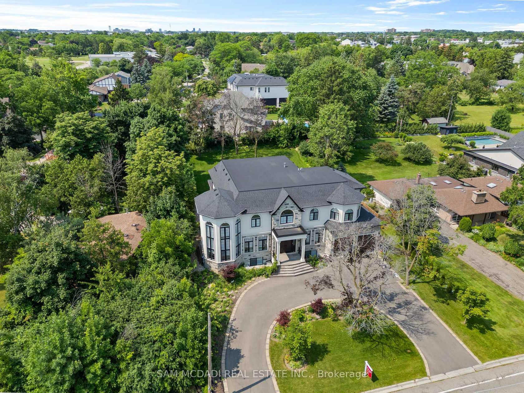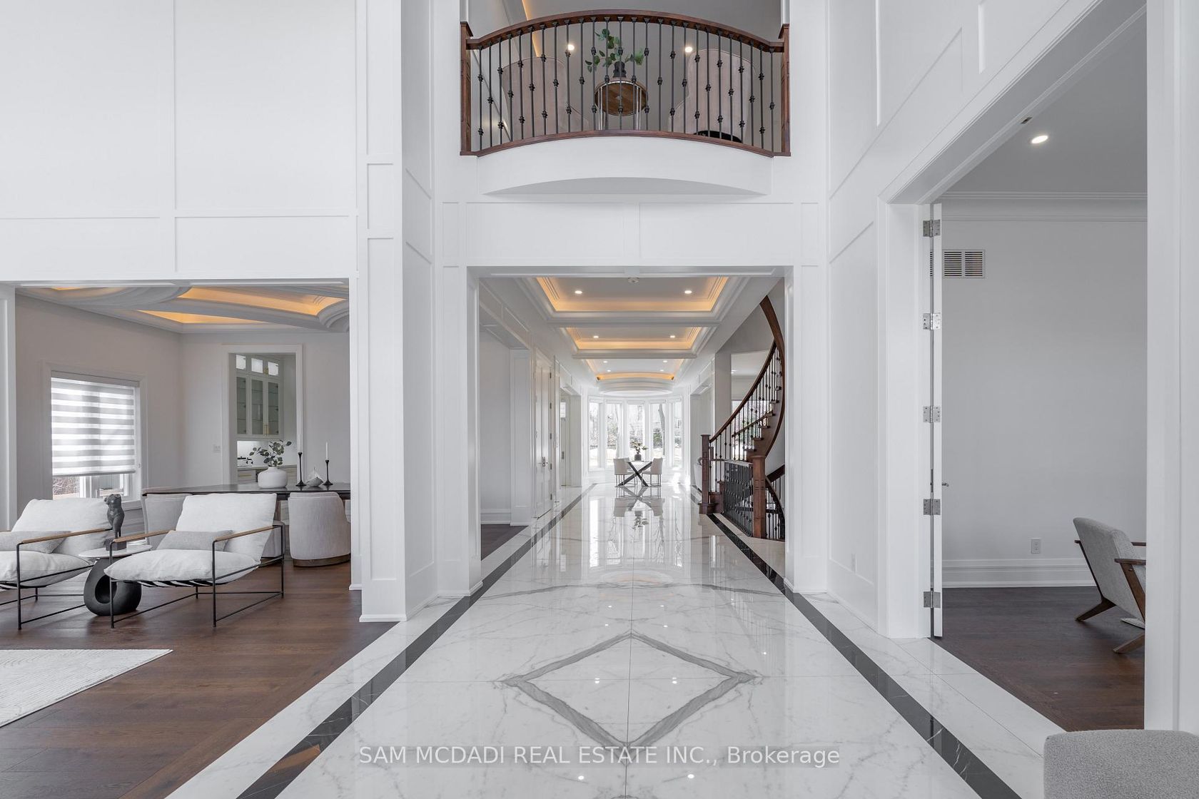 Welcome to 2554 Liruma Rd, a custom-designed estate crafted home in sought after Sheridan Homelands. This stunning residence offers over 8,700 sq. ft. of total interior space on a premium 100 x 216 ft lot, exuding elegance and grandeur at every turn. Step into a breathtaking foyer with soaring 24-ft vaulted ceilings, Marmi Fiandre book-matched slabs, exquisite wainscoting, and electric heated floors throughout. Coffered ceilings with cove lighting and strategically placed pot lights enhance the sun-filled spaces, while automatic blinds provide seamless ambiance control. The living room captivates with its 21-ft coffered ceiling and a striking cast-stone fireplace. The dining room offers a warm and inviting atmosphere, while the private office, enclosed by frosted double French doors, creates a serene workspace. The heart of the home, a gourmet kitchen features an oversized waterfall-edge island, Thermador appliances, and quartz countertops. A breakfast area opens to the backyard, seamlessly connecting to the cozy family room. Upstairs, each bedroom boasts soaring 10-ft coffered ceilings and 6" oak-engineered hardwood flooring. The primary suite is a luxurious retreat, complete with a spa-like ensuite featuring heated floors, a book-matched porcelain shower, pot lights, and a private walk-out balcony. Each additional bedroom includes its own ensuite with refined porcelain finishes. The fully finished lower level offers two additional bedrooms, two full baths, an exercise room, a recreation room, a kitchen, and a den, with direct walk-up access providing excellent potential for rental income. Completing this exceptional home is a spacious three-car tandem garage, blending convenience, comfort, and luxury. Ideally located near top-rated schools, fine dining, and major highways, this estate is a perfect blend of sophistication and modern living.