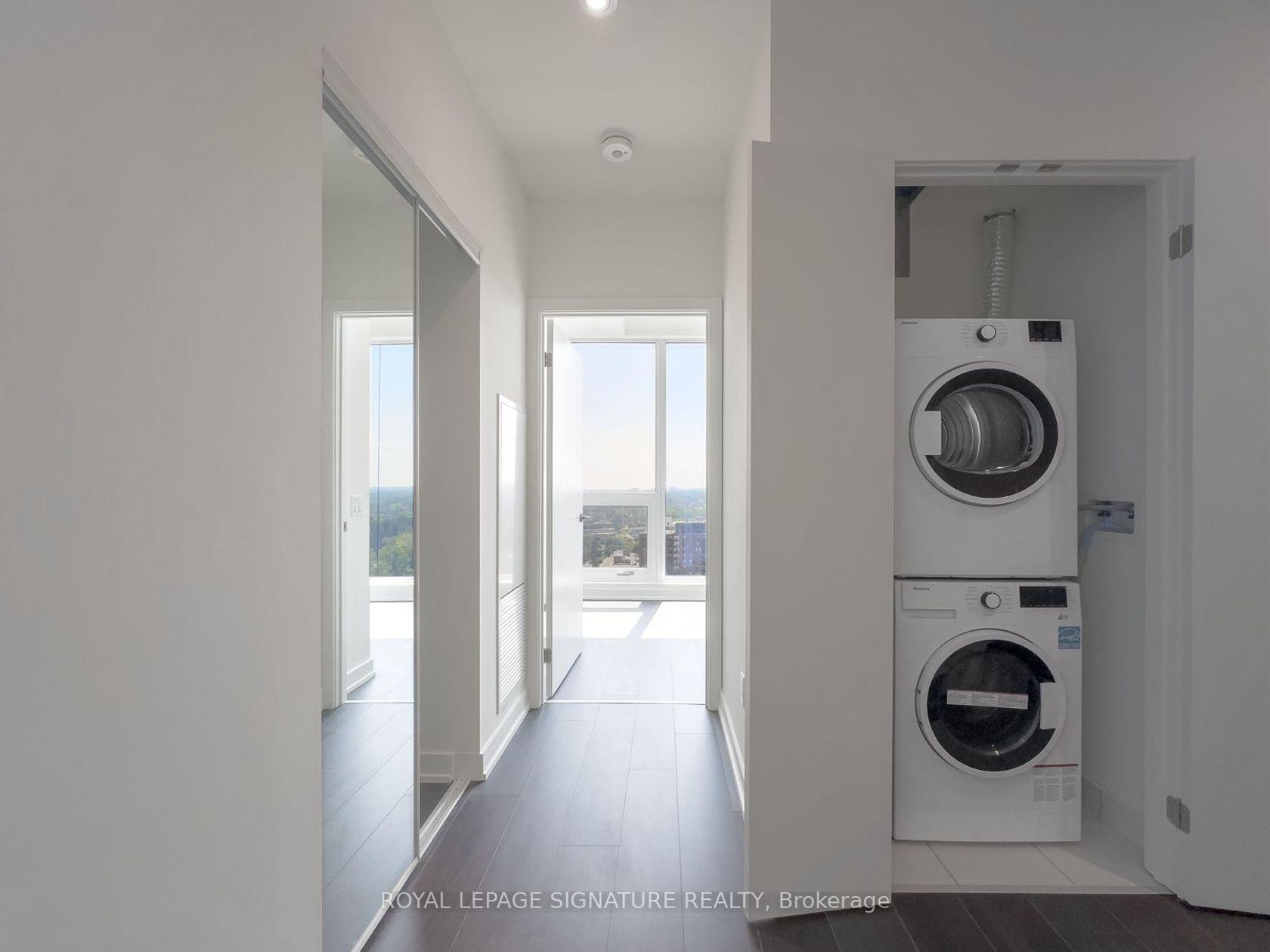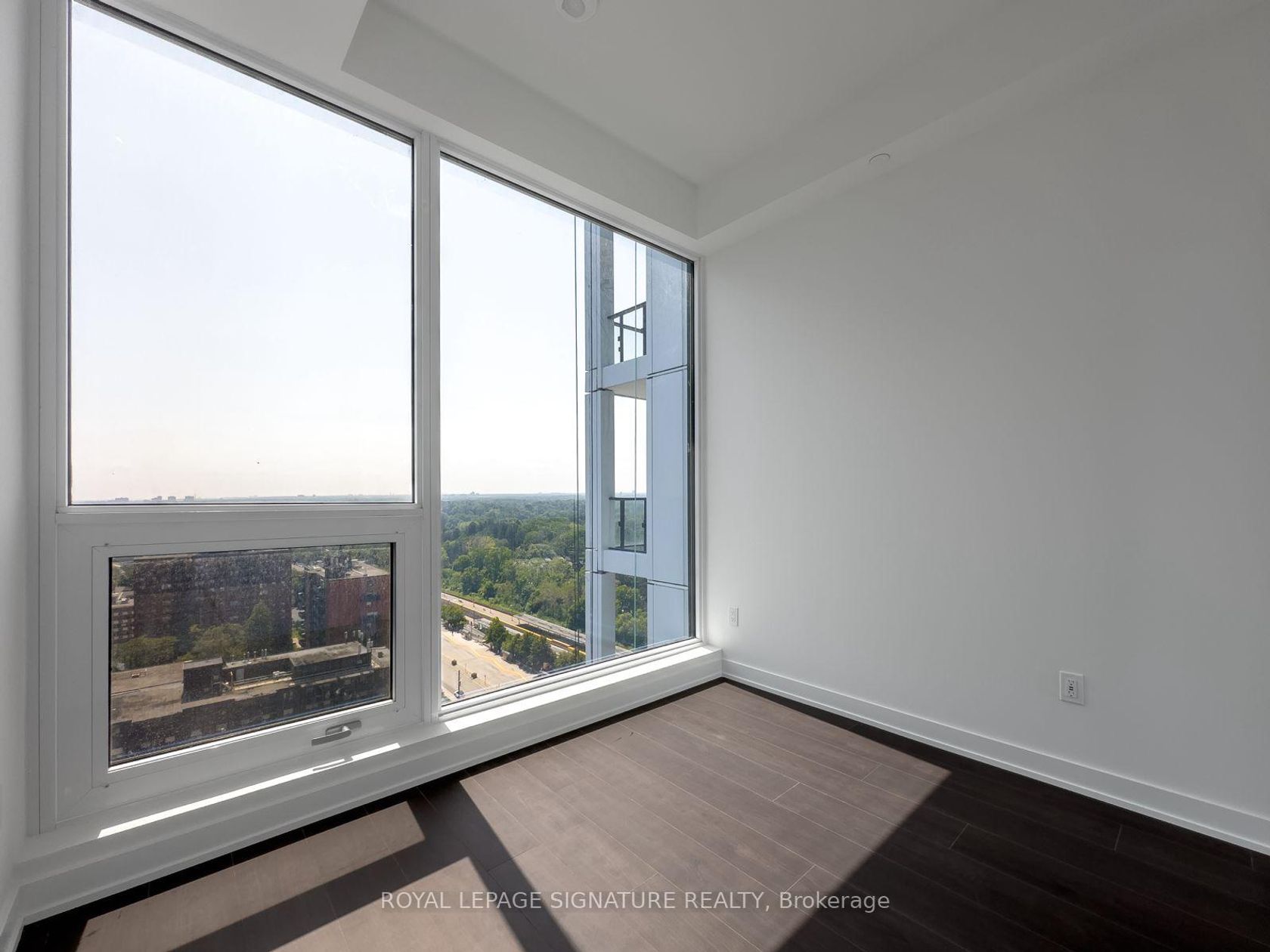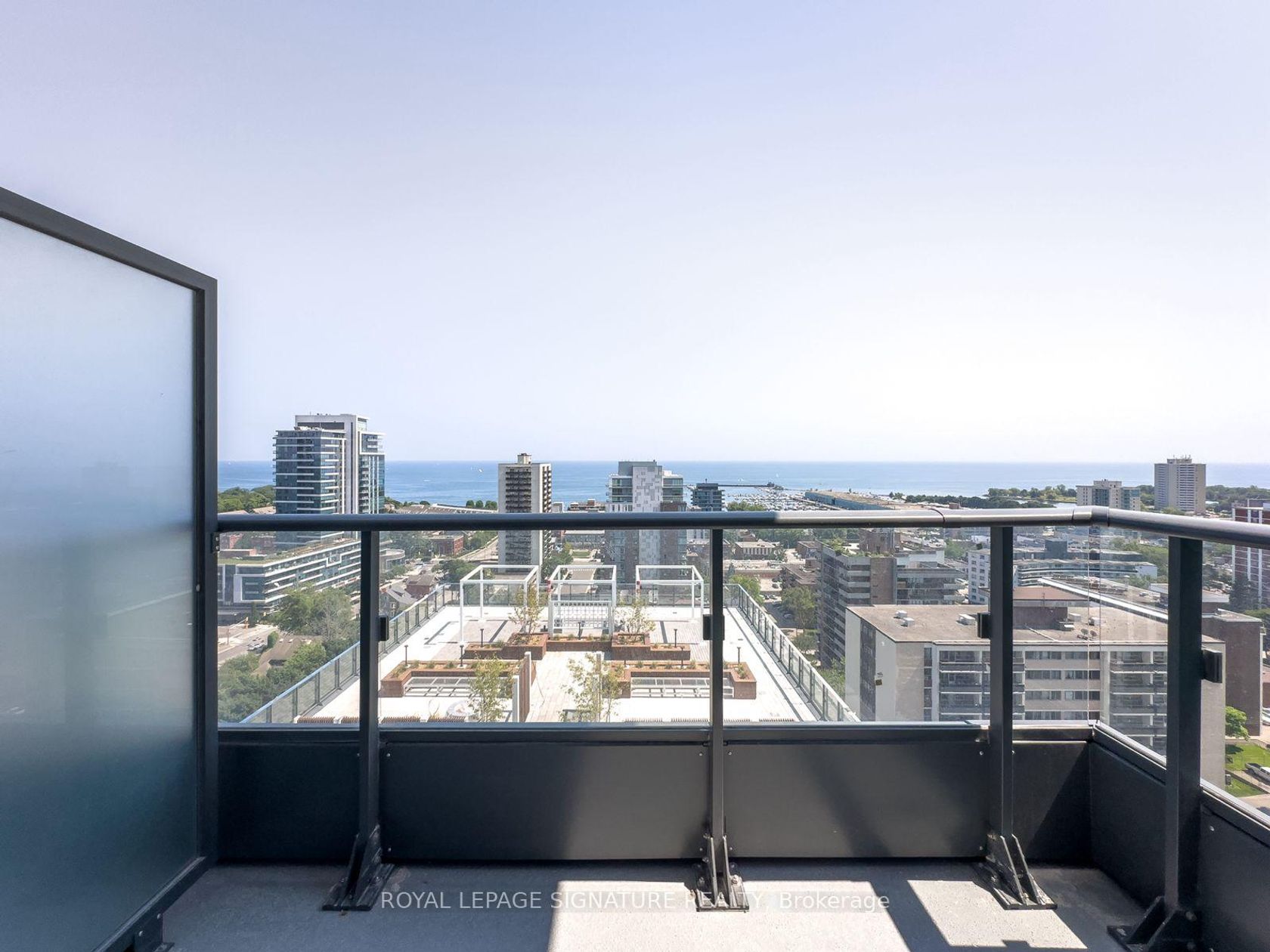 Port Credit's Westport Condos: A 2-bedroom, 2-bathroom corner suite on the 18th floor offering stunning, clear south-west views of Port Credit and the lake. This 771 sq ft unit features a desirable split bedroom layout for enhanced privacy, 10-foot ceilings, and floor-to-ceiling windows outfitted with roller blinds. The suite has an oversized terrace with south views and 2nd balcony facing west. Building amenities include a fitness area, co-working space, a rooftop deck, and gym. The location is ideal for commuters, situated next to the Port Credit GO Station (a 30-minute trip to Union Station), and is a short walk to local shops, restaurants, and waterfront parks. A storage locker and parking are included in the sale.