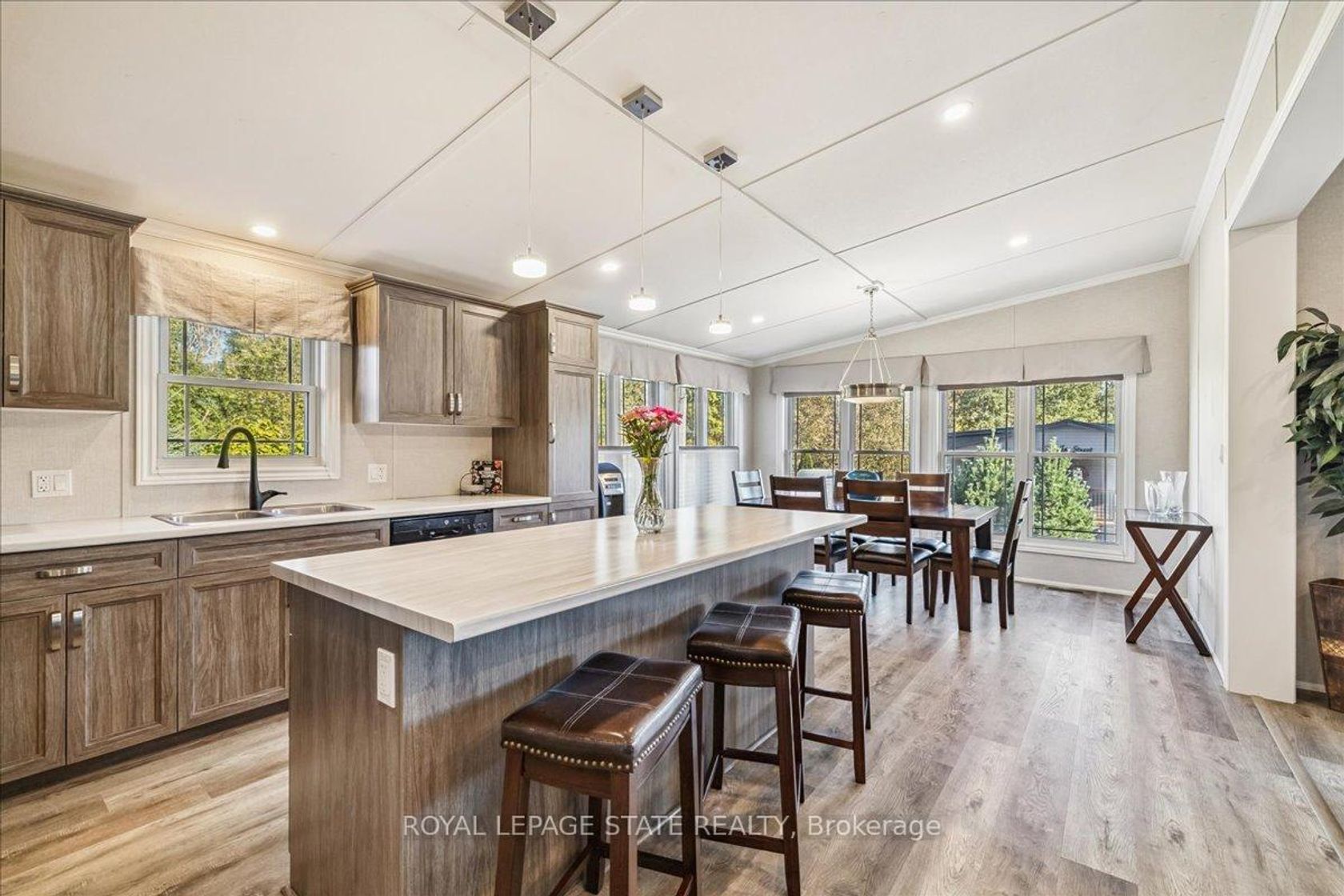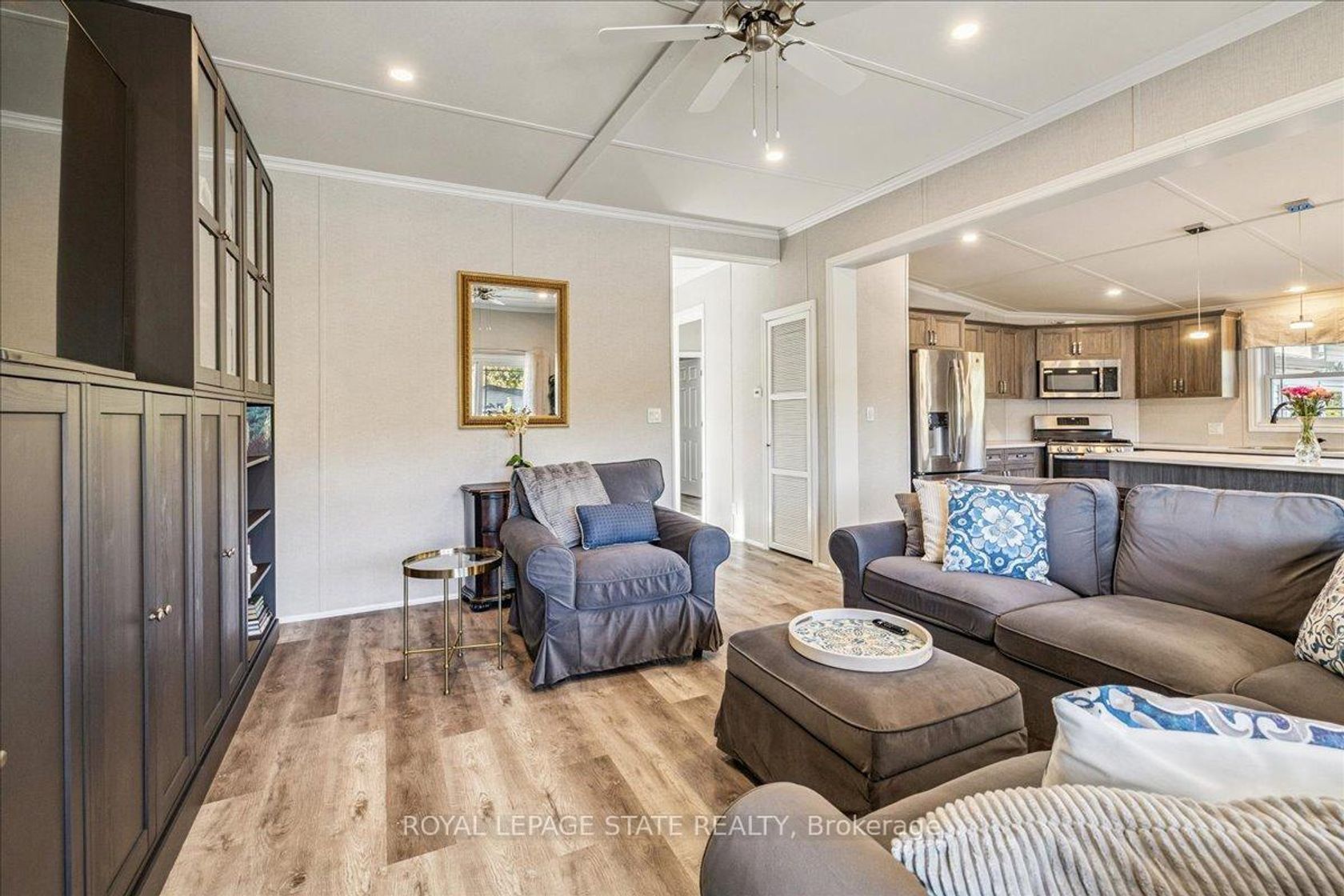 Welcome to this exceptional modular home, perfectly situated on leased land within the exclusive gated community of Lost Forest in north Burlington. Offering year-round comfort and a resort-like lifestyle, residents enjoy interior luxury and fantastic site amenities, including a seasonal pool. Step into the charming foyer and into an open-concept, single-level design, featuring soaring ceilings, and offering one of the largest spaces at 1315 Sq ft. The great room is bright and spacious with triple doors leading out to a cozy covered porch. The sunshine dinette features corner windows with eight large panels of glass. Some many things to appreciate including an upgraded kitchen with crown molding and large island, luxury vinyl floors front back, built-in wall cabinets in the great room, and bedrooms, offering tons of storage, in suite laundry and parking for three cars on the concrete driveway. Come and enjoy everything this worry-free, unique lifestyle has to offer!