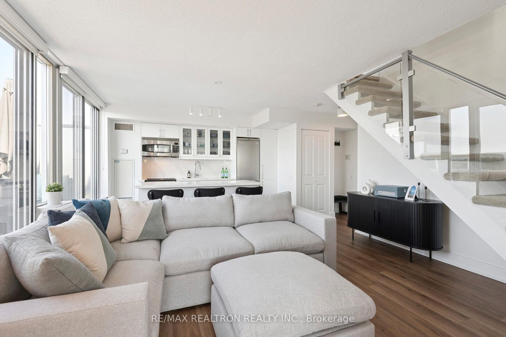 Corner-unit penthouse in the heart of Etobicoke! This modern two-storey, 1 bedroom + den suite offers 843 sq ft. of stylish living, in addition to 400+ sq ft. of outdoor space across both levels. With soaring ceilings and expansive windows dressed with custom roller blinds, the home is flooded with natural light while offering comfort and privacy. The open-concept main floor includes a sleek kitchen with stainless steel appliances and walkout to a wrap-around terrace. Perfect for entertaining or enjoying your morning coffee with unobstructed skyline views. Upstairs, the spacious primary bedroom easily fits a king-sized bed with room for a seating area or lounge space, plus a private balcony for a quiet retreat. The versatile den is ideal for a home office, guest space, or creative studio. Enjoy access to top-tier amenities including 24-hr concierge, gym, indoor lap pool, sauna, and party room. One underground parking spot included. Conveniently located steps to Cineplex, Costco, restaurants, shops, and public transit, with easy access to the Gardiner and Hwy 427 for a quick downtown commute. Custom roller blinds (2023), upgraded finishes, new flooring & cabinetry (2022).