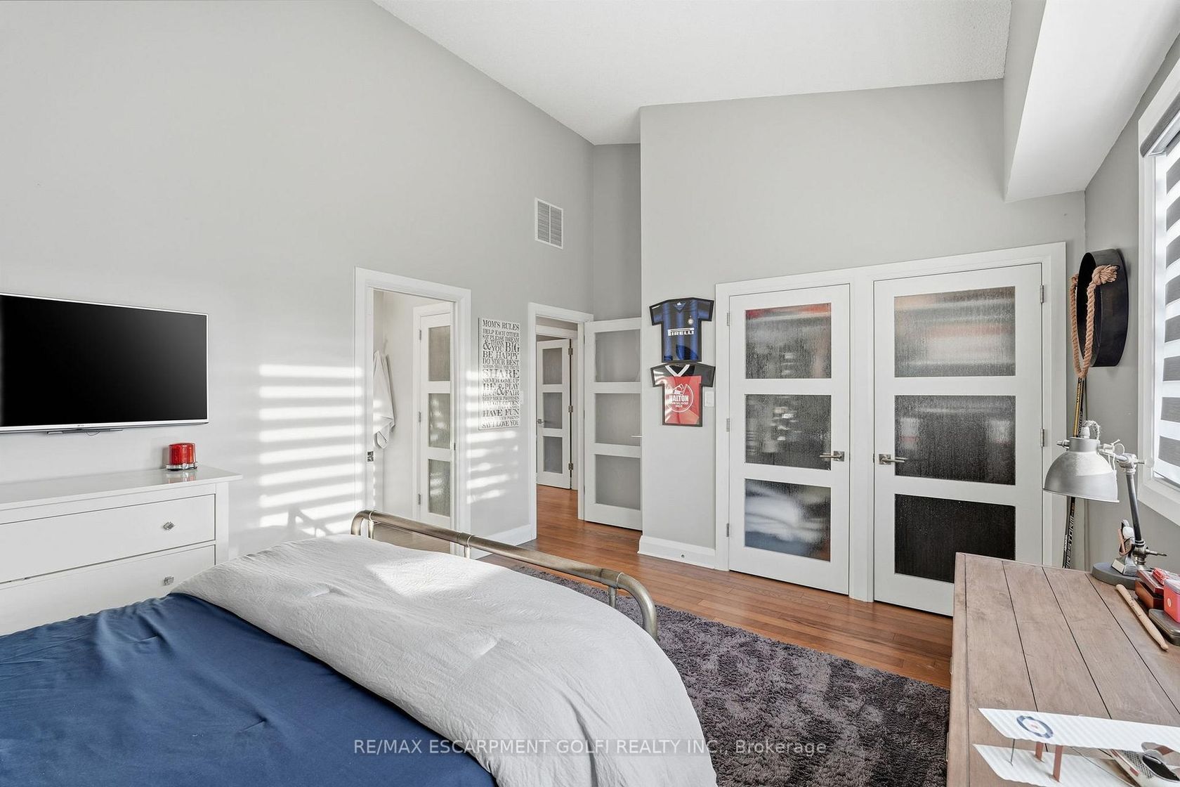Exceptional executive townhome in The Terraces on New Street. Sun-filled great room with soaring 15.5' cathedral ceilings and gas fireplace. Rich hardwood flooring throughout. Chef-inspired kitchen with quartz counters and generous peninsula. East-facing terrace perfect for morning coffee or entertaining. Two main floor bedrooms, each with full bath. Primary suite features a spa-like 5pc ensuite, walk-in and walk-through closets. Second bedroom with ensuite privilege to 4pc bath. Convenient main-floor laundry. Fully finished lower level with full bath, additional walk-in closet with built-ins, multiple storage closets, and versatile space ideal for gym, office, or guest suite. All new windows replaced in 2024. Inside garage entry, ample storage, and maintenance-free living. Steps to downtown Burlington, the lake, schools, parks, and shopping. A rare turnkey opportunity in a sought-after location.