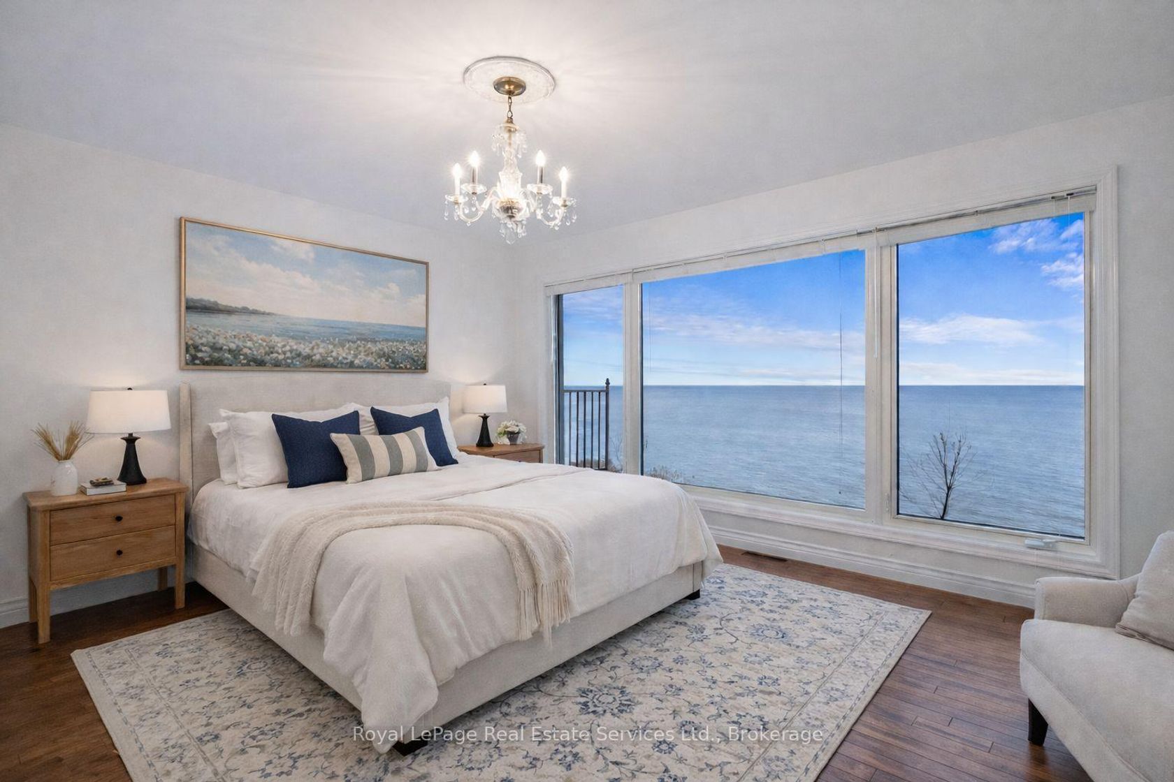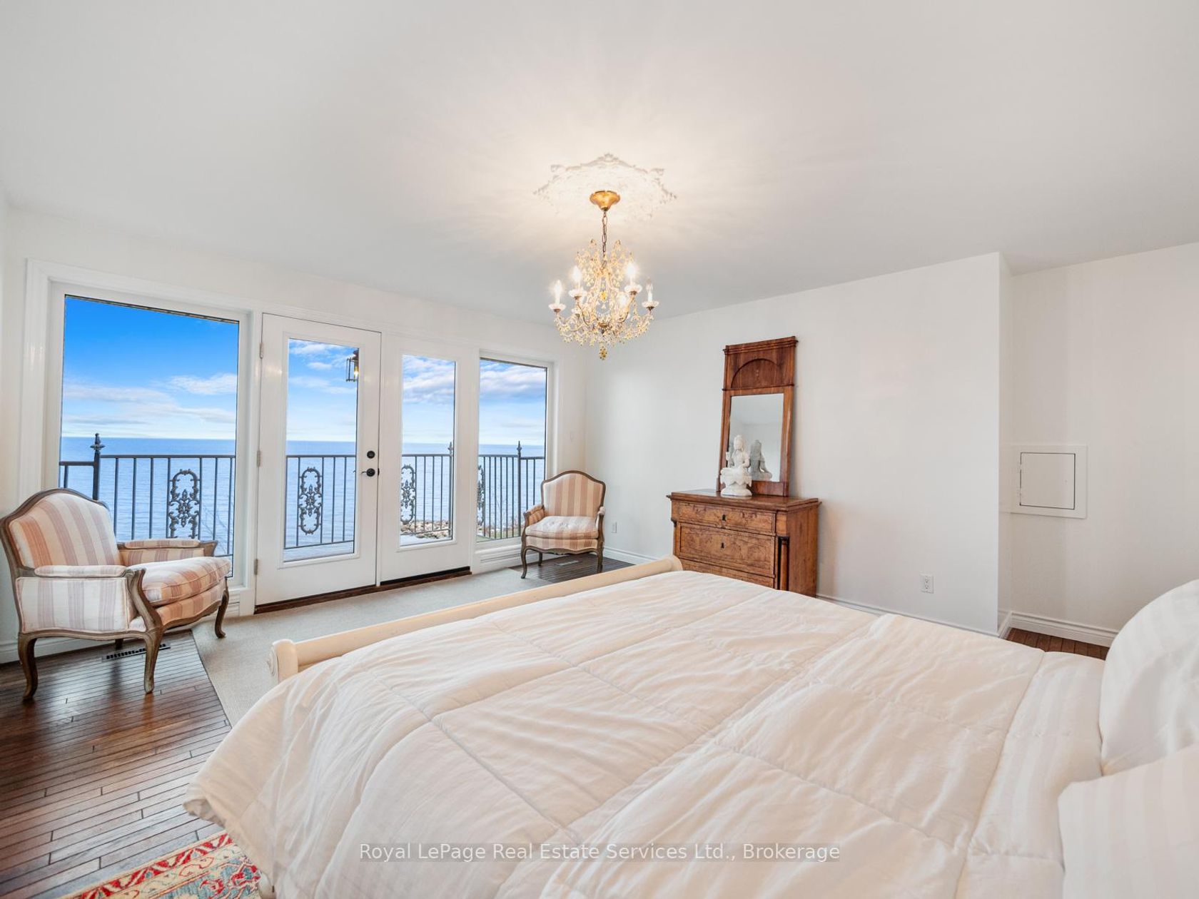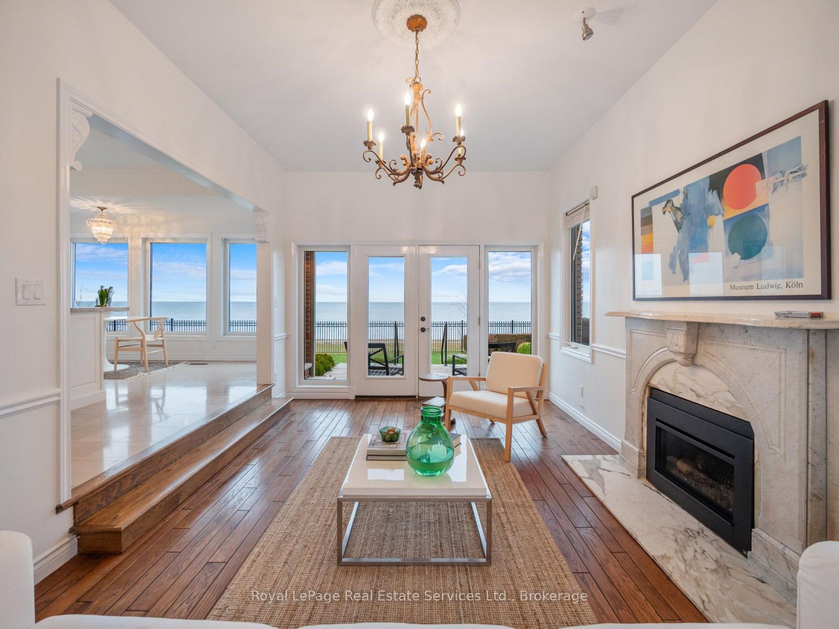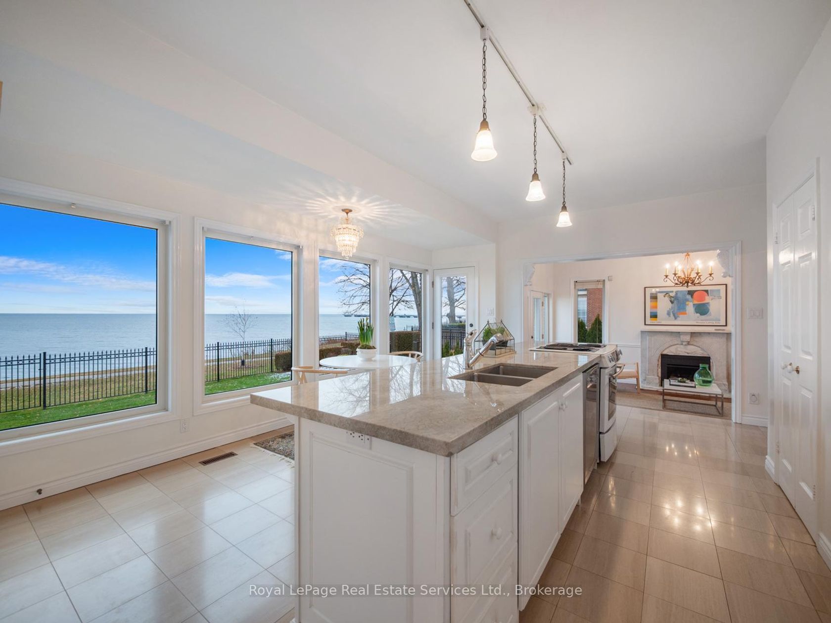 Spectacular lakefront property with 93' frontage on Lake Ontario. Located on a quiet, mature cul-de-sac, this custom built, family home offers 4+1 Bedrooms, 3.5 Baths with over 2800SF above-grade + 1400 SF Finished Lower Level. Architecturally designed with wall-to-wall windows overlooking the lake, solid brick construction with clay tile roofing, this home was built to last. 9' and 10' ceilings on the main floor. Oak hardwood floors throughout both levels. Grand entrance foyer with oak staircase. Beautiful Living Room with fabulous marble fireplace surround with gas insert open to Dining Room with wall to wall patio doors to the terrace with incredible lake views. Fabulous Kitchen/Breakfast Room is a blank canvas with the perfect space to install the waterfront Kitchen of your dreams. Walk-outs to both decks and open to the the Family Room with stunning marble fireplace with gas insert. The main floor features a mudroom with side entry and inside entry from full-sized two-car garage. The Primary suite features oversized windows and a walk-out to second floor balcony with outstanding lake views, luxury ensuite bathroom and walk-in closet. Two more Bedrooms overlook the lake with oversized windows. The front Bedroom opens to a bonus room above the garage which could be handy as a Den or quiet retreat. The Lower Level has excellent ceilings height, good windows and features one Bedroom, a 3-Piece Bathroom, Recreation Room, Den, Laundry Room, storage and more. Beautifully landscaped and maintained property fully fenced with wrought iron gate access to the lake. Cobblestone driveway accommodates 4 cars. Outstanding value on Lake Ontario. A must see!