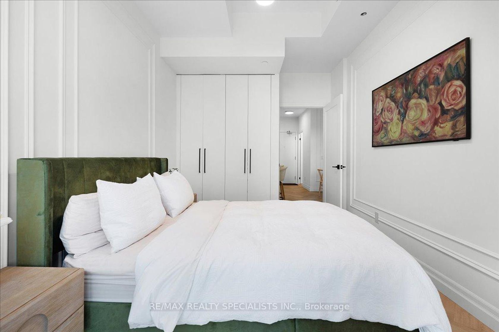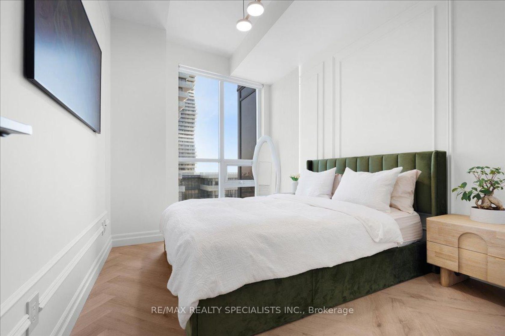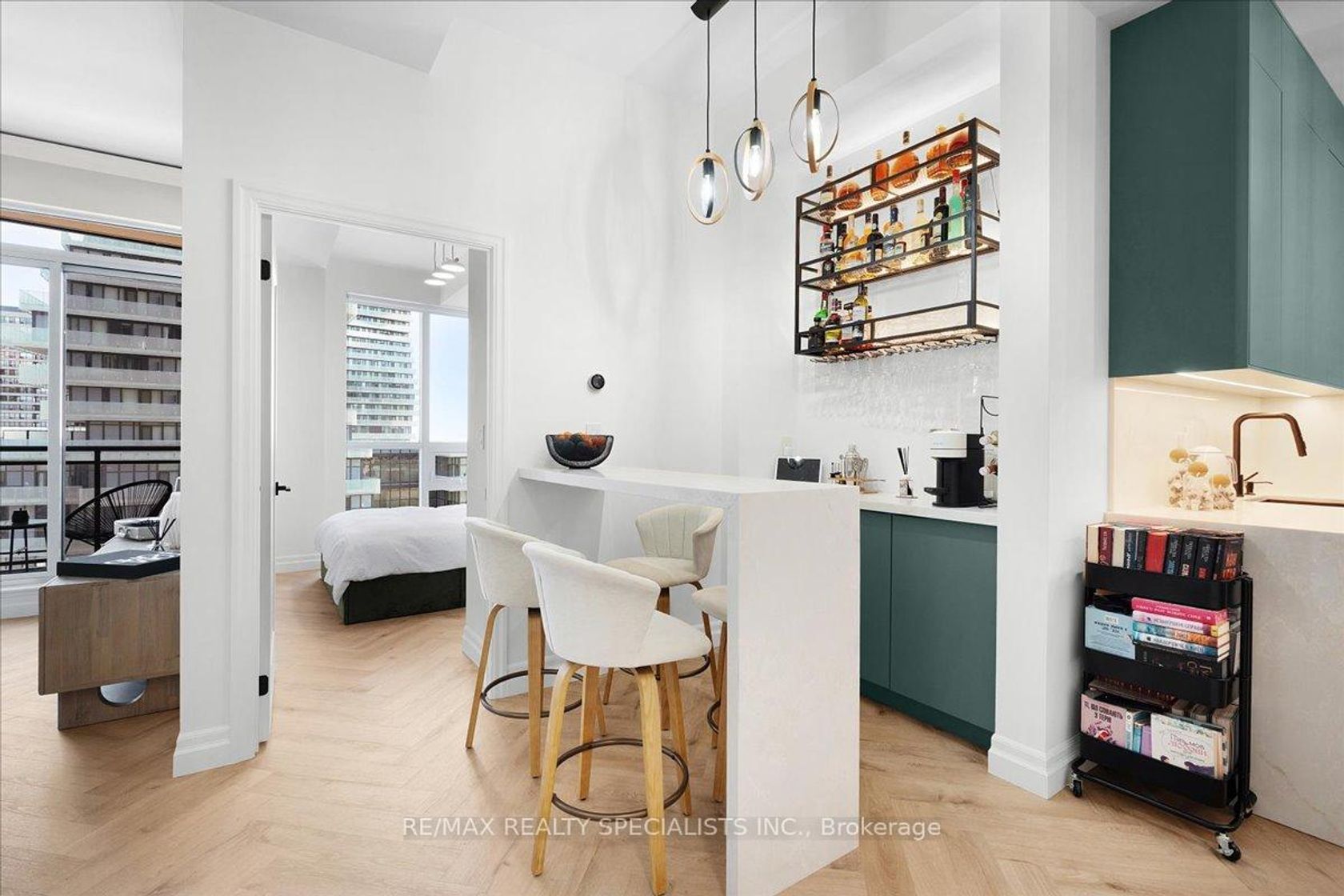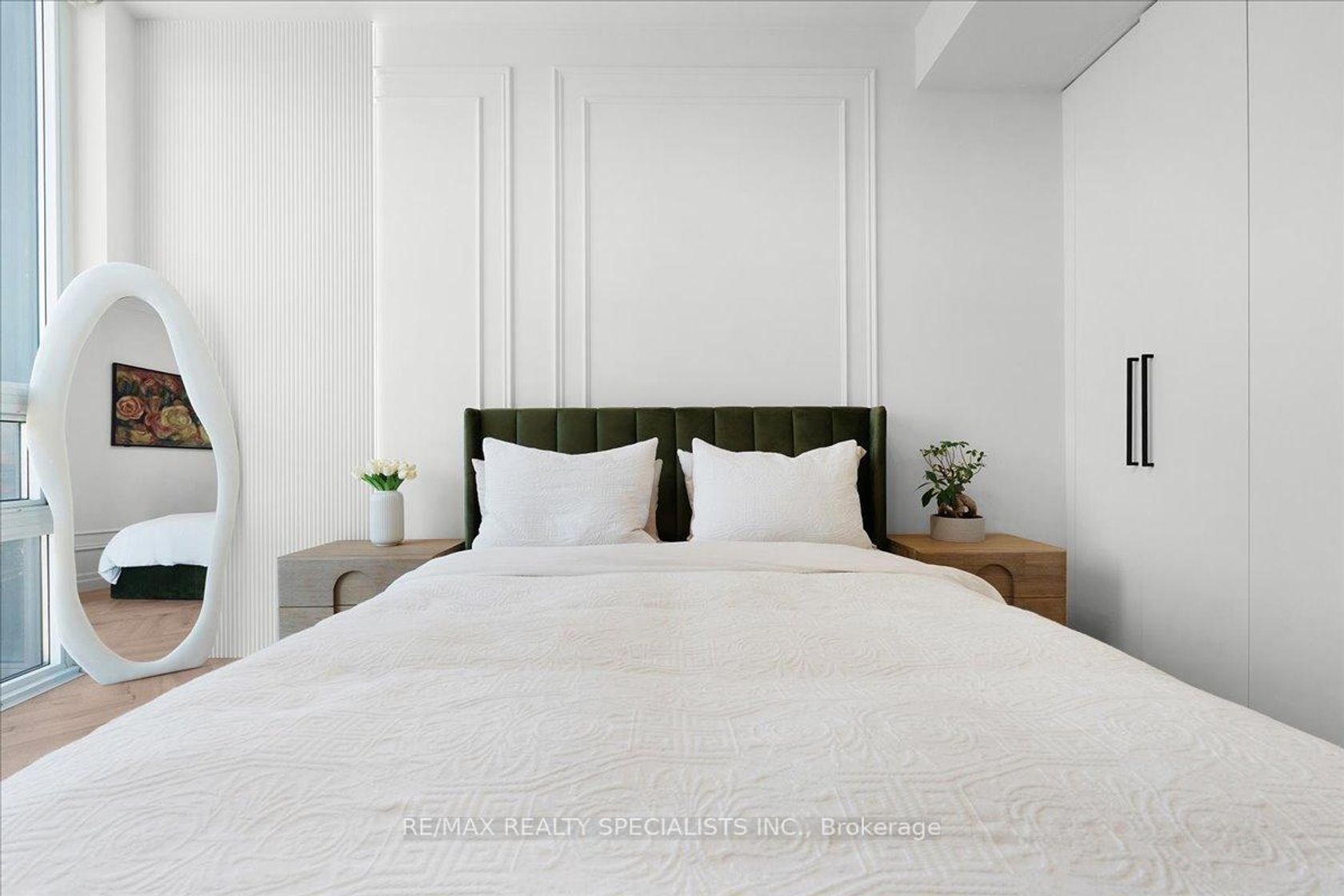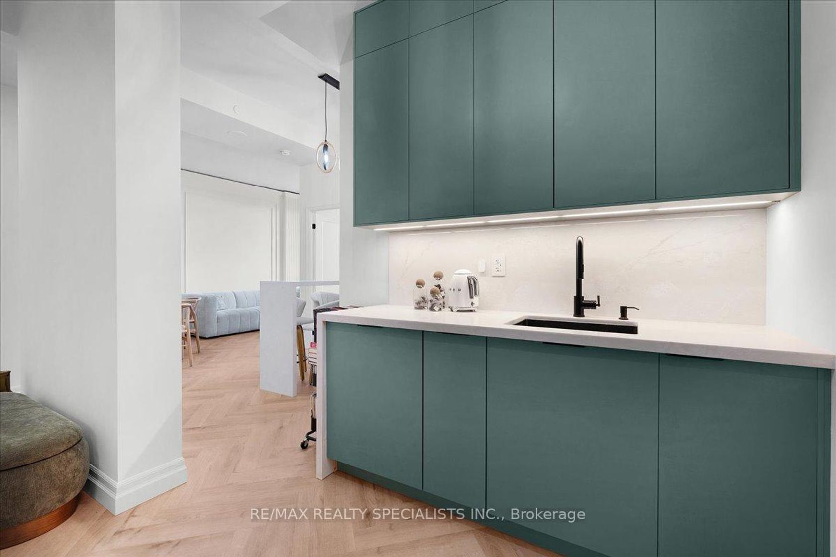 Welcome to a residence completely transformed by a high-end, custom renovation. This rare 1 bed + den, 1 bath suite is now a turnkey luxury smart home, presenting unparalleled style in Mississauga's City Centre. Step into a sophisticated space featuring 10-foot ceilings and herringbone-pattern LVP flooring with soundproofing. The unit is unified by striking architectural details, including custom applied millwork (wainscoting) and elegant floating crown moulding with integrated LED cove lighting throughout. This fully integrated smart home provides control over every detail, including a full smart lighting system and advanced water shutoff sensors for peace of mind. The redesigned kitchen is a showpiece, featuring bespoke full-height flat-panel cabinetry, fully integrated panel-ready appliances (fridge/dishwasher), and stunning engineered quartz countertops with a matching full-height slab backsplash. The versatile den boasts a custom beverage station with a beautiful quartz waterfall countertop and LED-lit bar, perfect for entertaining. The primary bedroom is a sophisticated retreat featuring a custom fluted and wainscoted accent wall and a floor-to-ceiling wardrobe with an integrated pull-out valet/accessory tray. The spa-inspired bath includes a wall-mounted floating vanity and a dramatic smoked glass shower screen. Enjoy southeast exposure from the private balcony, upgraded with interlocking composite deck tiles. Includes a highly convenient locker on the same floor and garage parking. Located steps from Square One, transit, and major highways, this unit offers the ultimate combination of custom luxury and urban accessibility.