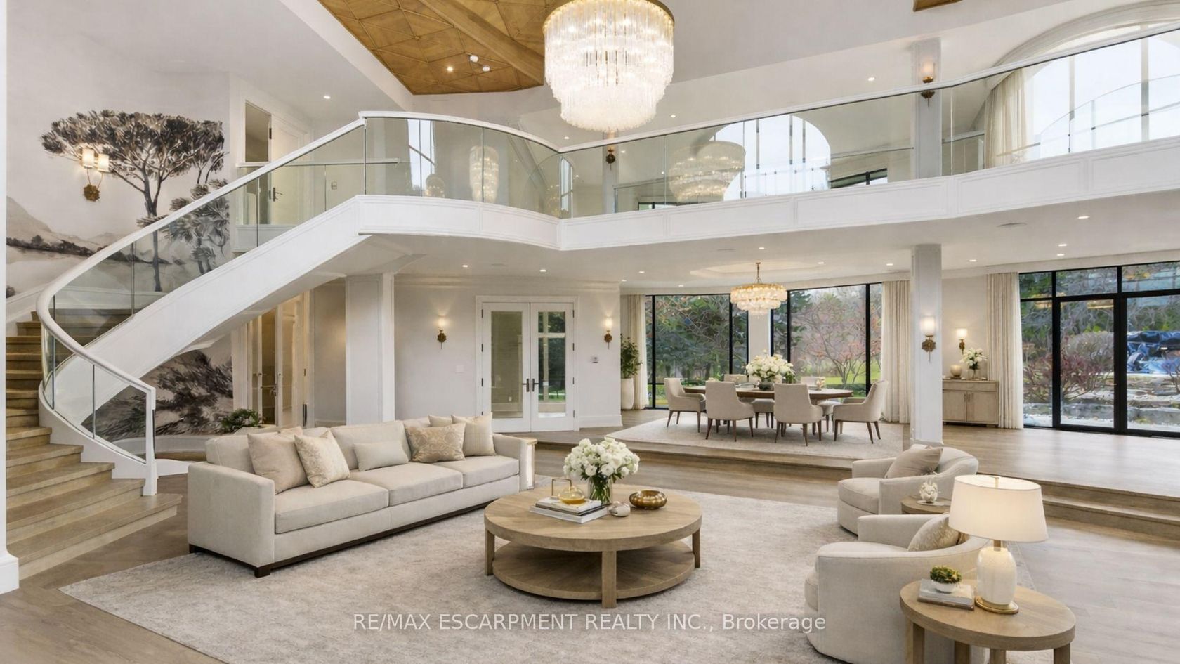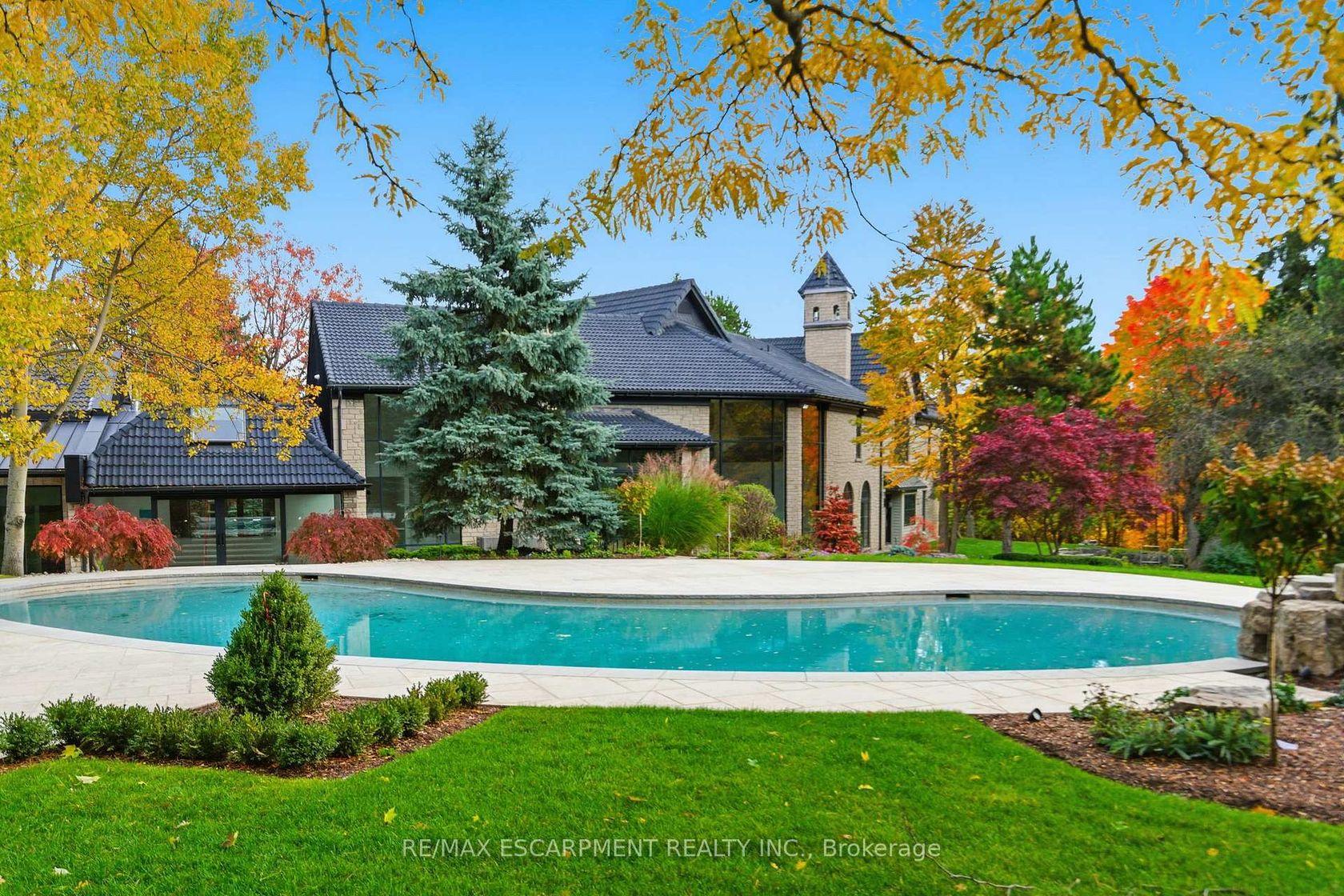 An extraordinary custom-built Country Estate set on 10.5 acres of picturesque, park like grounds, offering unmatched privacy and bespoke amenities. This Masterfully Crafted residence features soaring ceilings, White Oak Herringbone and wide-plank flooring, and exceptional Millwork throughout. A dramatic two-storey foyer opens to elegant principal rooms with 16-foot windows, French doors and panoramic views of rolling hills, a private pond and the Niagara Escarpment.The grand chef's kitchen is designed for entertaining, complete with quartzite countertops, premium Sub-Zero, Wolf and Miele appliances, a walk-in pantry, servery and custom wine storage. The home offers six bedrooms, including a luxurious Primary retreat with Cathedral ceilings, gas fireplace and Spa-inspired ensuite. A Private Nanny suite with additional bedroom and 3 piece washroom, with a separate entrance adds flexibility. Resort-style amenities include an indoor spa with pool, Whirlpool, Cold plunge, Saunas and steam room, plus an outdoor pool with waterfall overlooking the tennis court, stable and orchard. Radiant heated floors, integrated sound and security systems, a four-car garage and expansive parking complete this exceptional offering. All just minutes to amenities and Highway 407.