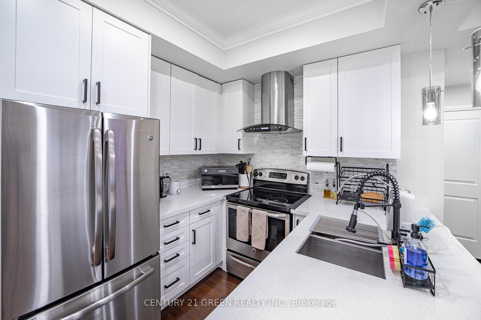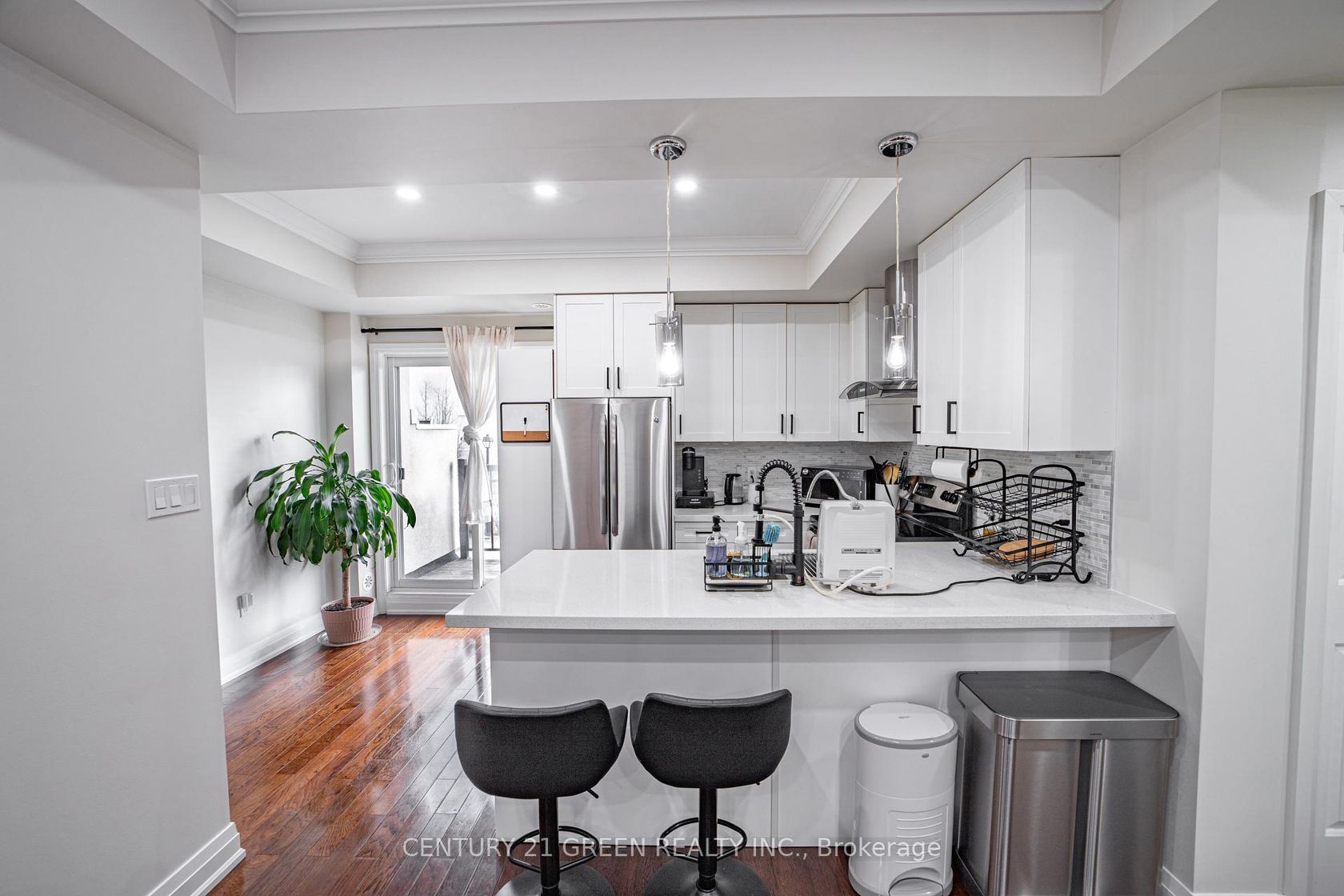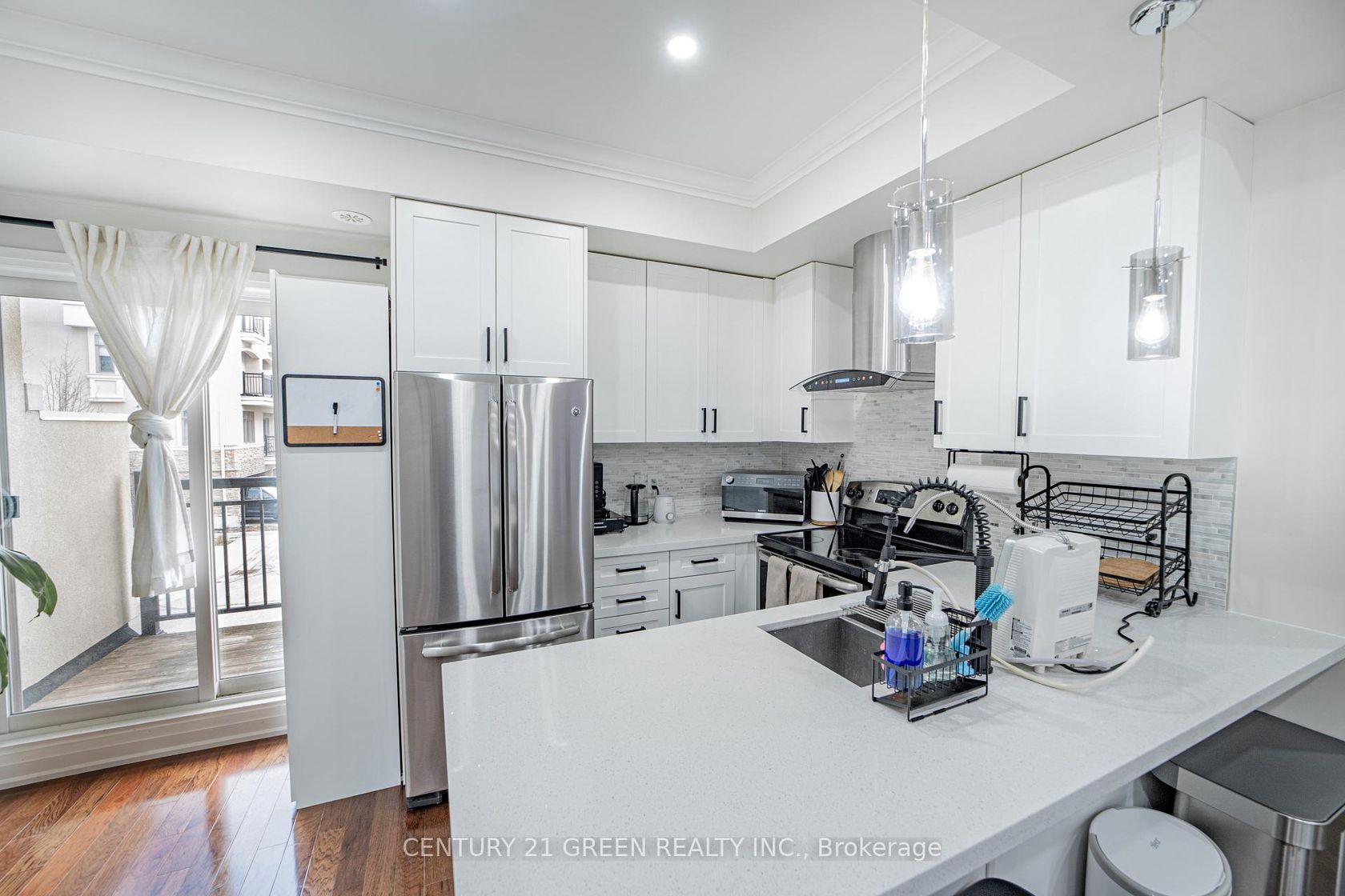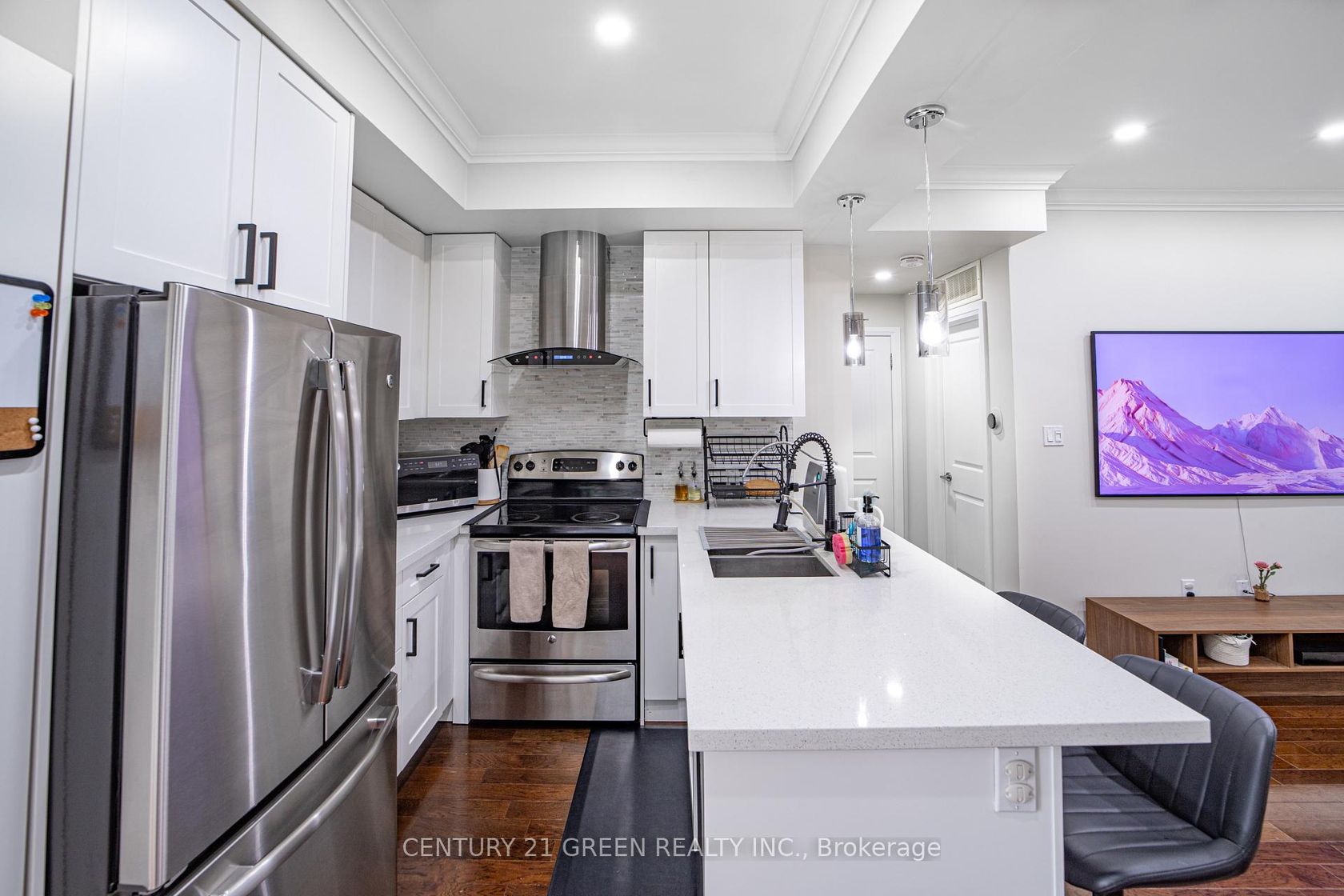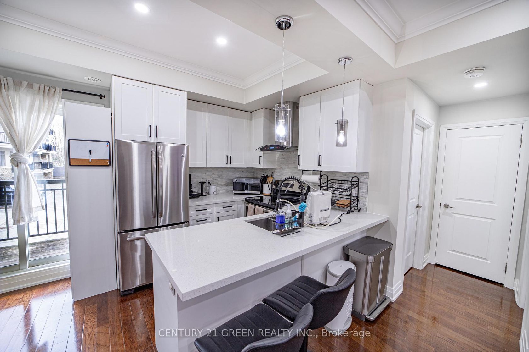 Executive living at its finest. Beautiful and functional 1-storey townhouse offering a spacious open concept layout with high ceilings and plenty of natural light. The main living area flows seamlessly into the kitchen featuring a breakfast bar, perfect for entertaining or everyday living. This luxury 1 bedroom, 1 bathroom home features a stunning marble bathroom and high end finishes throughout. Enjoy approximately 800 sq ft of combined indoor and outdoor living space in a well maintained unit designed for comfort and convenience. Includes ensuite washer and dryer plus rare 2 car parking with one driveway space and one built-in garage. Excellent location with easy access to Hwy 403, 401, 410 and the QEW, Convenient public transit with one bus to the subway. Status certificate available. Perfect for first time buyers, professionals or investors looking for a stylish and low maintenance home in a great location.