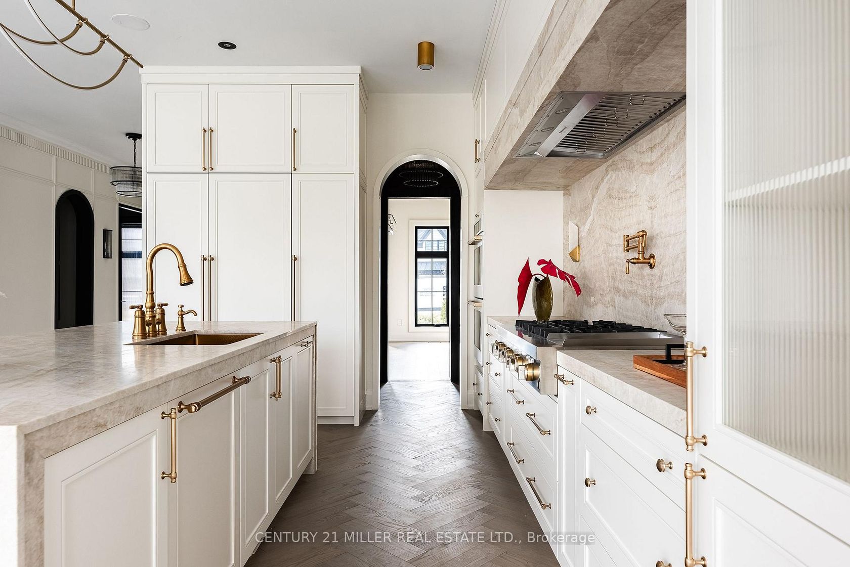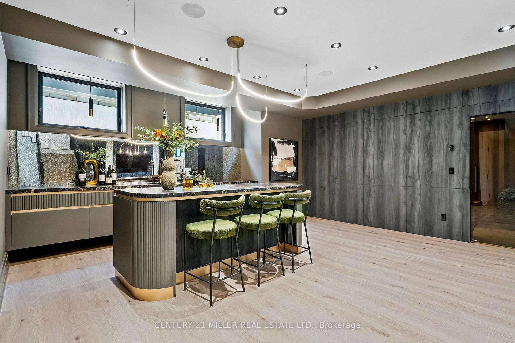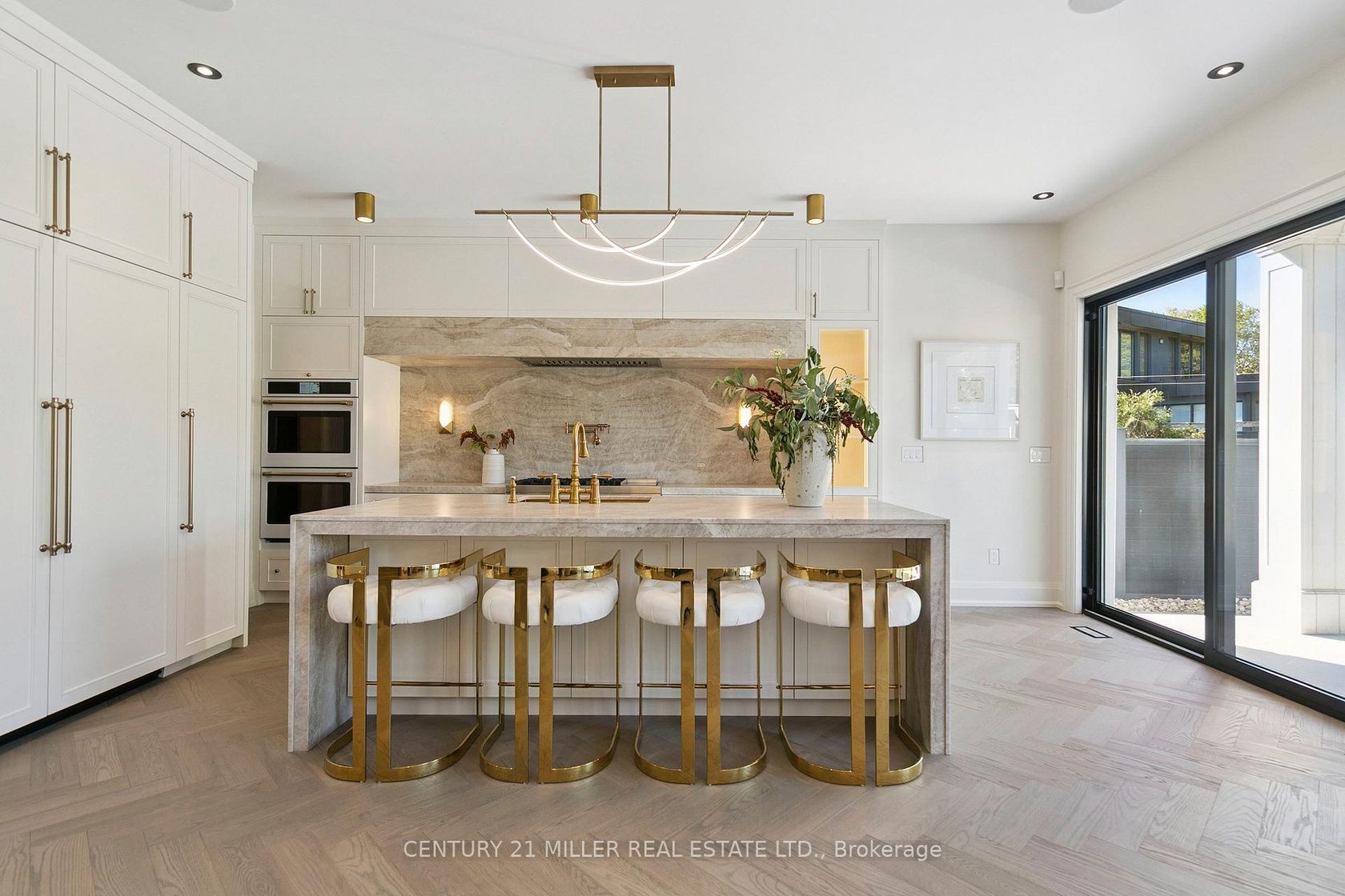 Stunning home upgraded and finished to the highest level, with French Chateau-inspired curb appeal and landscaped grounds. Luxurious finishes and attention to detail throughout. Big, bright windows, custom cabinetry, wall paneling and mouldings, curated stone and tile selections, hardwood herringbone flooring, integrated vents, and a skylight over the central staircase. Interior design by Mia Coroza. Landscaping by Kanawi Landscaping, with top trades from across the GTA. Mirage engineered oak flooring in herringbone. Red oak stairs with wrought iron railings by Deluxe Stairs. A beautifully appointed kitchen features leathered Taj Mahal natural stone quartzite countertops and island. Walk through the servery with walk-in pantry to the dining room with a built-in wine rack. The two-storey great room offers massive windows, a matte porcelain fireplace surround, and a custom ethanol fireplace. A stylish office includes French door entry, built-in wall unit, and sconces. All four bedrooms feature private ensuites. The primary suite includes a fireplace, walk-in closet with custom organizers, and an ensuite with heated floors, designer plumbing fixtures, stand-alone tub, and dual sinks. A laundry room is equipped with LG front-load washer and dryer. Each additional bedroom offers its own design, with closets featuring sensor lighting. Nine-foot ceilings and large window wells enhance the lower level. A bar area features leathered Titanium Gold natural stone quartzite countertops. The home theatre is positioned beneath the garage. Additional spaces include a home gym with custom mats, fifth bedroom, three-piece bath with curbless shower, and rec room. White cedar sauna completes the level. Walk out from the kitchen to a covered porch overlooking grounds inspired by a European garden, with fountains finished in exterior porcelain, landscape lighting, and a cabana with water and gas roughed-in. Aluminum composite fencing and a walk-up from the basement complete this setting.