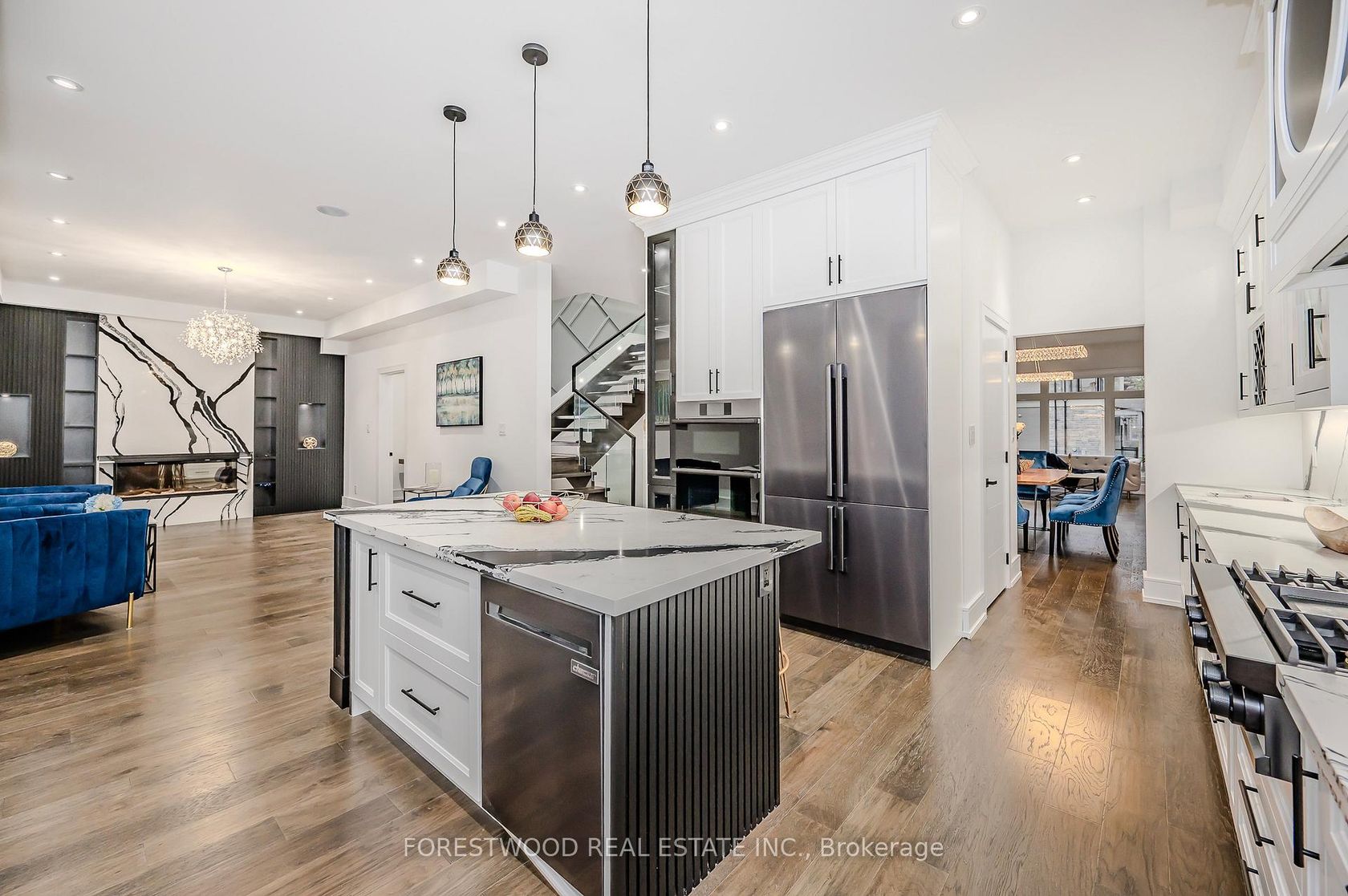 Once in a lifetime opportunity to own a custom built residence with nearly 5,000sqft of luxuriously finished living, 5+2 BEDROOMS & 7-BATHROOMS perfectly situated on a private court in a prestigious neighborhood. The home features a grand stone and brick exterior that opens into an interior defined by timeless design and high-end finishes. The main level offers a sophisticated open-concept living and a formal dining area. At the heart of the home, the stunning modern kitchen with masterful carpentry is lavished with upscale appliances, a large center island, premium quartz countertops, and a matching backsplash. An adjacent breakfast room provides a seamless walk-out to an oversized patio, while the spacious family room offers a comfortable retreat anchored by a classic fireplace. This level also includes a private separate office for professional needs and a functional mudroom with a convenient side entrance. A spectacular staircase, illuminated by a soaring skylight, leads to the upper floor. The primary bedroom serves as a luxurious sanctuary, featuring coffered ceilings, a stunning fireplace, and a walk-out to a private balcony. Its spa-like five-piece ensuite bathroom is finished with heated floors and designer tiles. A massive walk-in closet complete with custom organizers and a second skylight. Every additional bedroom on this level is designed with privacy in mind, as each includes its own dedicated ensuite bathroom. Each Of The Additional Four Bedrooms Have Private Ensuite Bathrooms With Three Walk-In Closets And One Large Closet. A generous laundry room finishes the upper level. The expansive lower level further enhances the living space with a large open-concept great room that features a fireplace and a walk-out to a private patio and backyard oasis. A custom bar and a secondary kitchen, a full bathroom, and the sixth and seventh bedrooms complete the lower level. This is a rare opportunity to own a masterfully crafted residence!