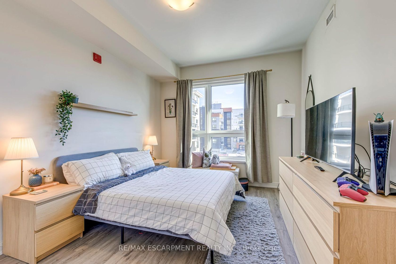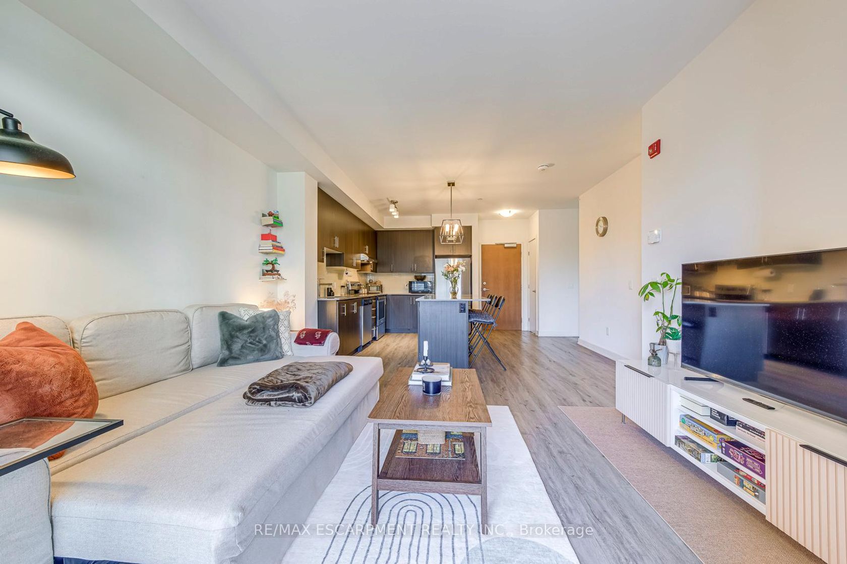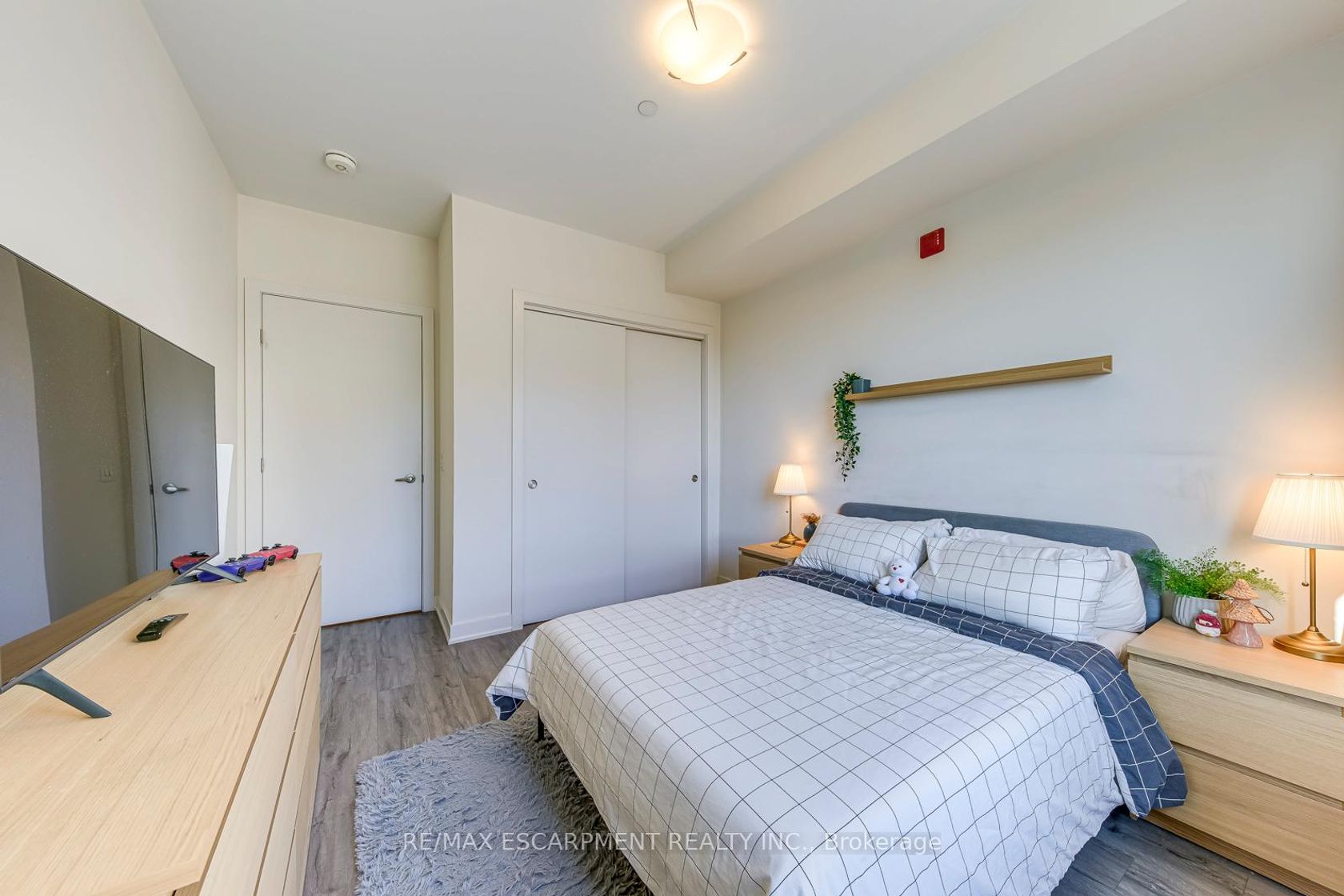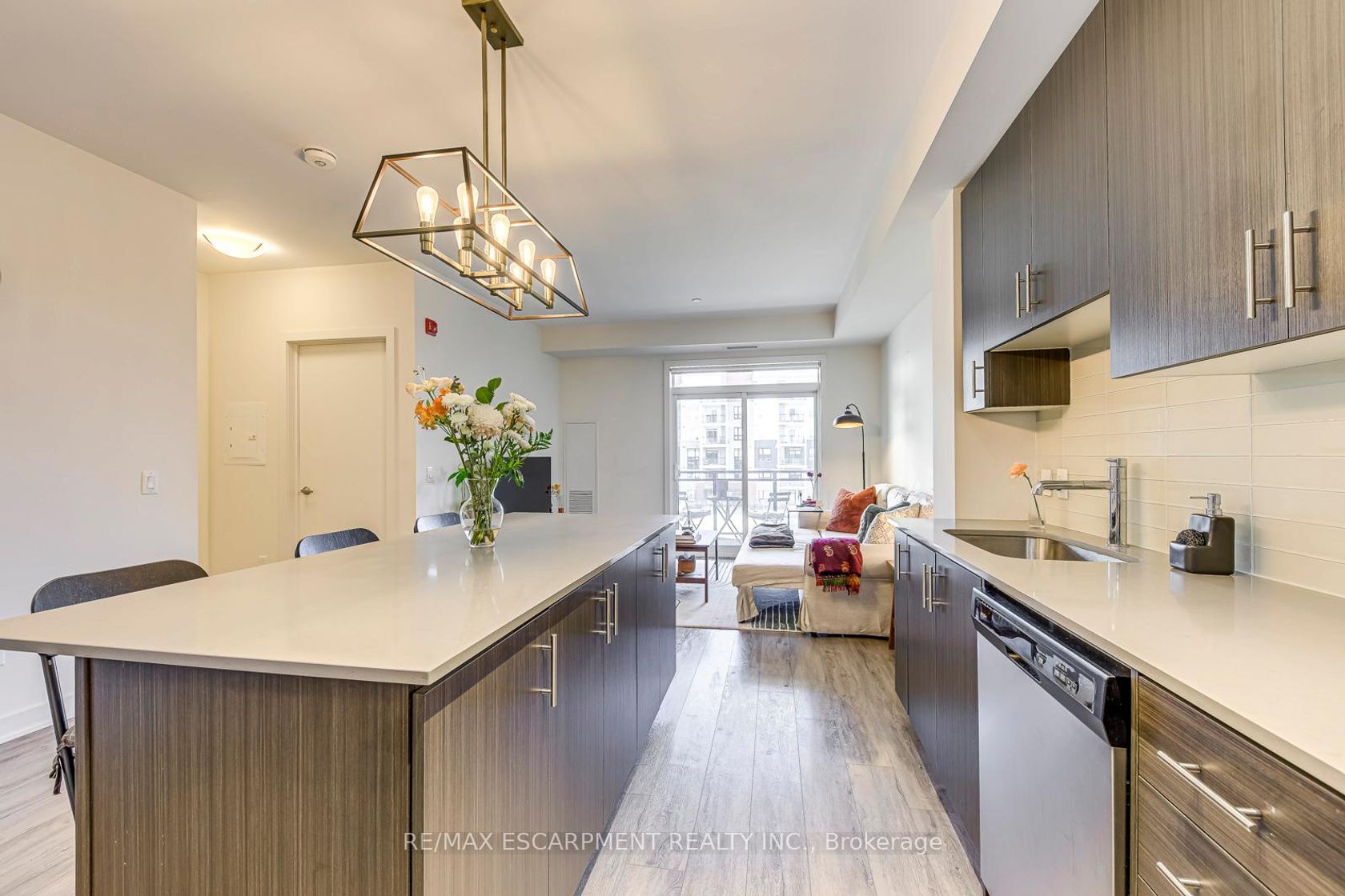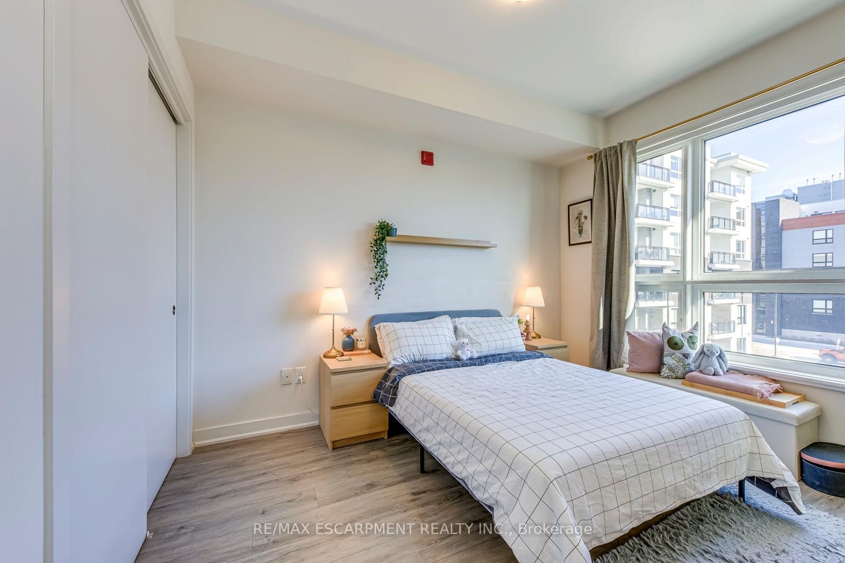 Luxury living with breathtaking views at the Rosehaven built "Affinity" Condos! Experience modern elegance in this sun filled, bright and spacious 1 Bedroom + Den suite, beautifully appointed with premium laminate flooring and designer lighting throughout. The open-concept layout features a chef inspired kitchen with quartz counters, contemporary backsplash, large sink, and gorgeous island - truly an Entertainers delight. Enjoy morning coffee from your private balcony overlooking peaceful greenery, a true extension of living space. The primary bedroom includes a double door closet and boasts large windows, filling the space with natural light. The spa-inspired bathroom offers a built in vanity with plenty of storage and a beautifully tiled tub/shower combination for your relaxation. The versatile den provides ample space for a home office, hobby area, or reading nook-ideal for today's lifestyle. Residents enjoy award-winning amenities including a rooftop terrace with breathtaking views, fitness centre, party room, and much more. **EXTRAS** Premium Parking and Premium Locker included. Pride of ownership - this unit truly impresses! Prime Location with steps to shopping, schools, restaurants, transit, and minutes to highways and Aldershot GO. Location Location Location!