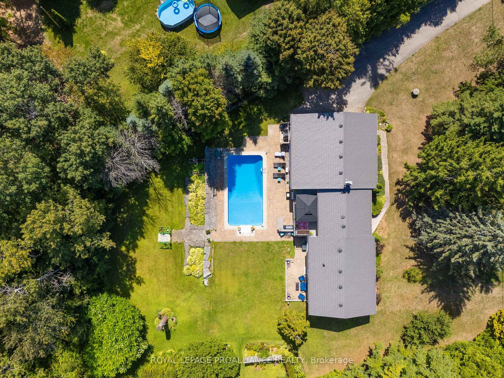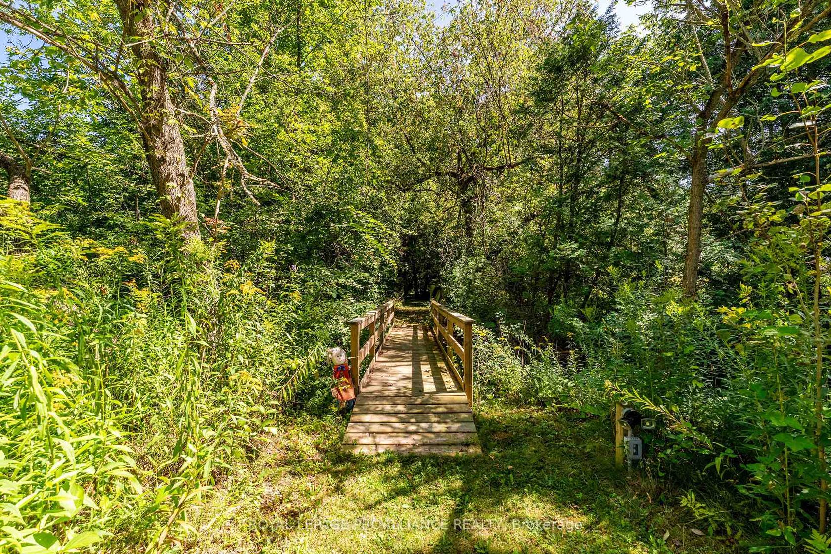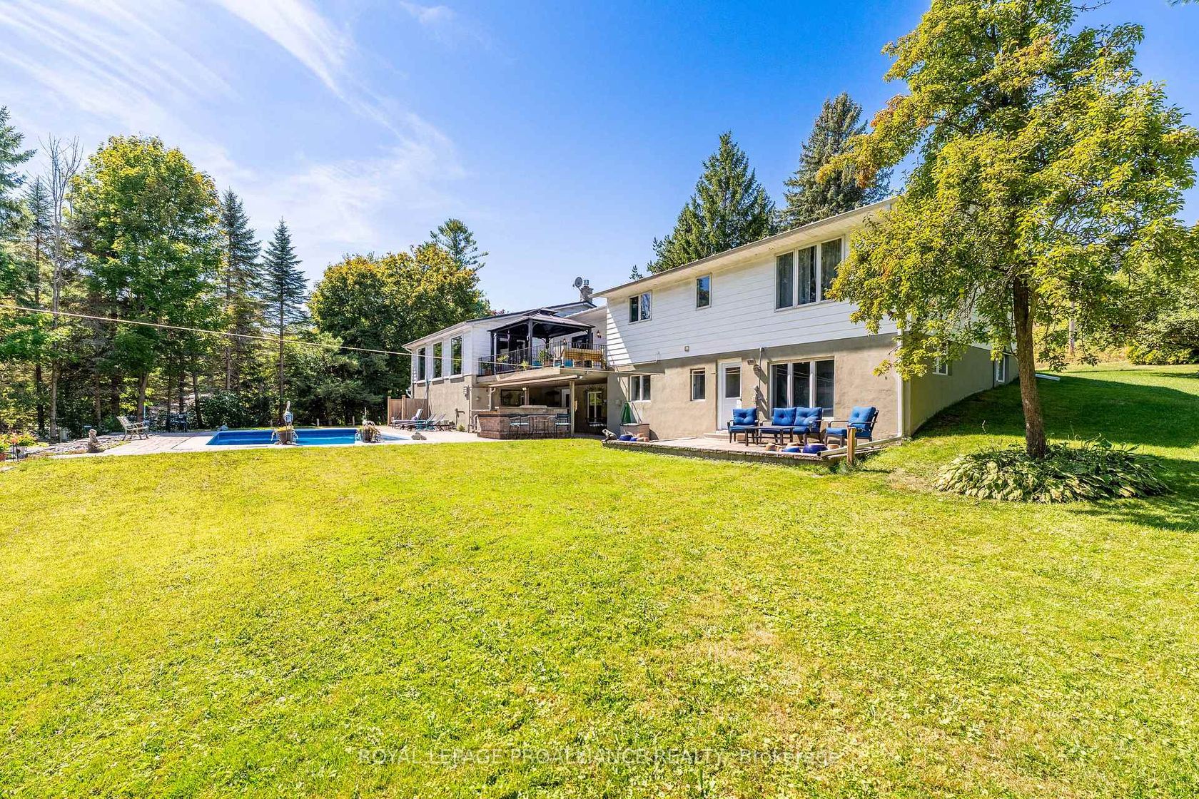 This extraordinary 2,584 sq. ft. bungalow is set on a private 1.87-acre lot, offering a rare combination of space, elegance, and lifestyle. The backyard is a true oasis with an inground pool, hot tub, interlock stone patio, Armour stone accents, and an outdoor kitchen an entertainers dream. A winding trail takes you through the trees to a charming bridge over a creek and a sunlit clearing, perfect for gatherings or quiet escapes. Inside, the home showcases high-end finishes including hardwood and travertine flooring, crown moulding, and a thoughtfully designed open layout. At its heart, the gourmet kitchen features a centre island, granite counters, upgraded cabinetry, stainless steel appliances, and a cozy gas fireplace. Sunlight streams through large windows, with a patio door that opens to the deck overlooking the pool and wooded backdrop. Seamlessly connected to the kitchen, the expansive family and dining area offers vaulted ceilings, floor-to-ceiling windows, and a second gas fireplace. This impressive space is ideal for entertaining while maintaining a warm and inviting feel. The bedroom wing includes three generously sized bedrooms and two updated 4-piece baths, each with luxurious finishes. The lower level adds exceptional versatility with a bright living room and walkout to the pool, an additional bedroom, large rec room, office nook, laundry room, and space for a future kitchenette perfect for an in-law suite or multi-generational living. A rare offering that blends elegance, functionality, and resort-style living, this property is truly a must-see.